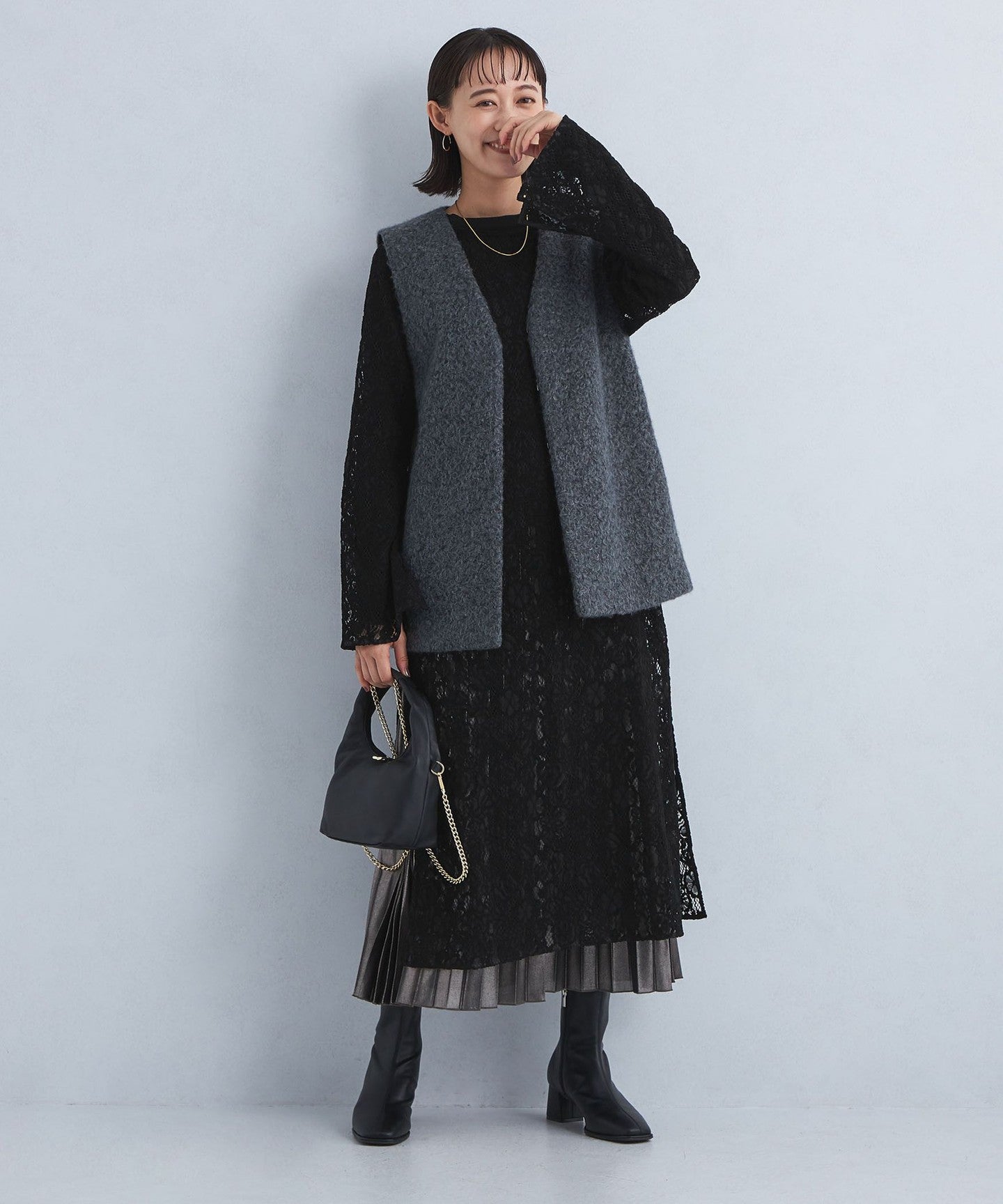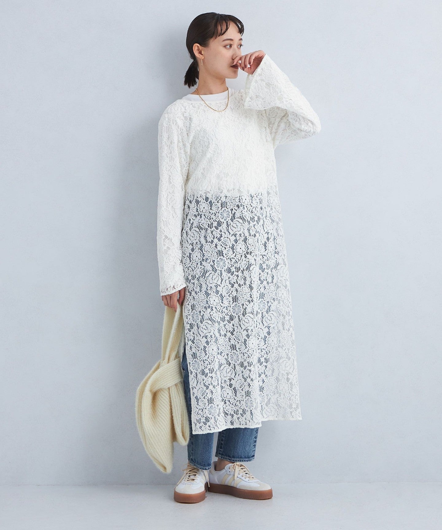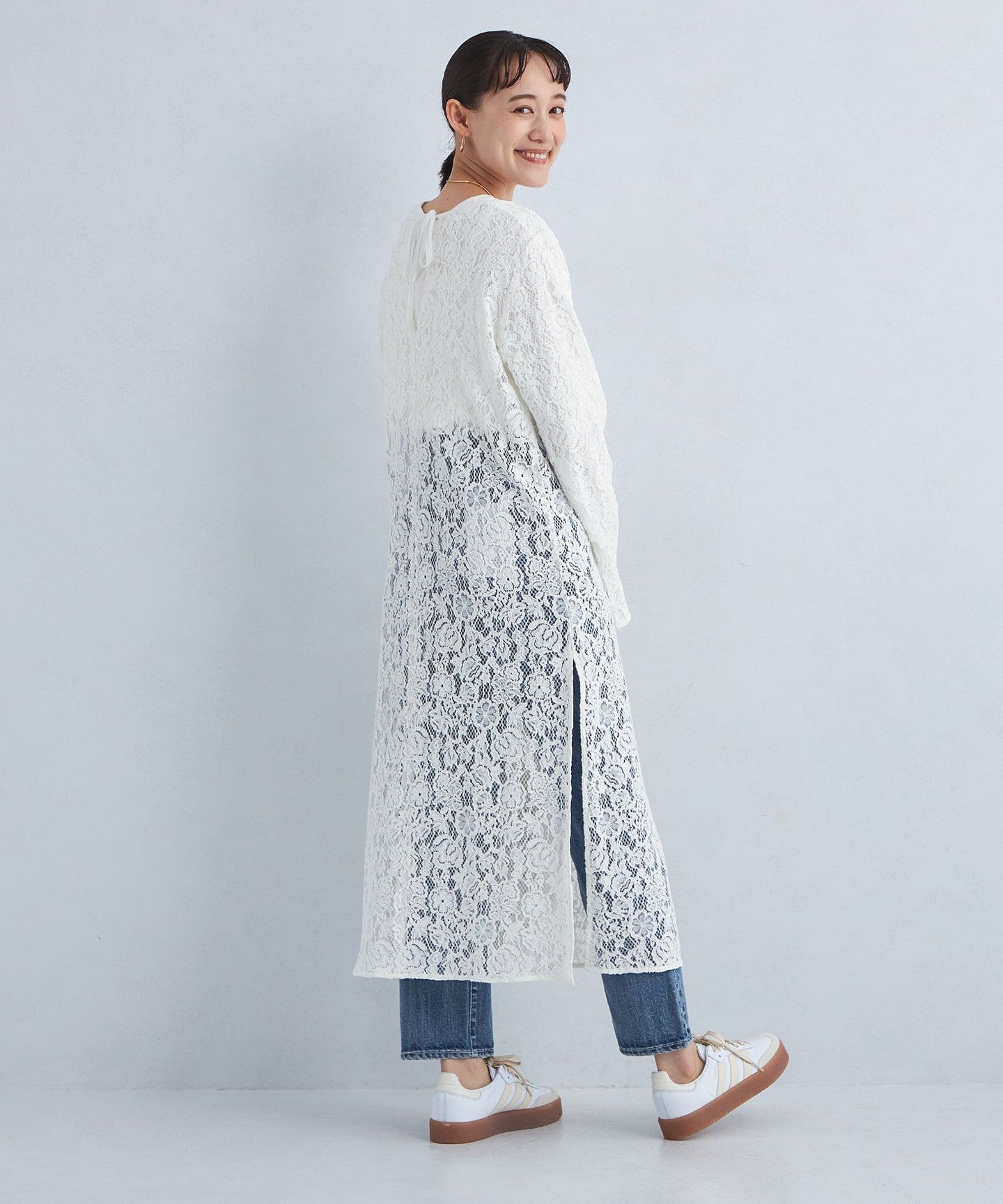 The deep slit design on the side allows you to enjoy layering with bottoms.