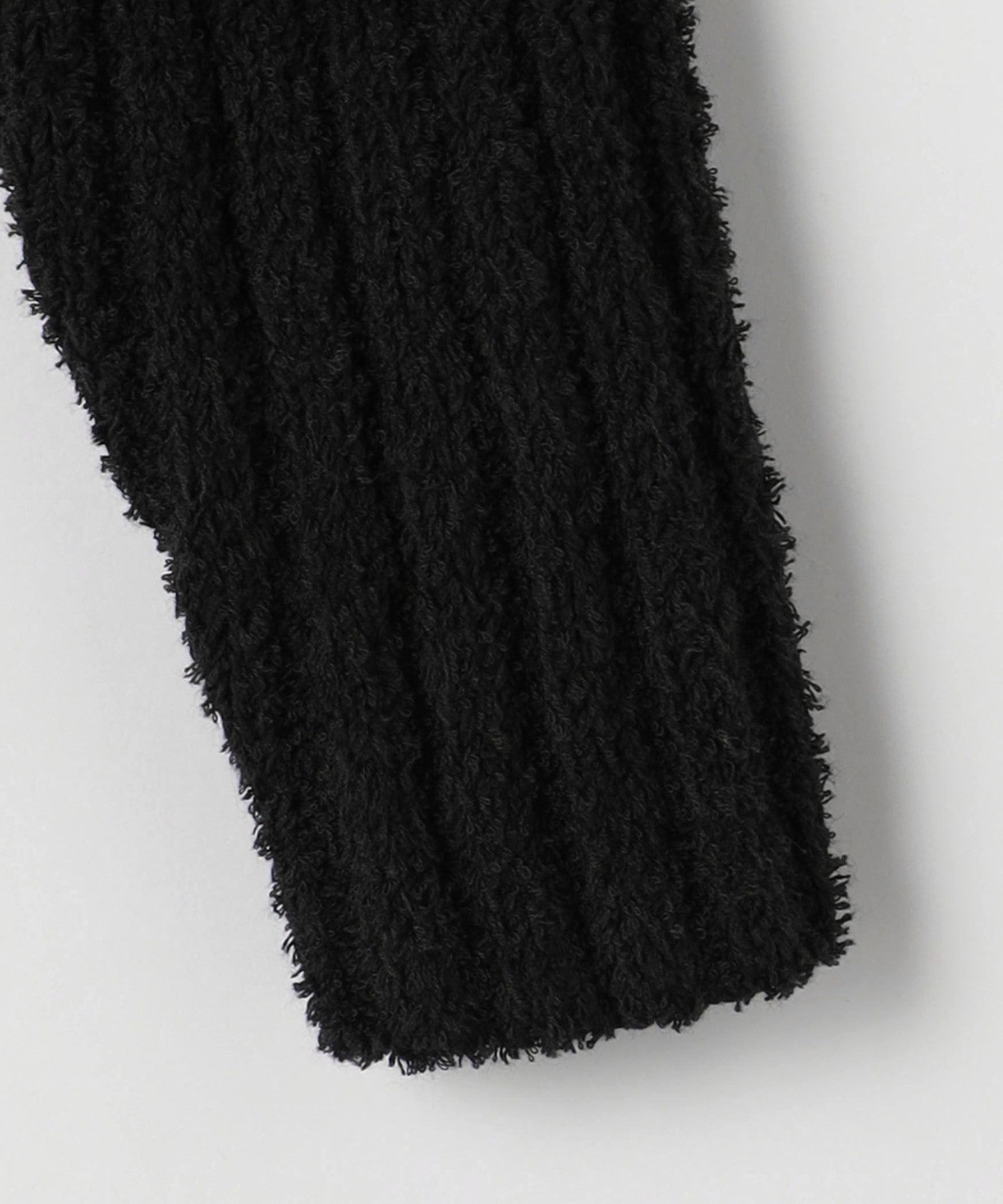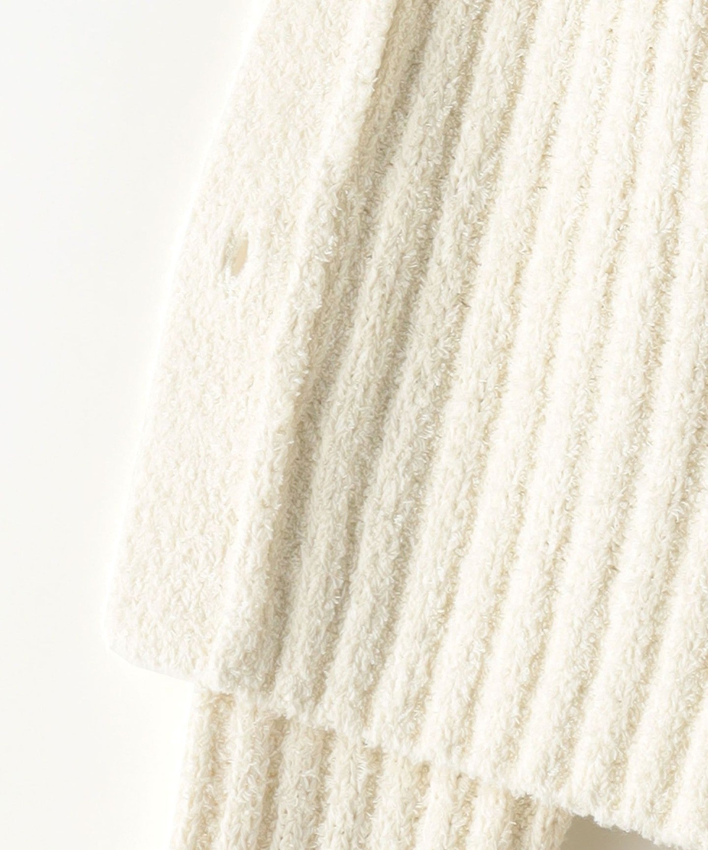 The textured yarn is a mix of fine loops and tape-like yarns, knitted in a coarse gauge, and the surface is further textured by ribbing.