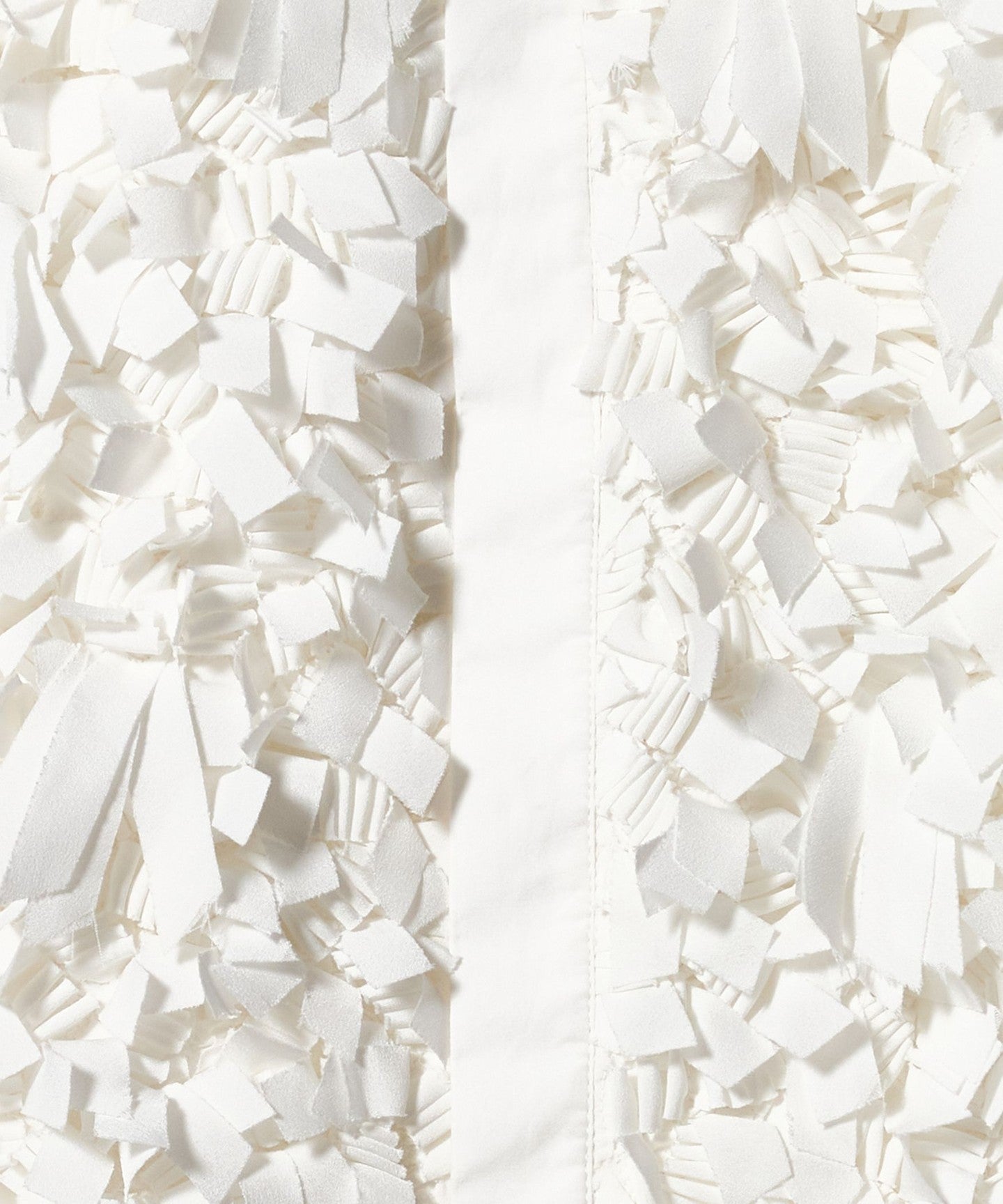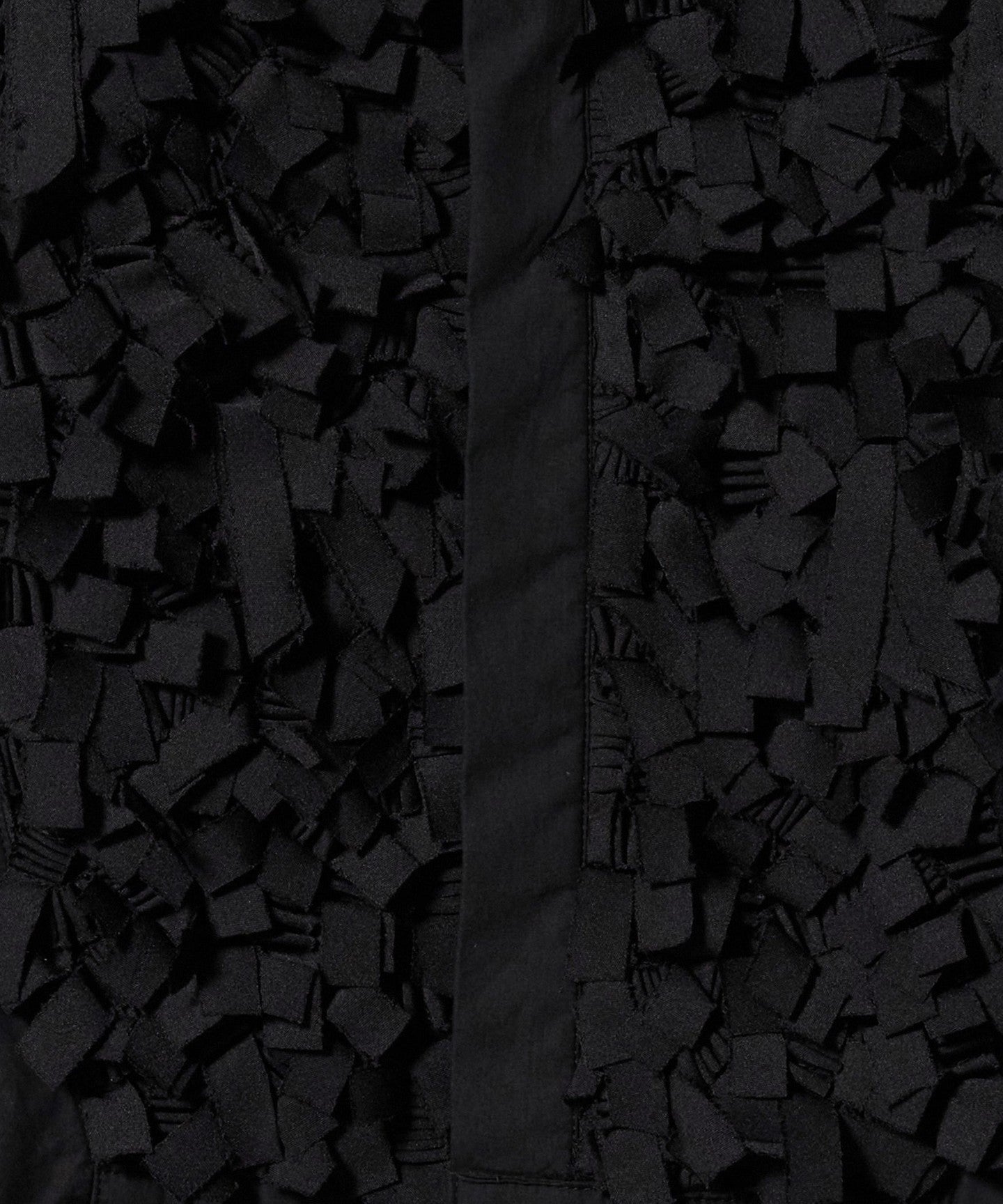The embroidery on the front of the dress is created by cutting off pieces of fabric into tape and embroidering them three times.