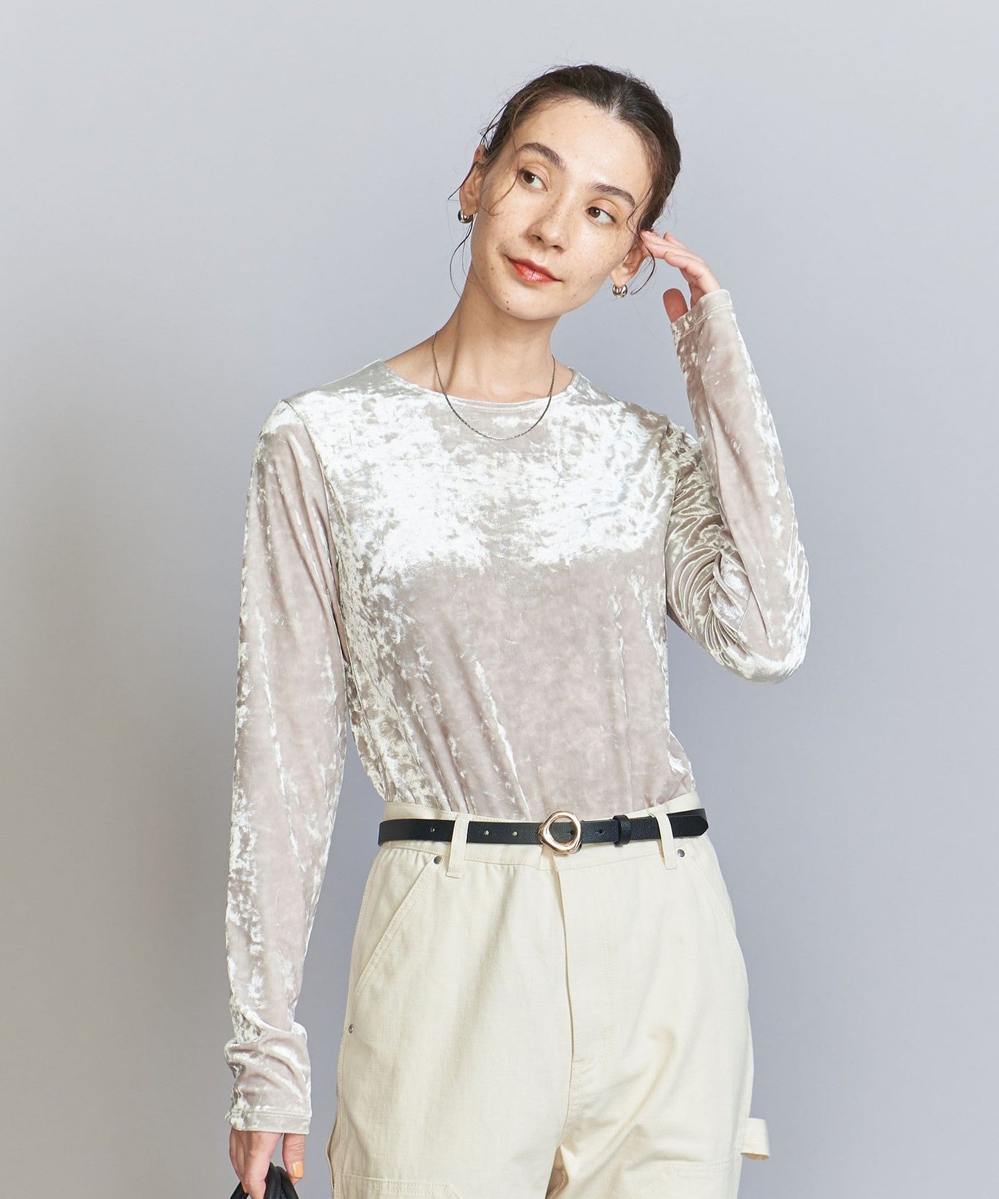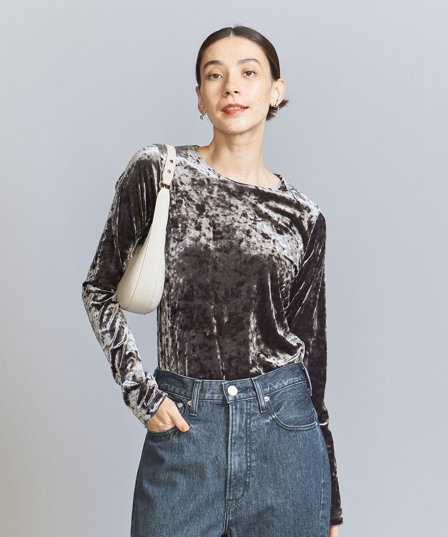 This popular cut-and-sew top is back again this year. A striking long-sleeved T-shirt made with crushed velour.