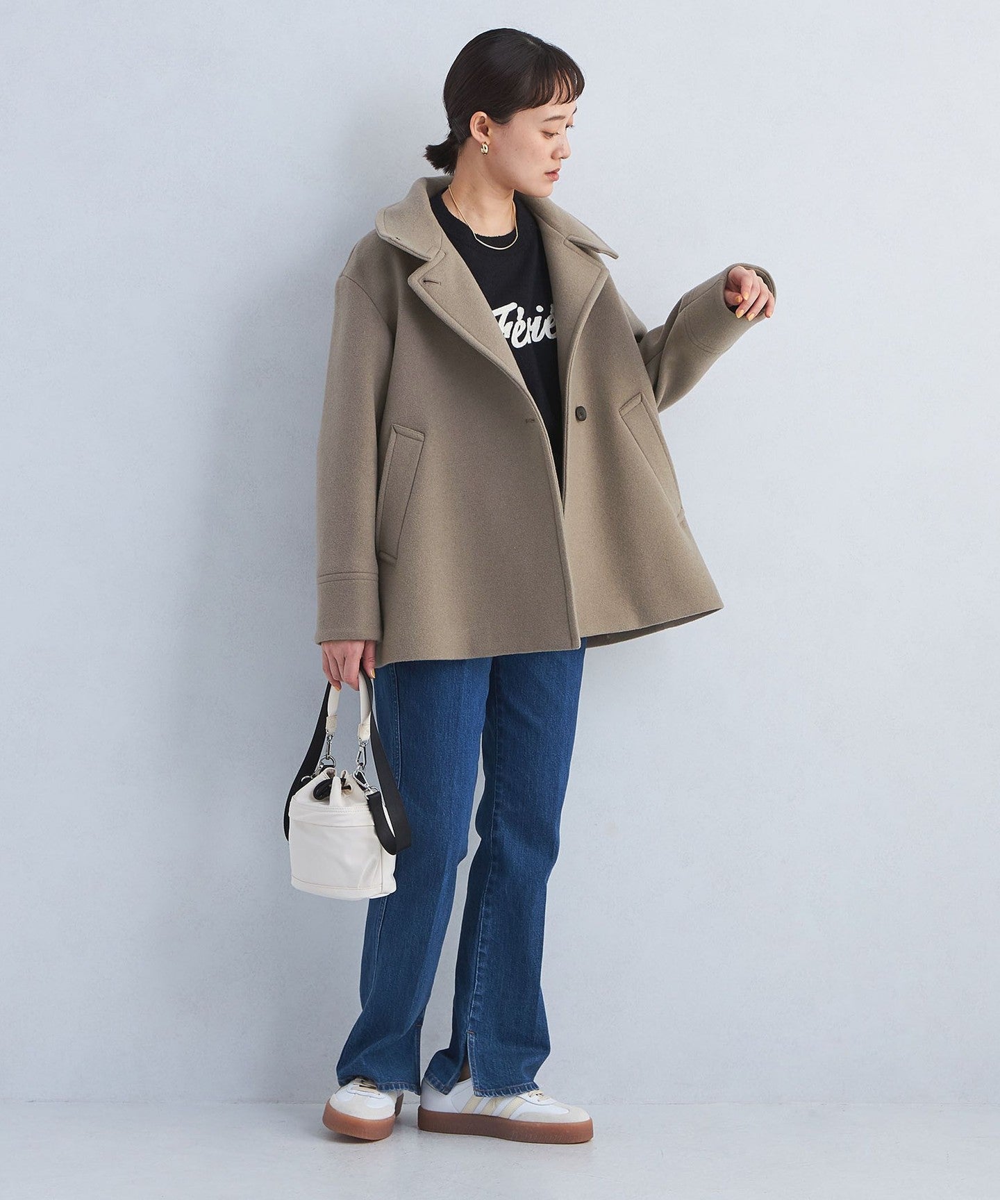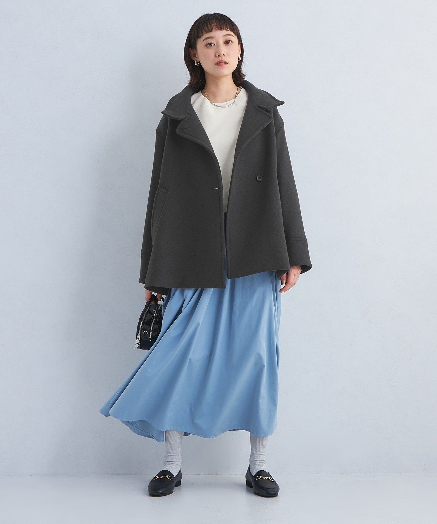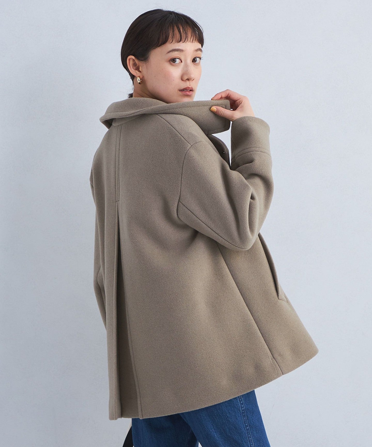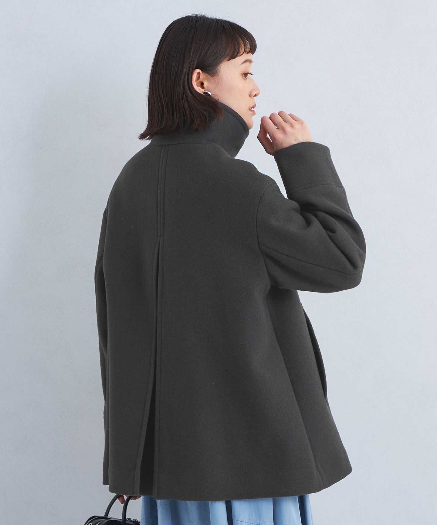 Our popular mid-length coat with a stand-up collar design is now available in a new material!