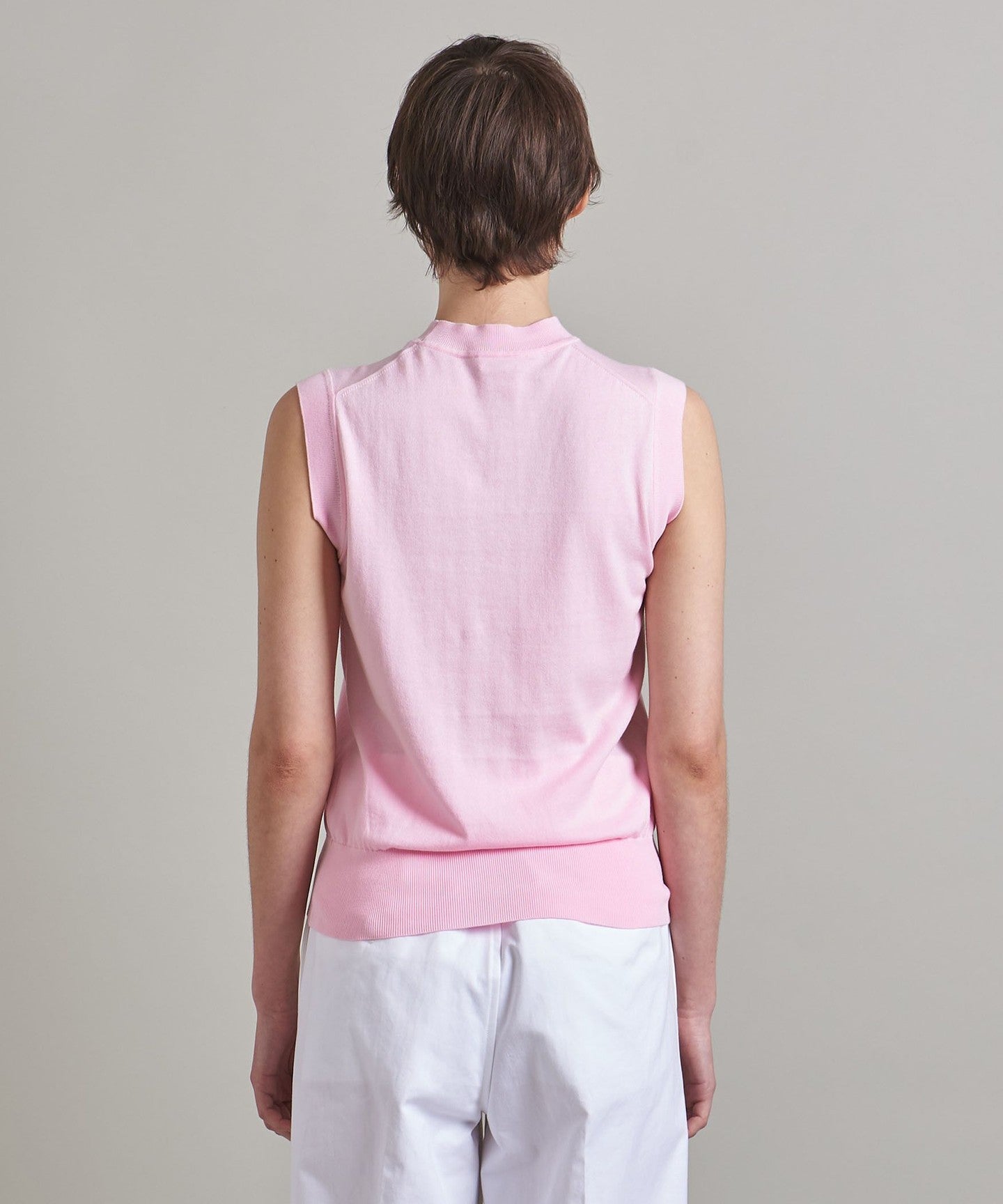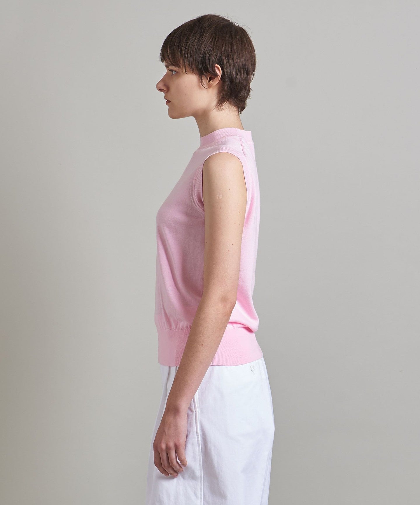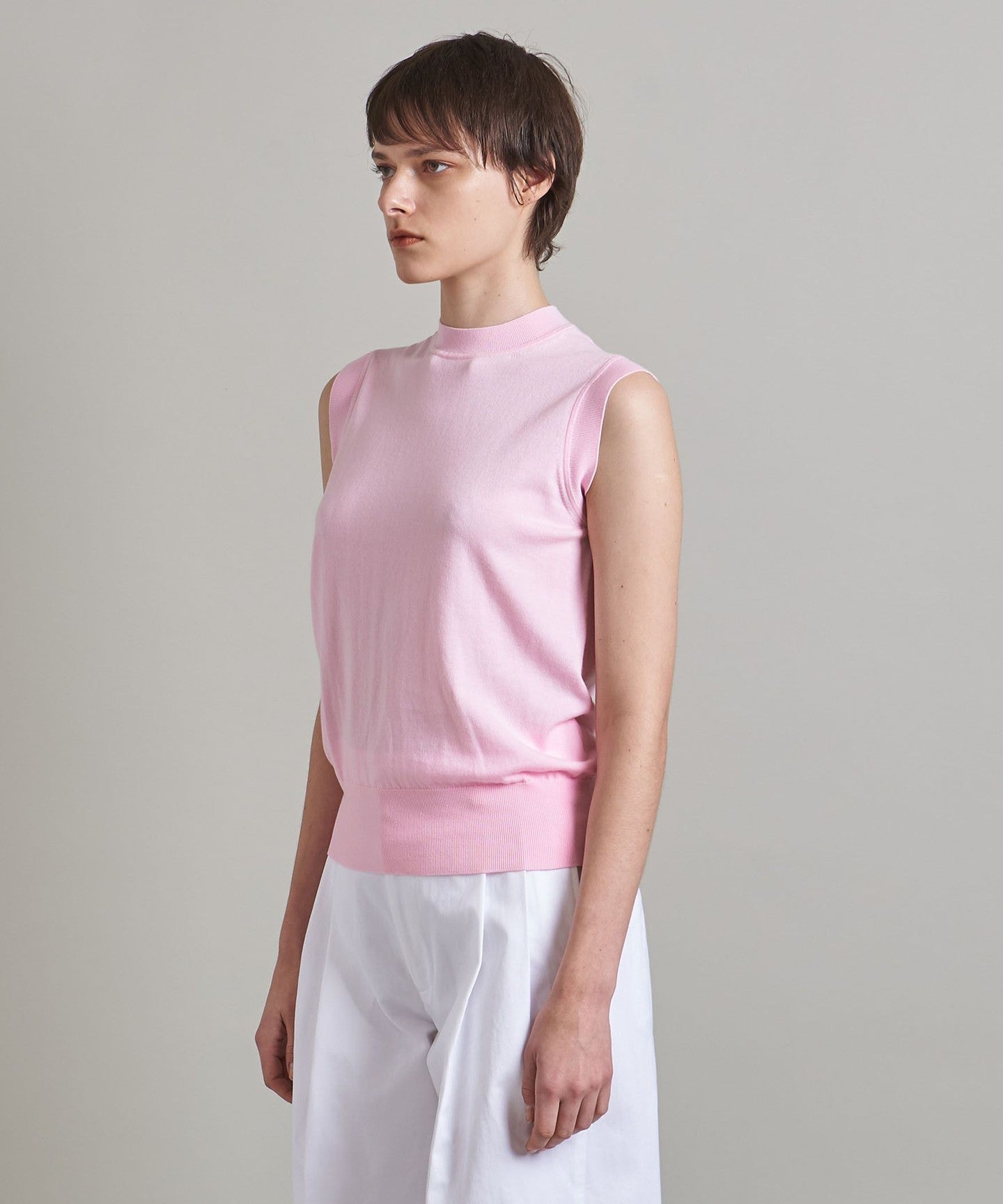 A classic sleeveless knit with a tight, mock neckline and a clean body.