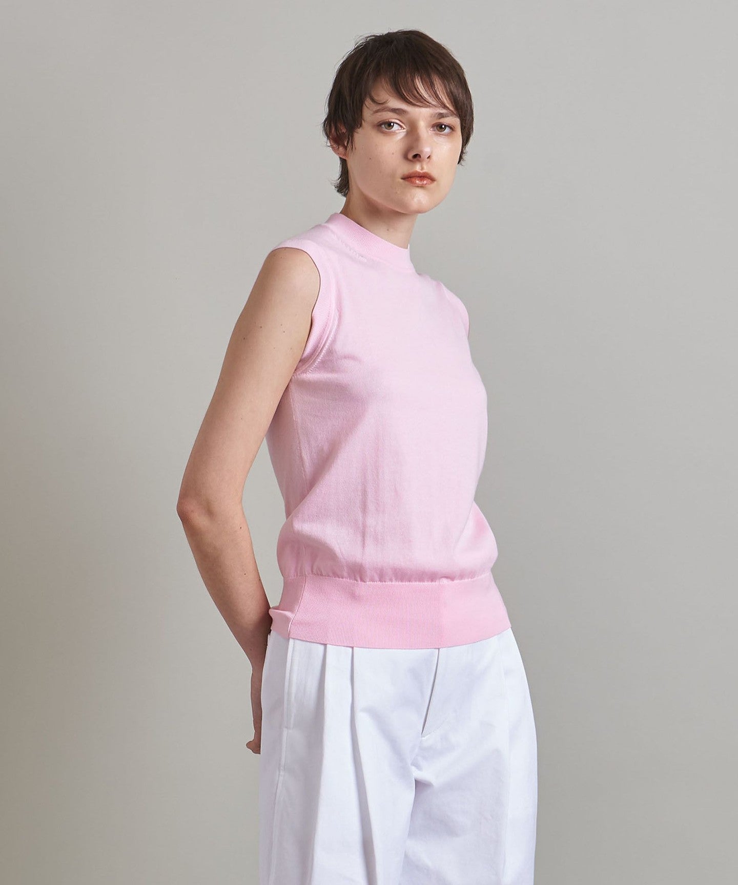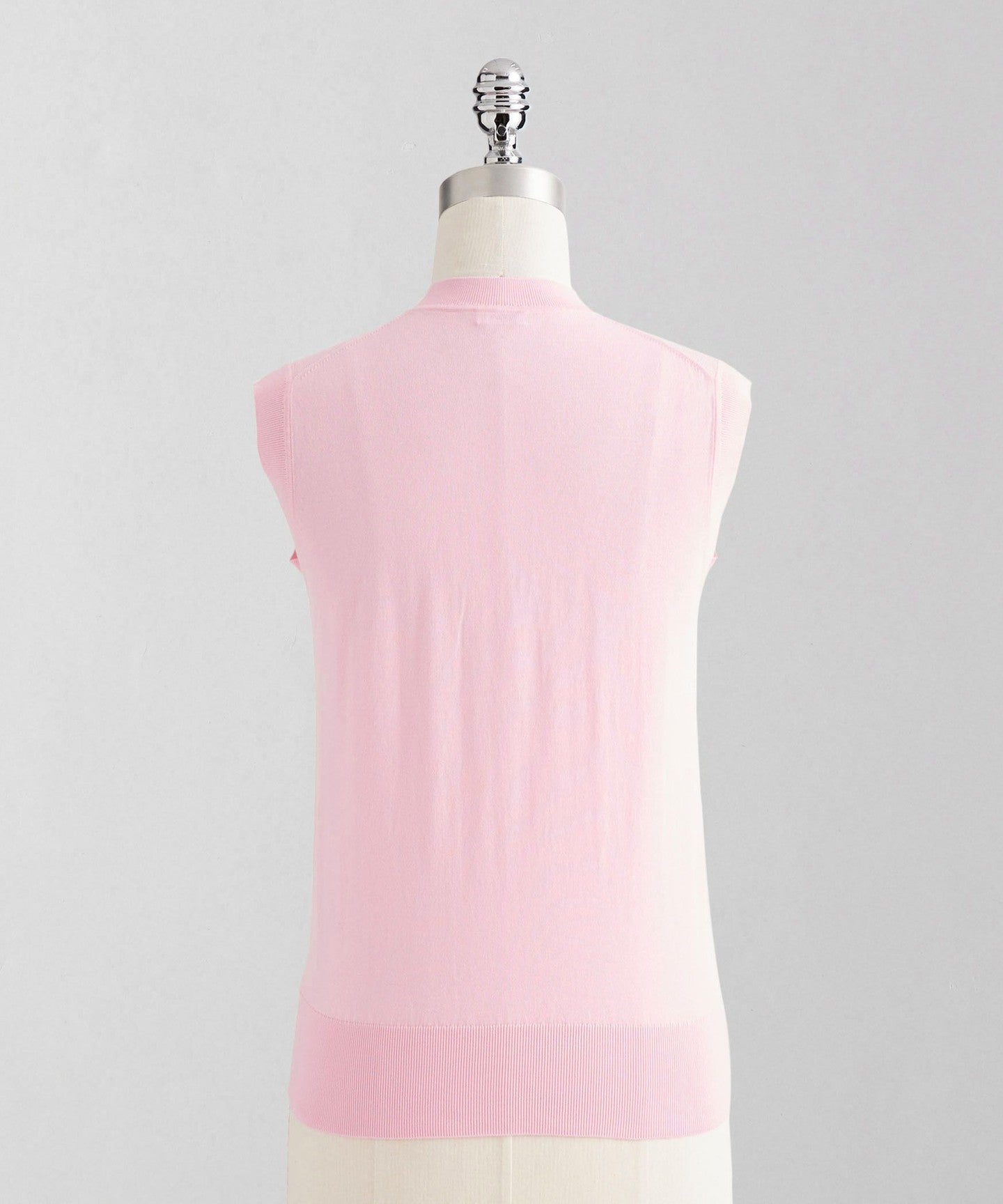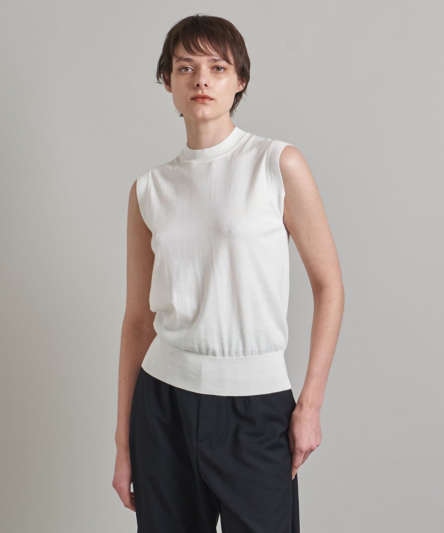 A classic sleeveless knit with a tight, mock neckline and a clean body.
