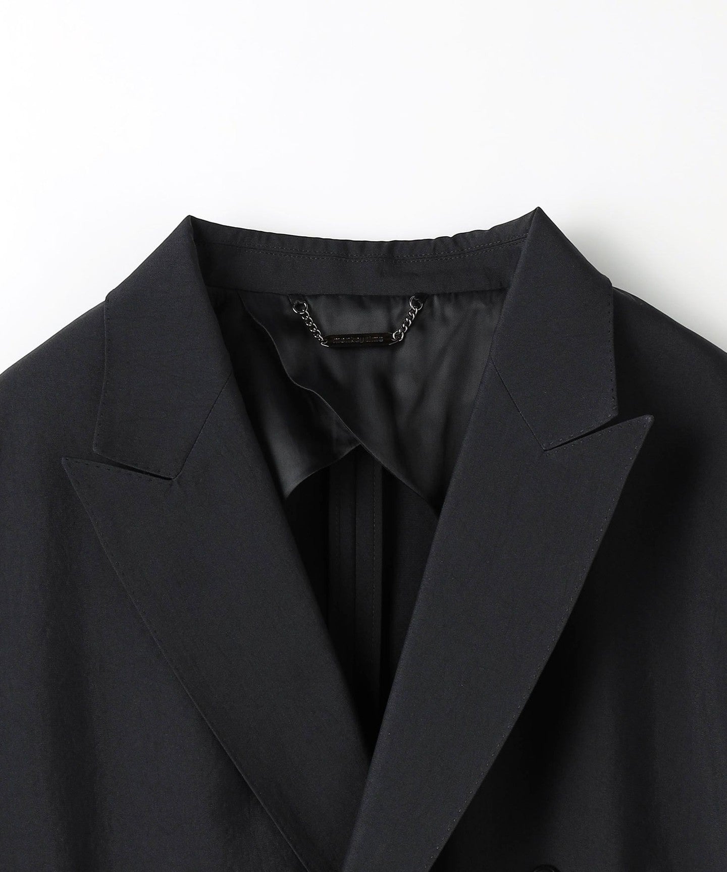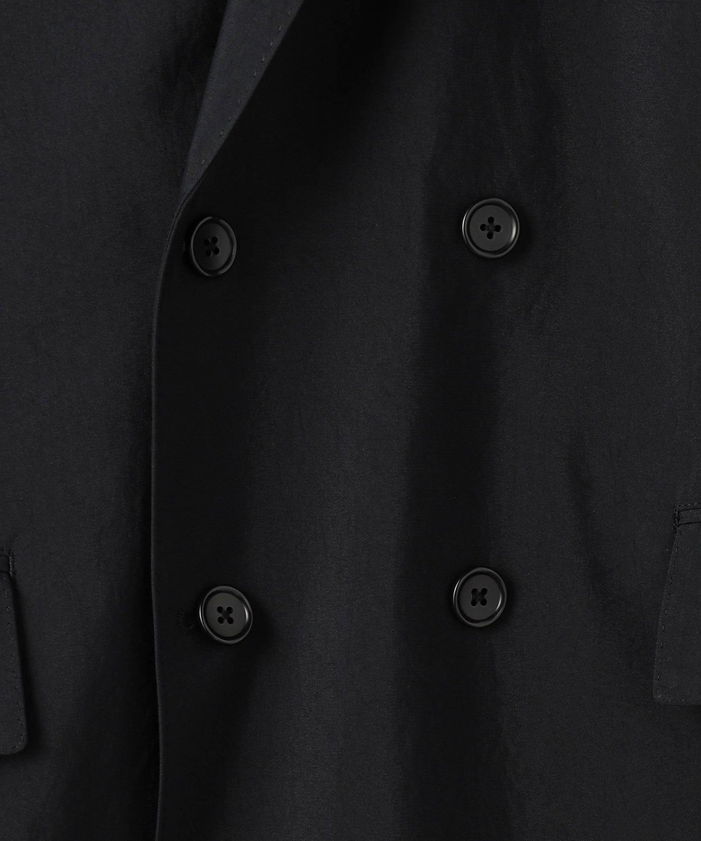 An oversized double-breasted jacket made of back satin fabric woven with polyester thread.