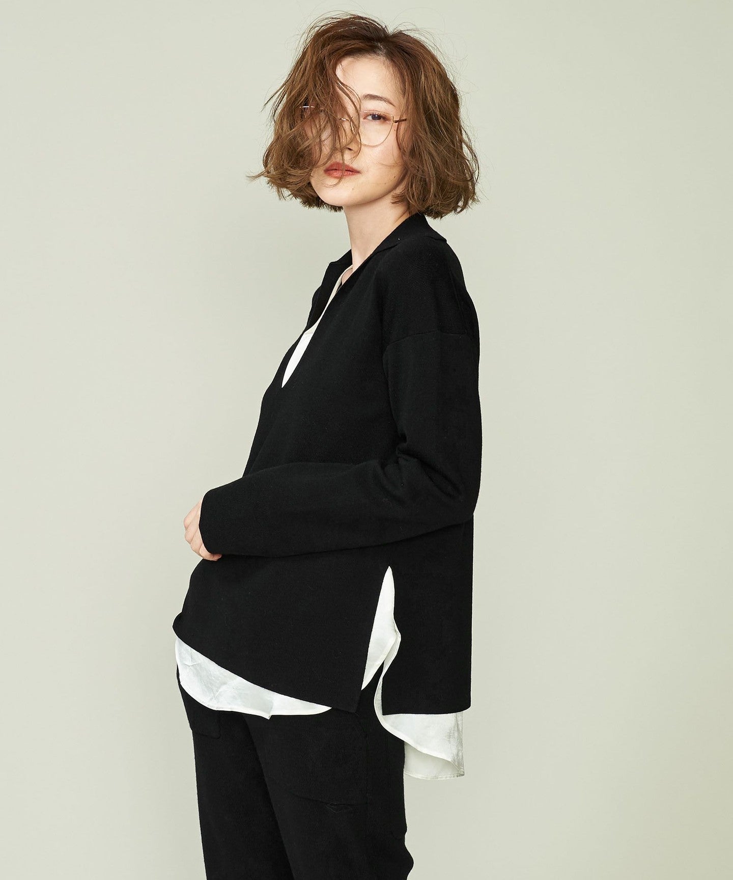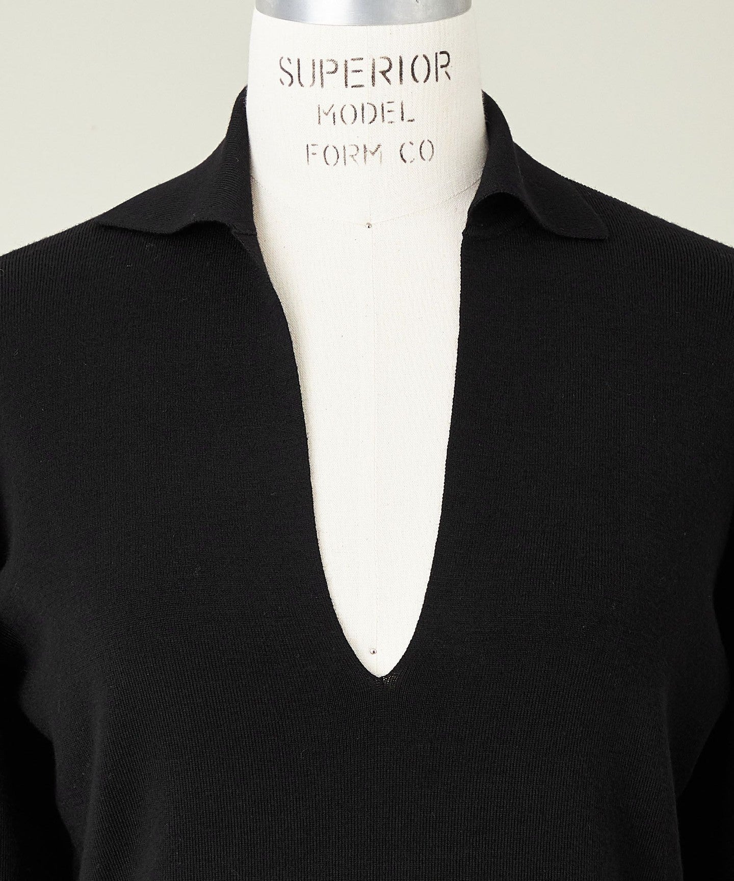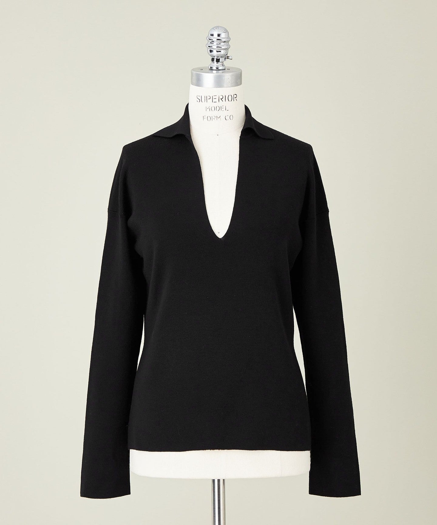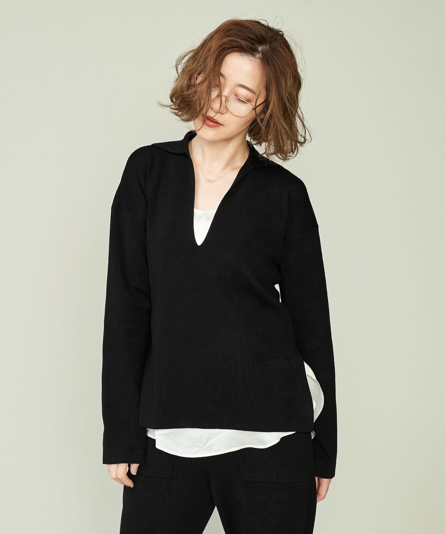 This skipper knit features a V-neck and side slits, but has a simple finish with no ribbing at the hem or sleeves.