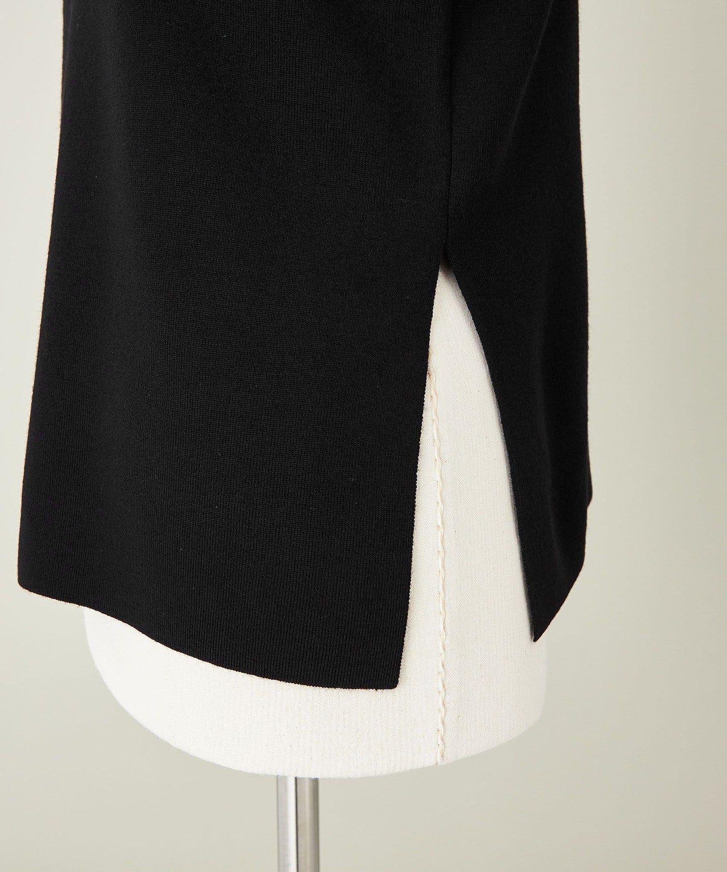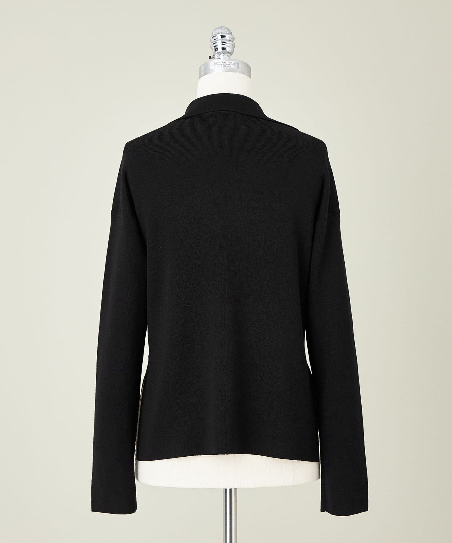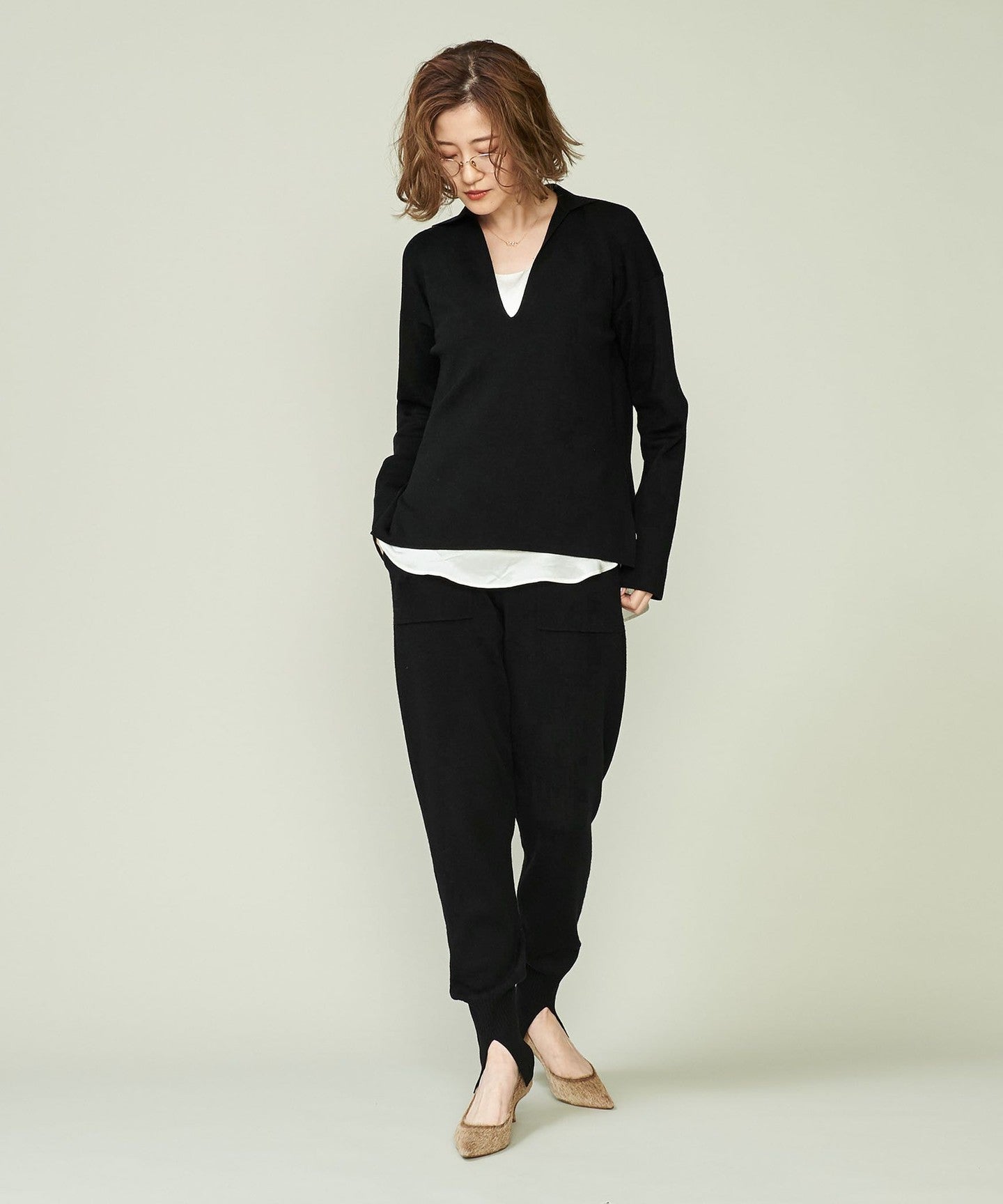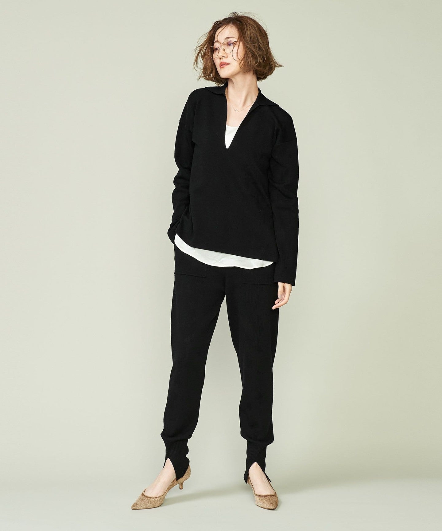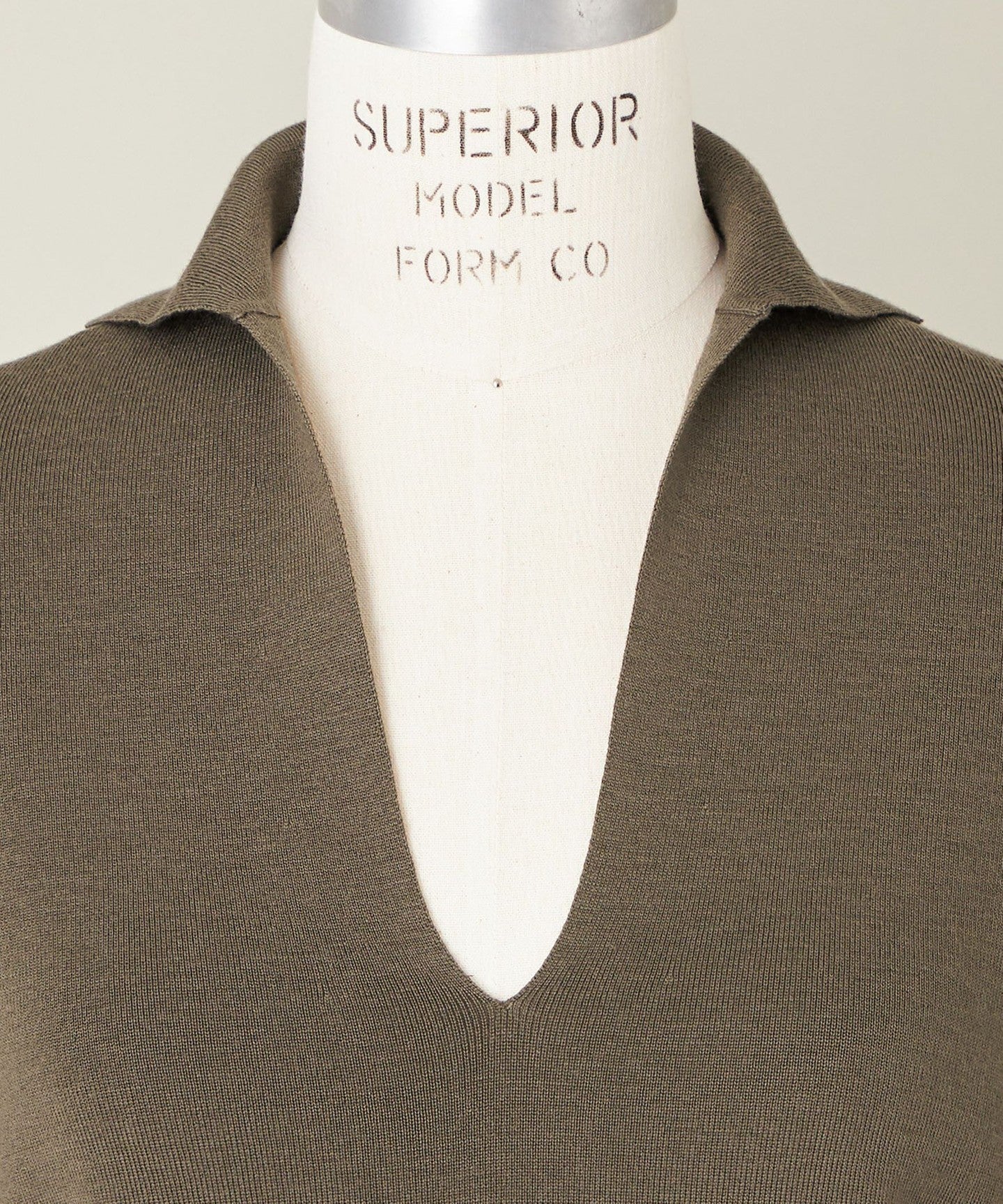 This skipper knit features a V-neck and side slits, but has a simple finish with no ribbing at the hem or sleeves.