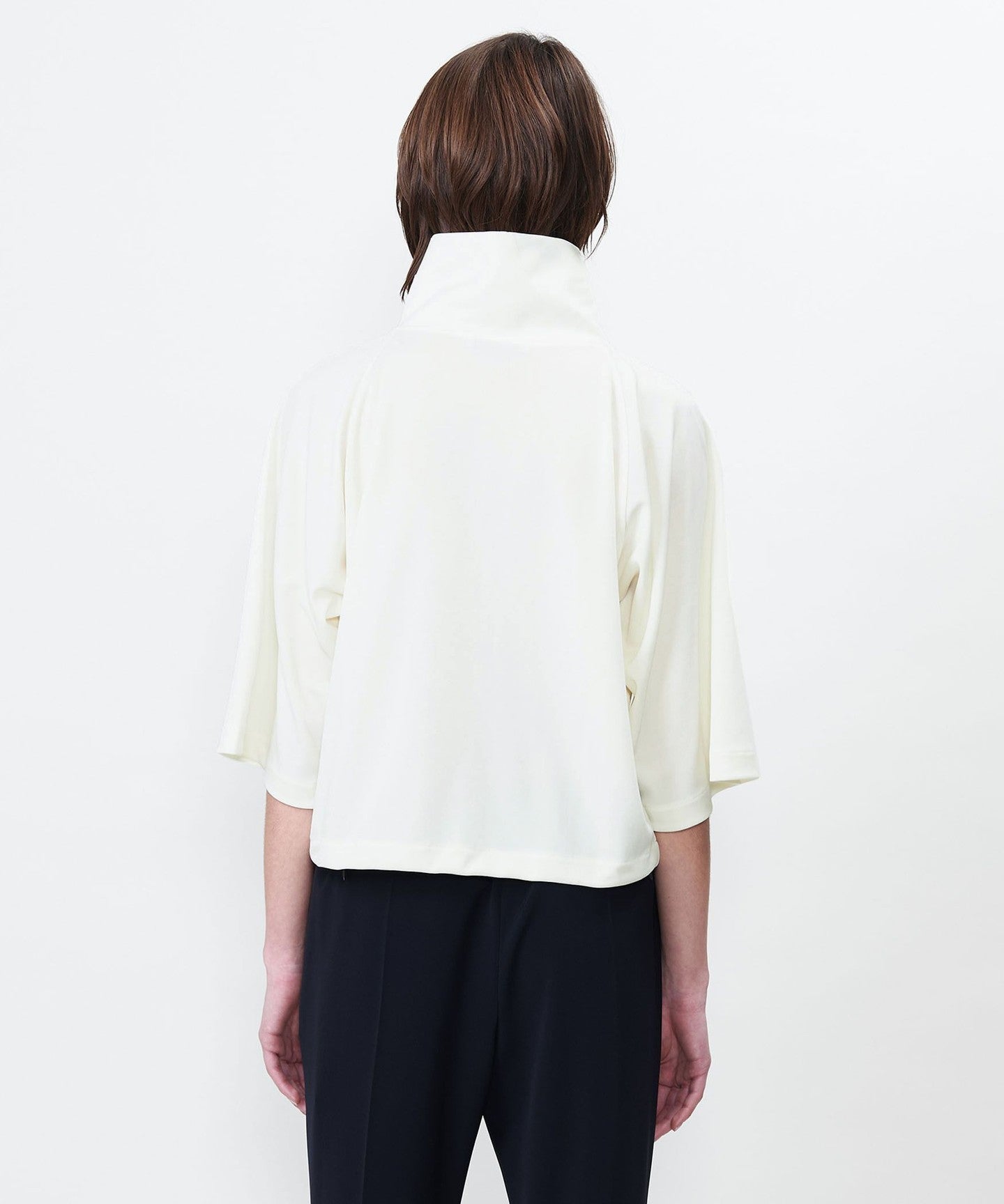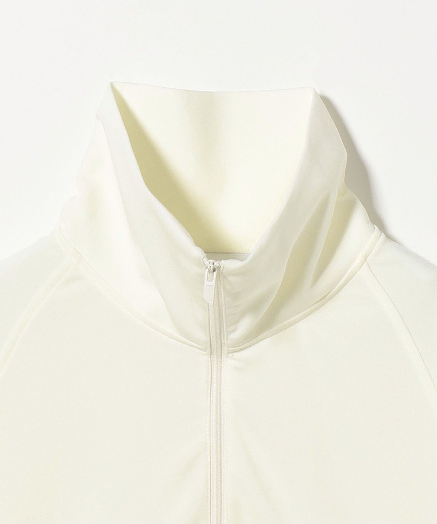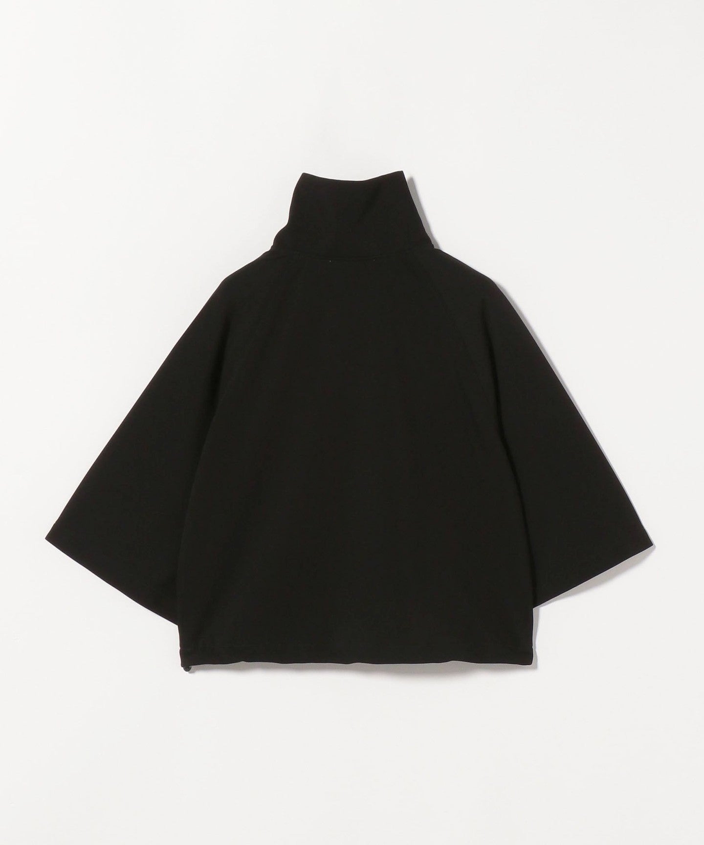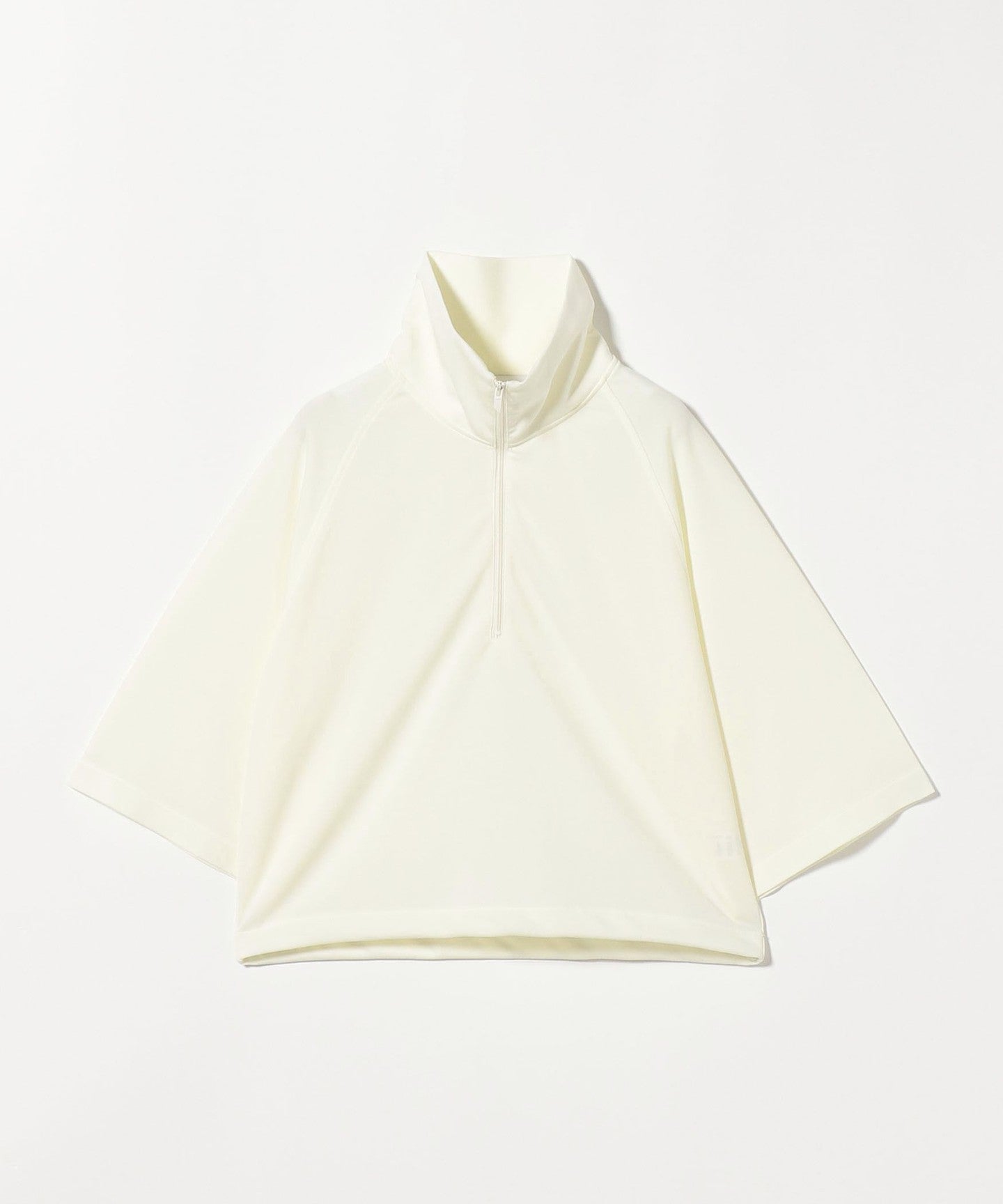 A raglan sleeve cut-and-sew with a stand collar that gives a clean impression around the neck.