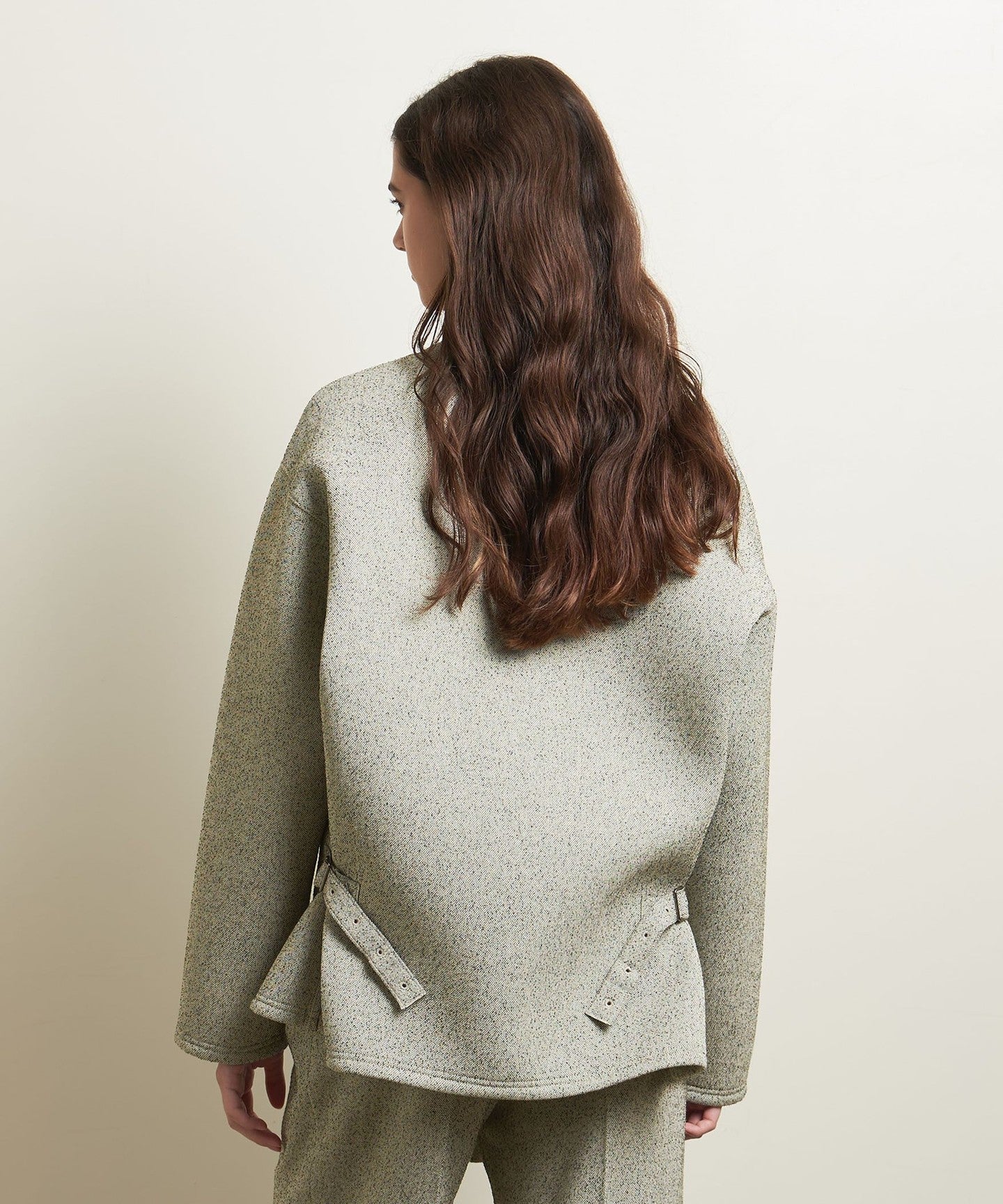A tweed-like cardigan with a fluffy, bulky silhouette that is perfect for this season.