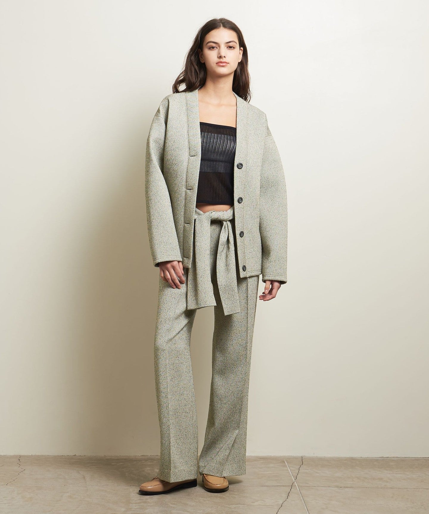 A tweed-like belted cardigan that perfectly balances casual and elegant styles.