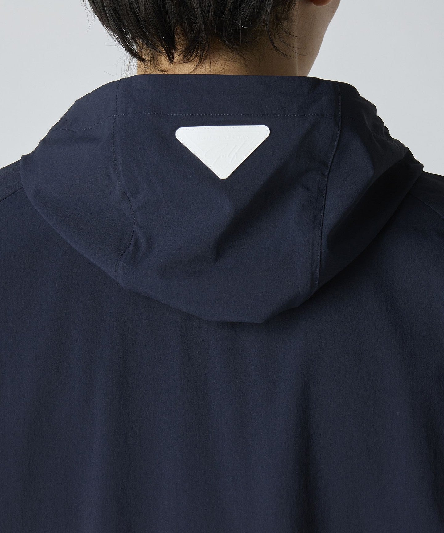 フード後部のワッペンと、背面裾部のブランドロゴがアクセントとして効いています。
