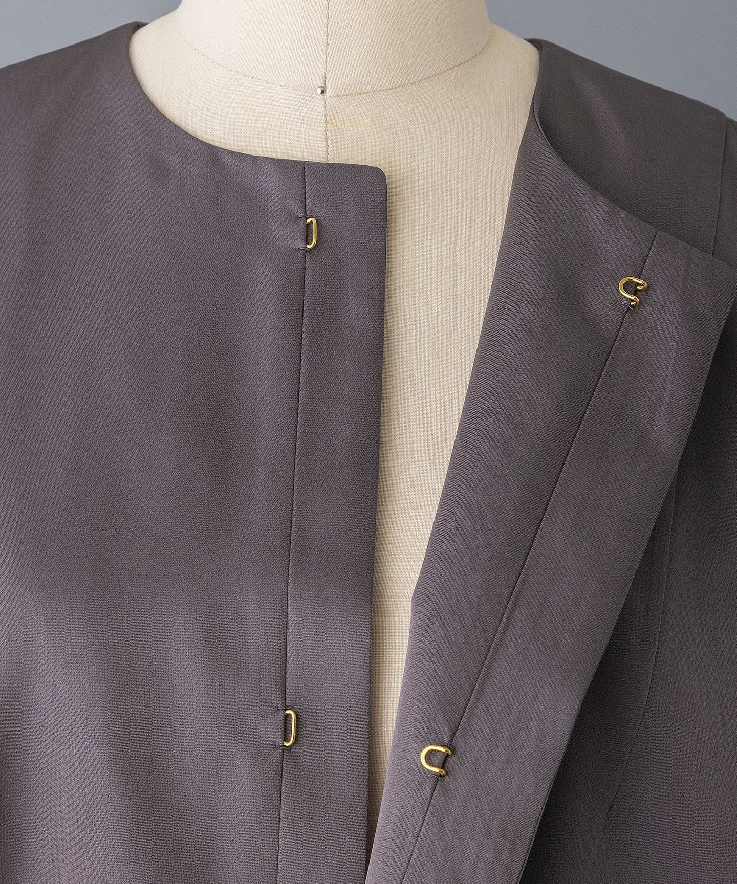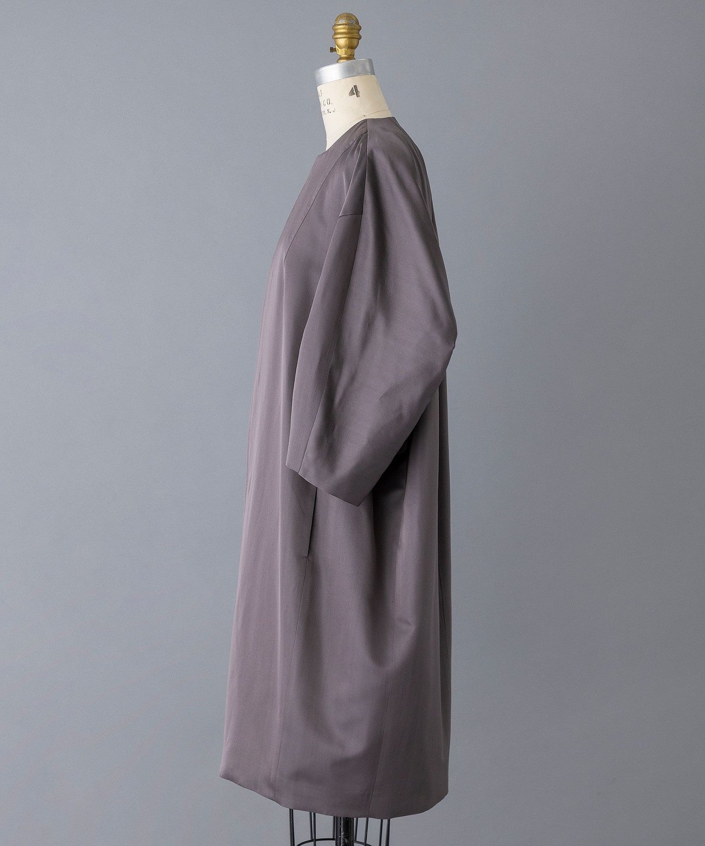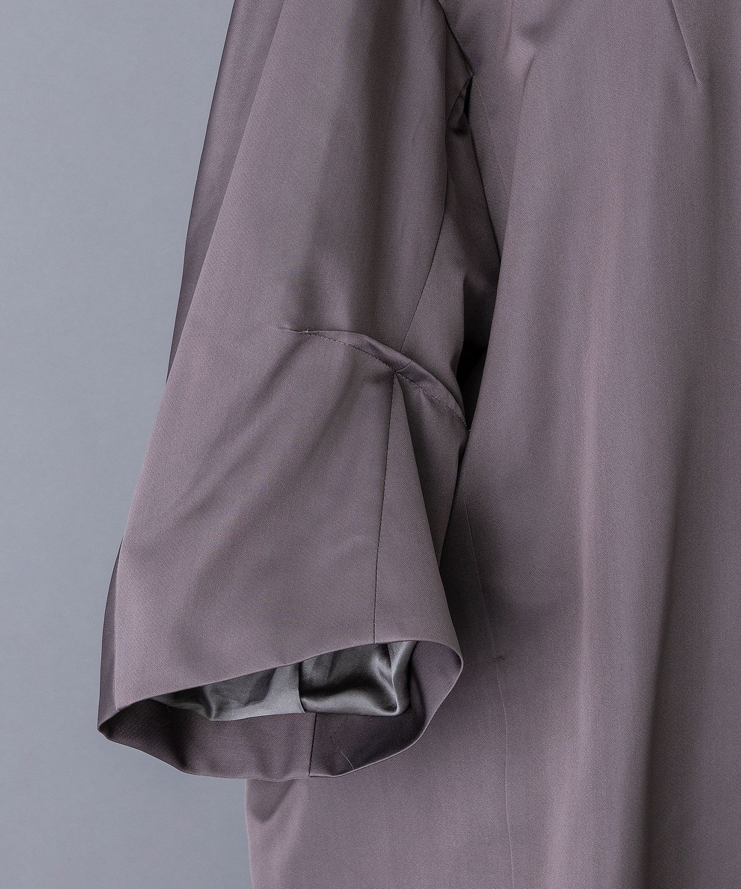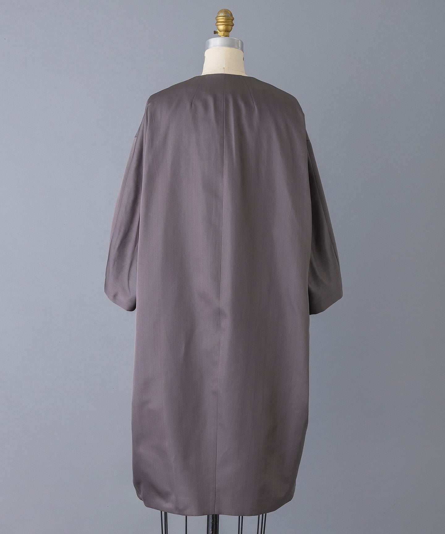 This coat has a cocoon silhouette and is made of slightly lustrous silk material for a dressy look.