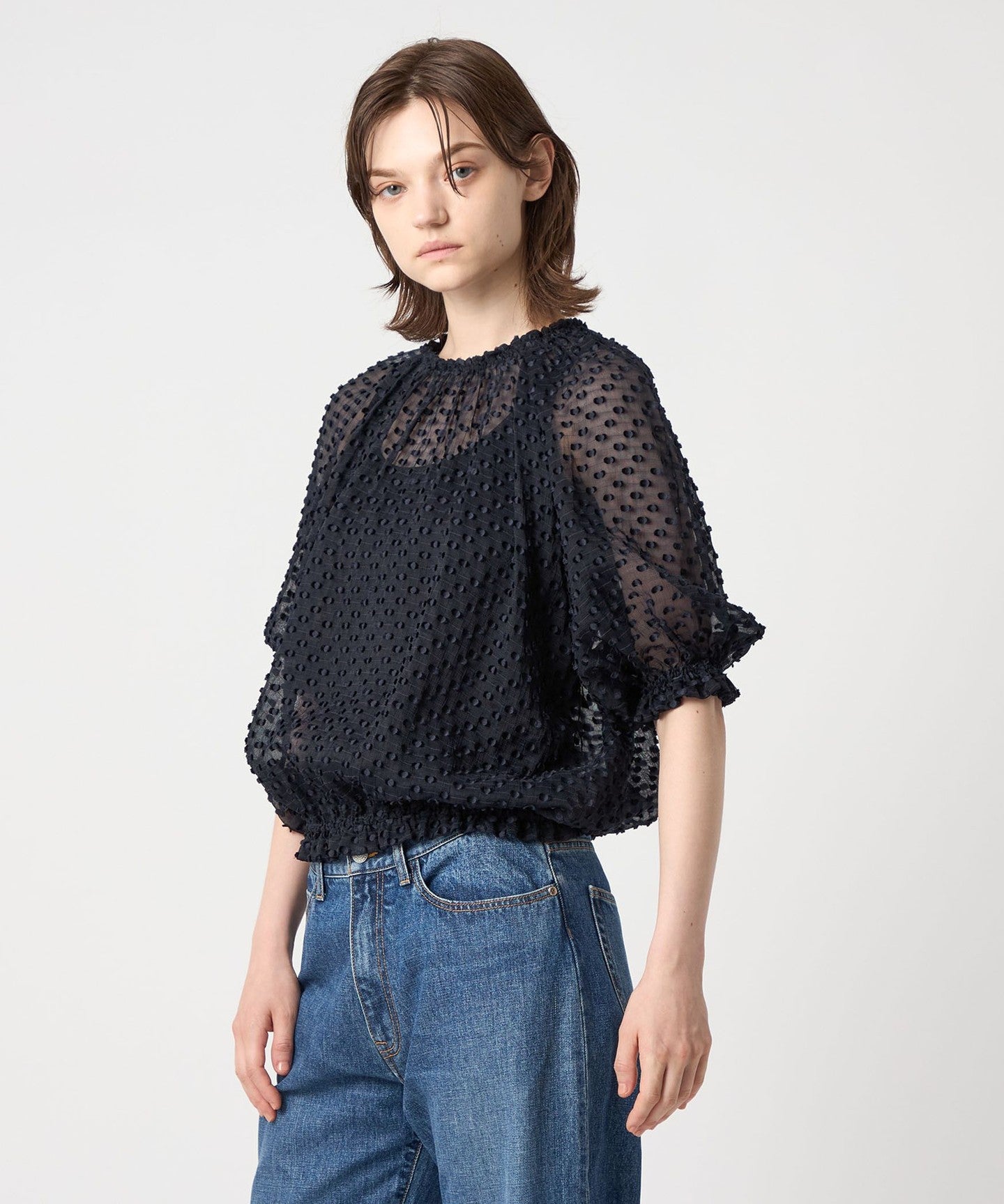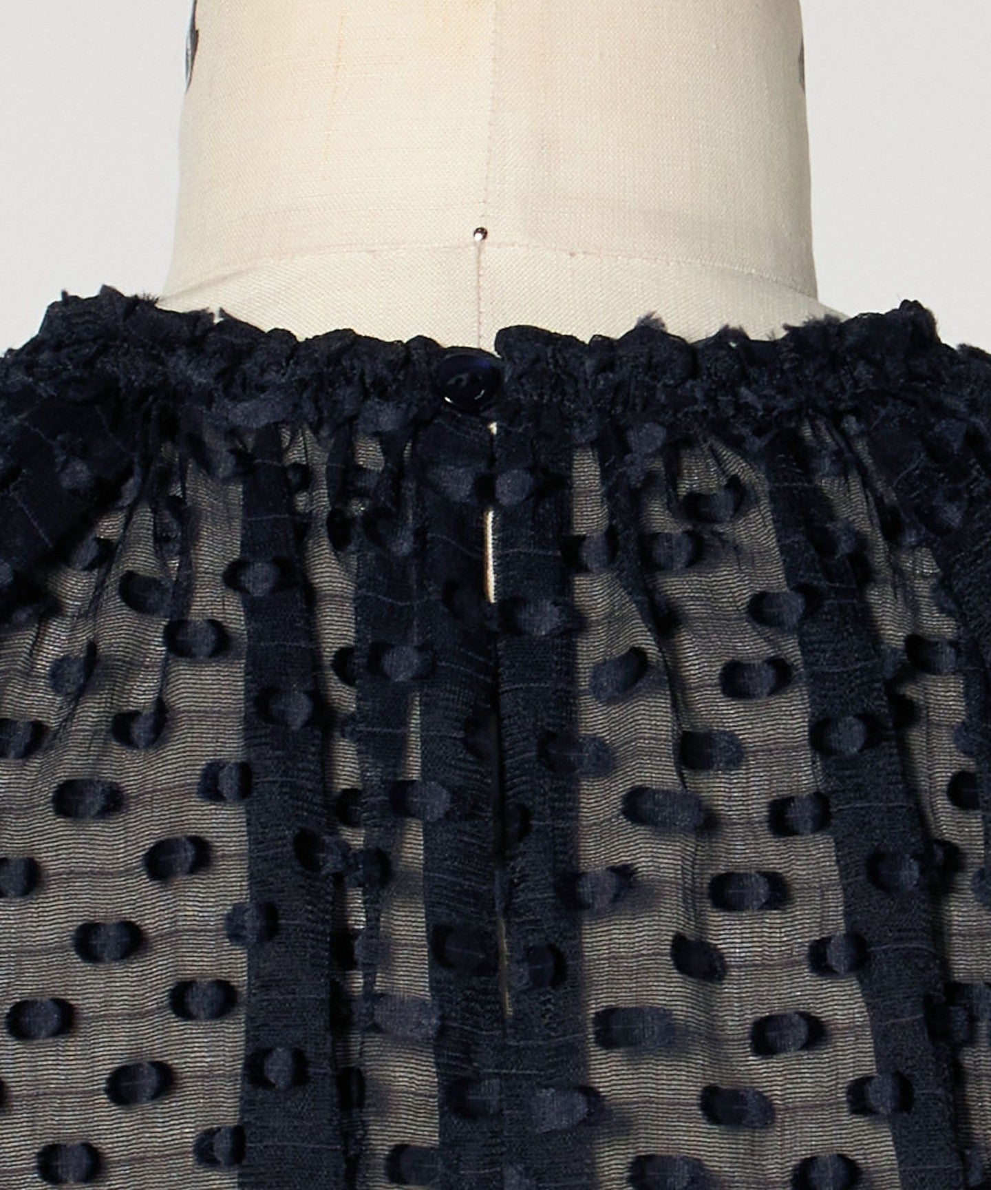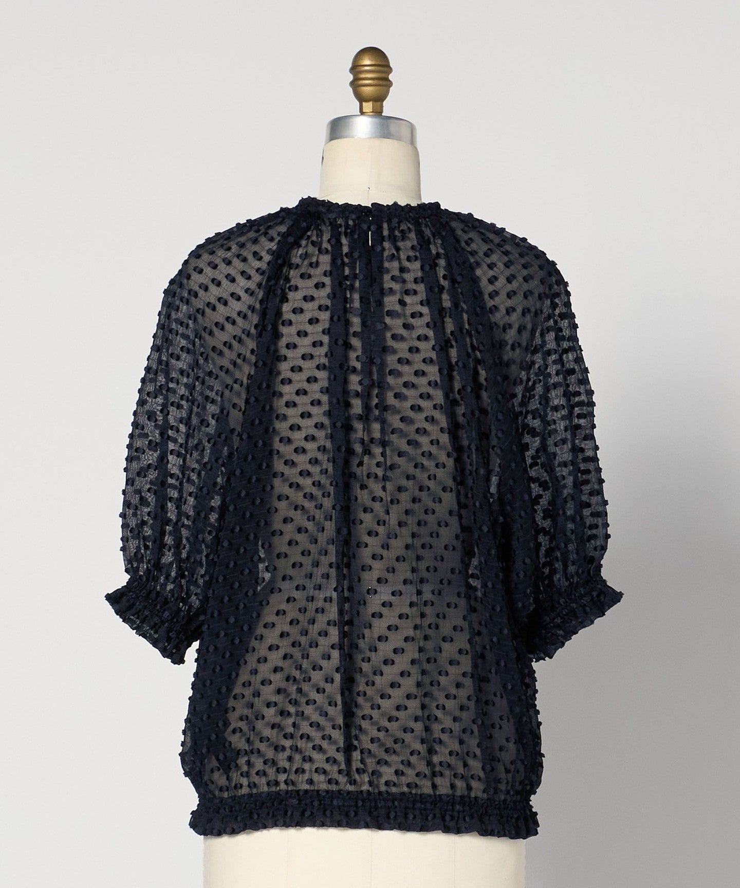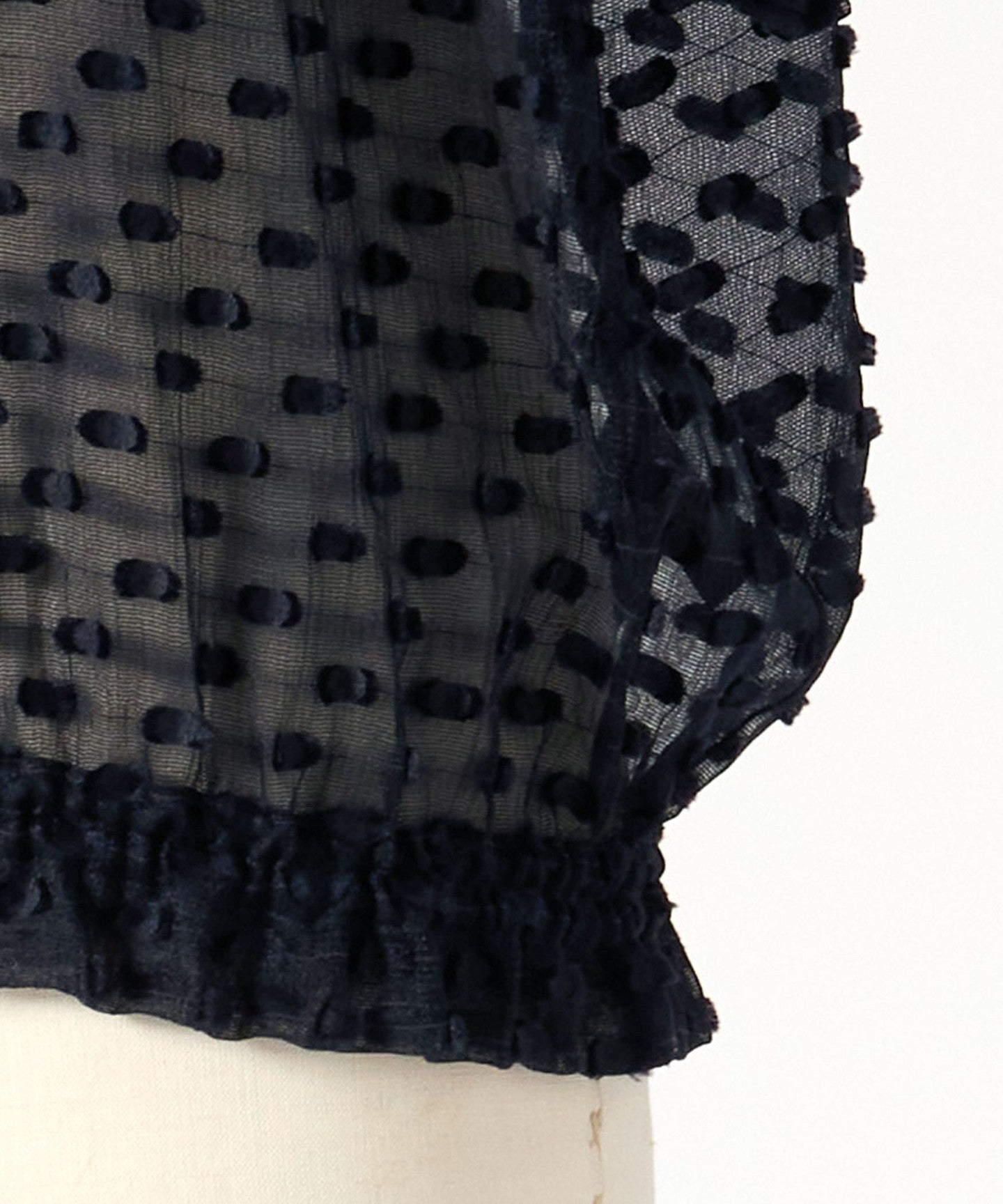 A gorgeous blouse made of sheer material with a three-dimensional dot pattern.