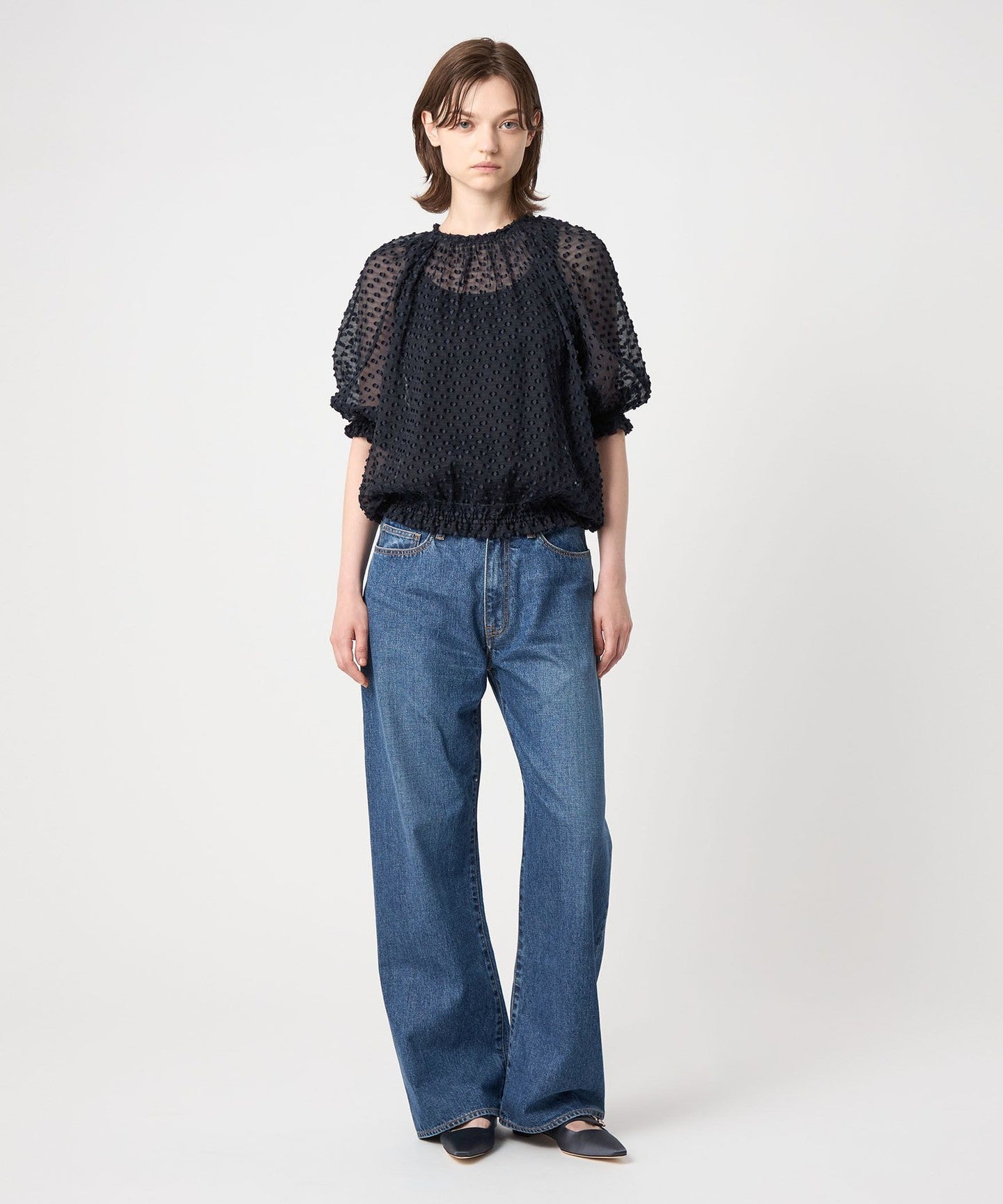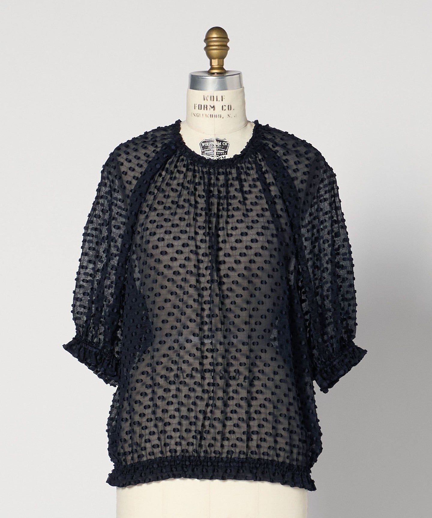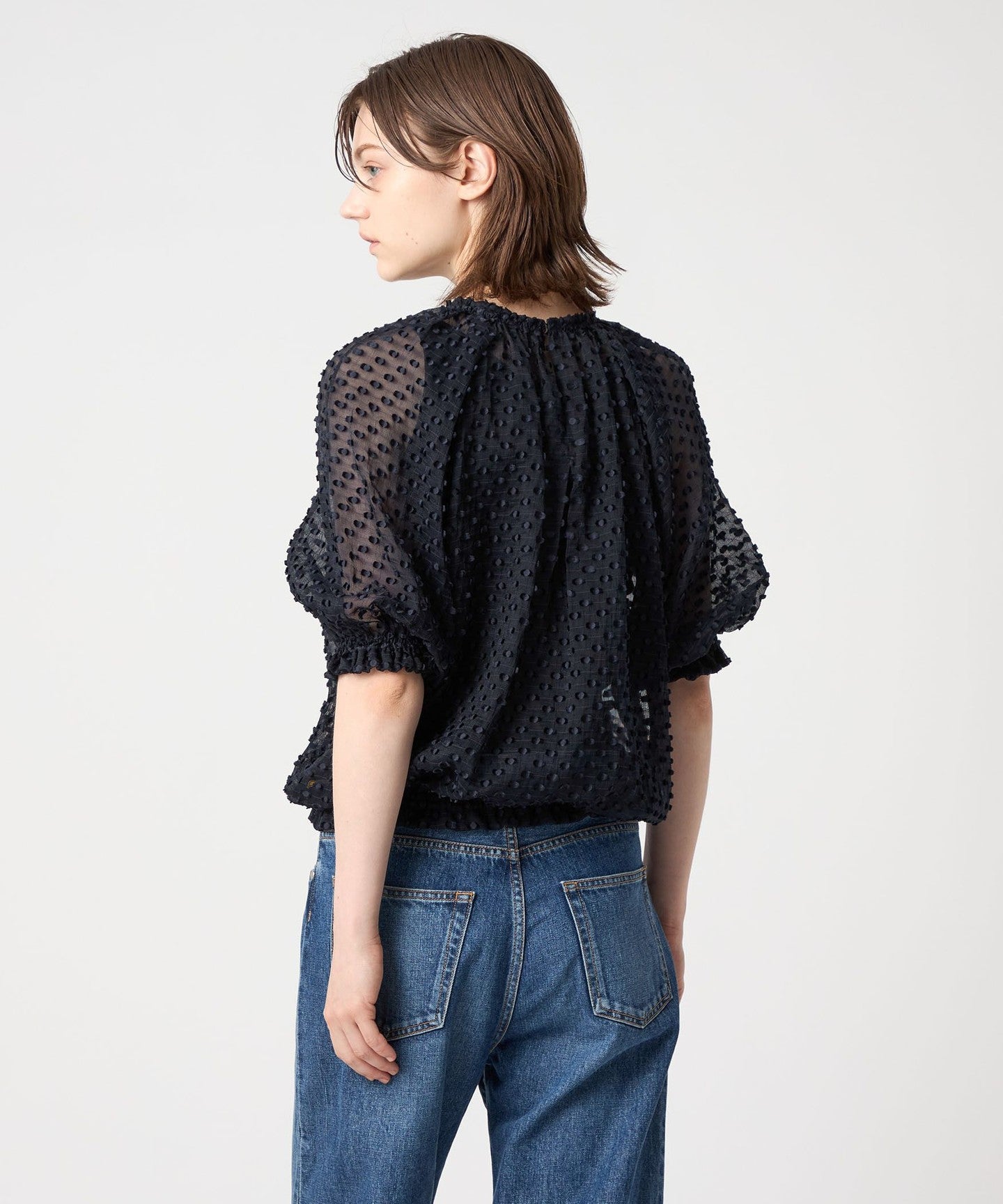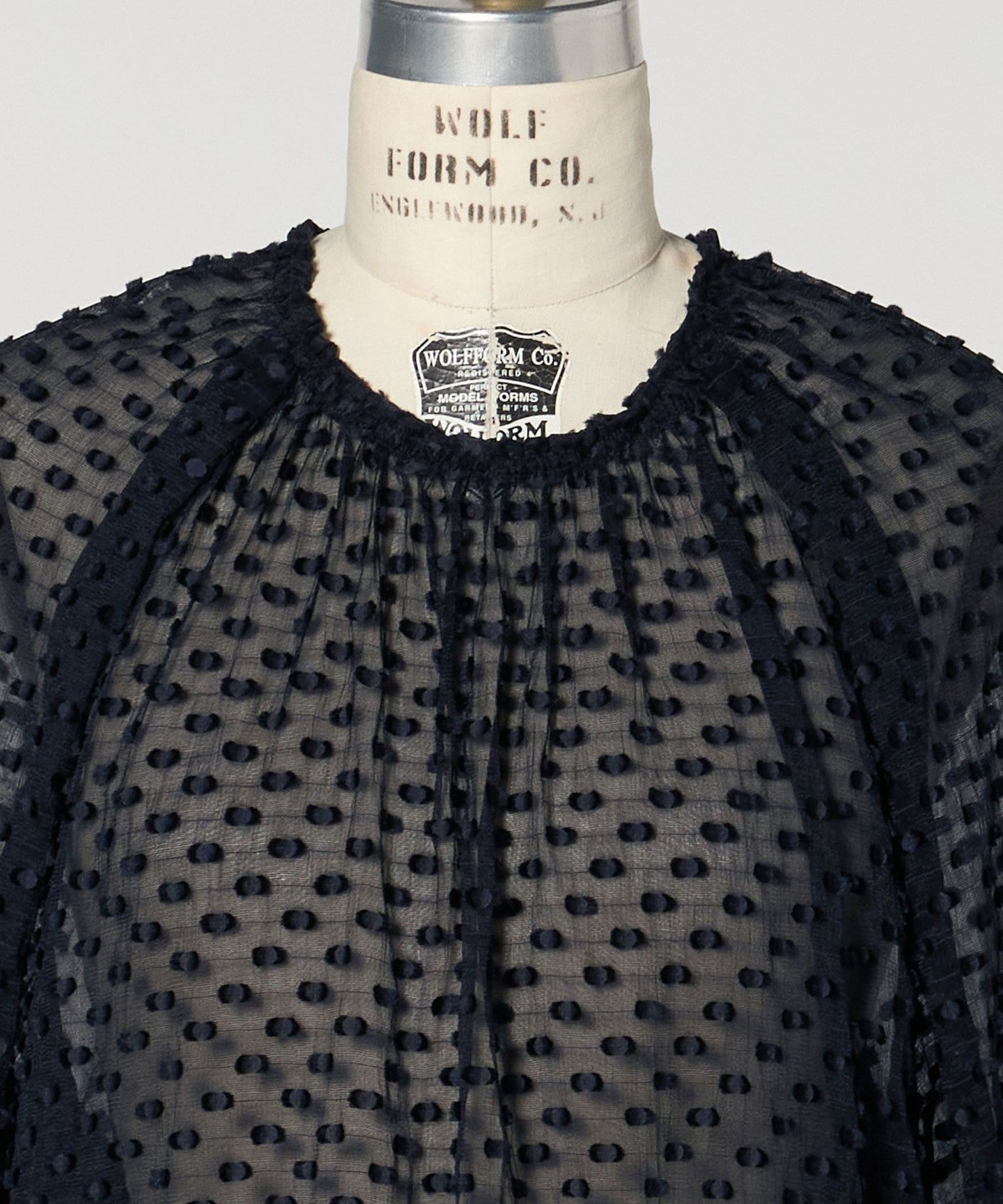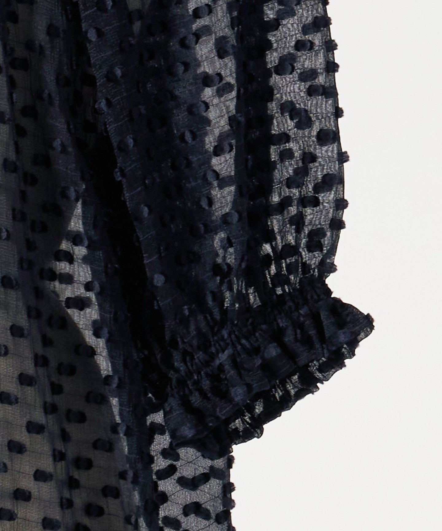 A gorgeous blouse made of sheer material with a three-dimensional dot pattern.