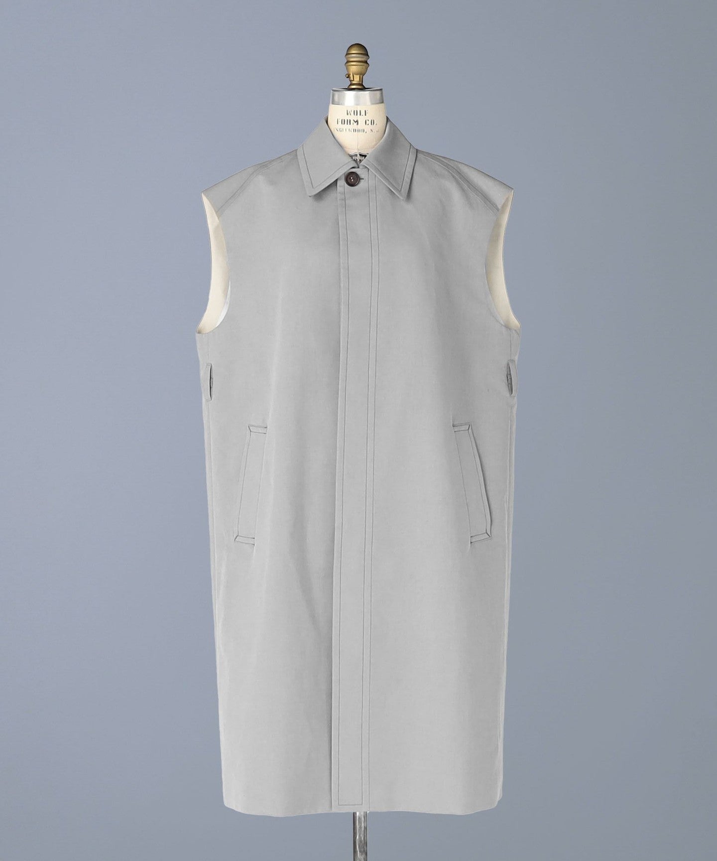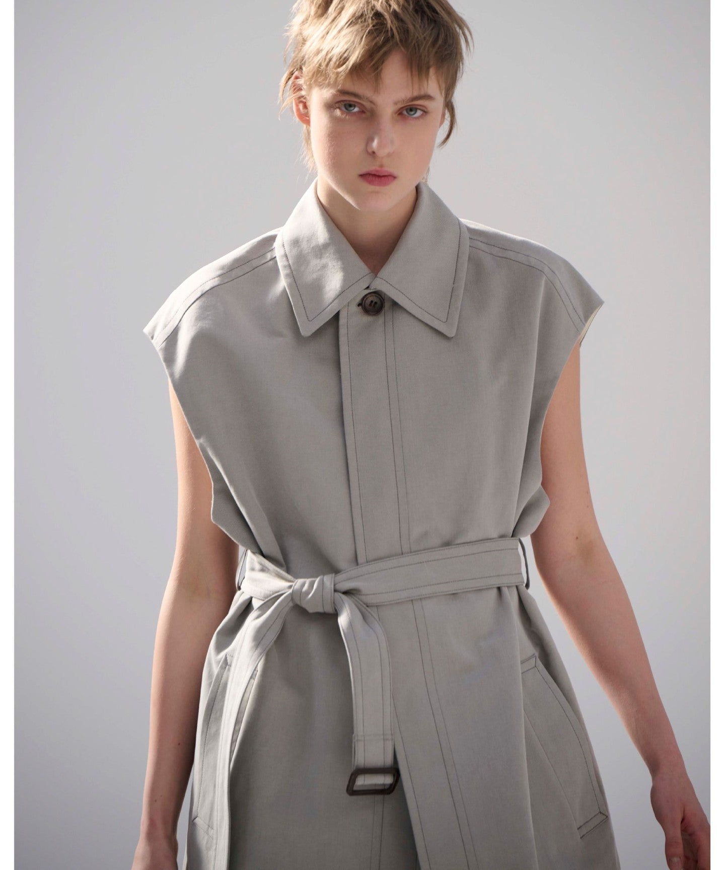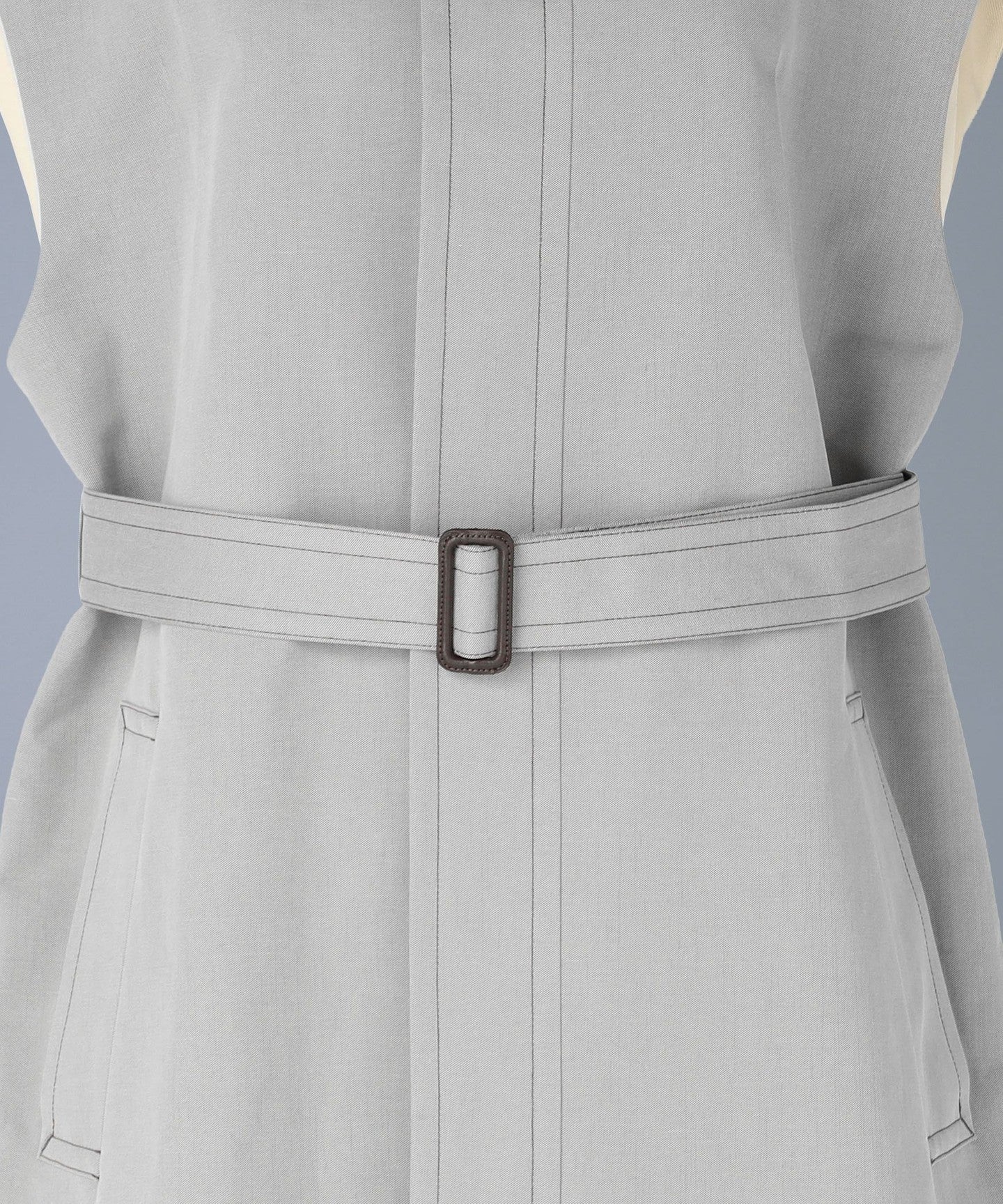 This sleeveless coat features a high-tone gray color that adds a touch of lightness.