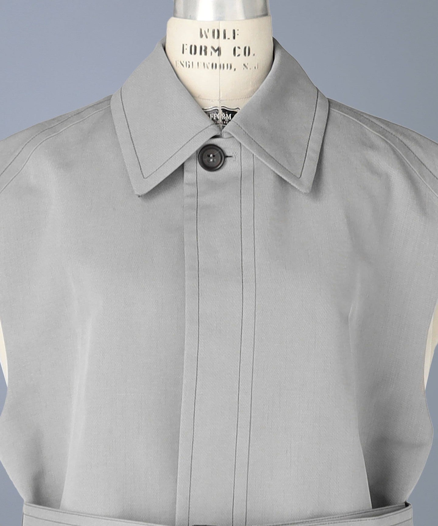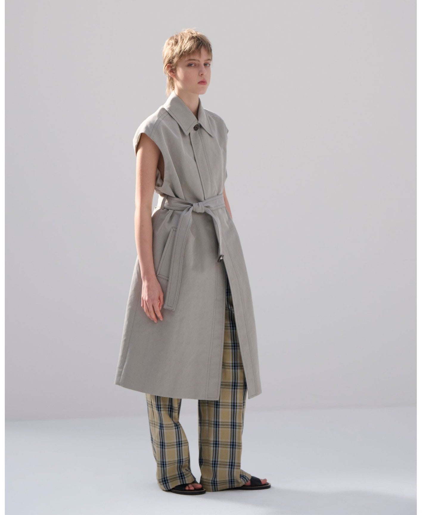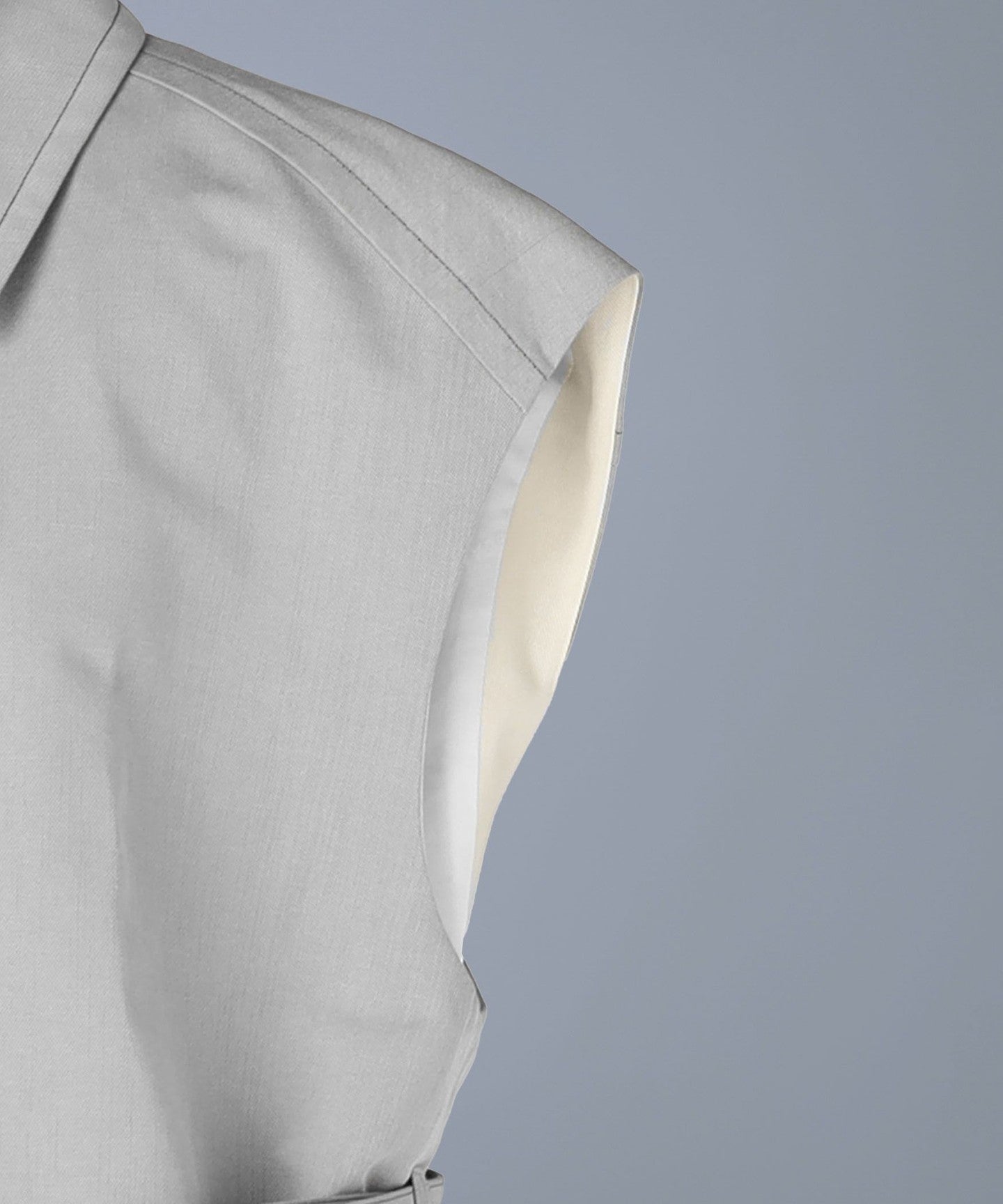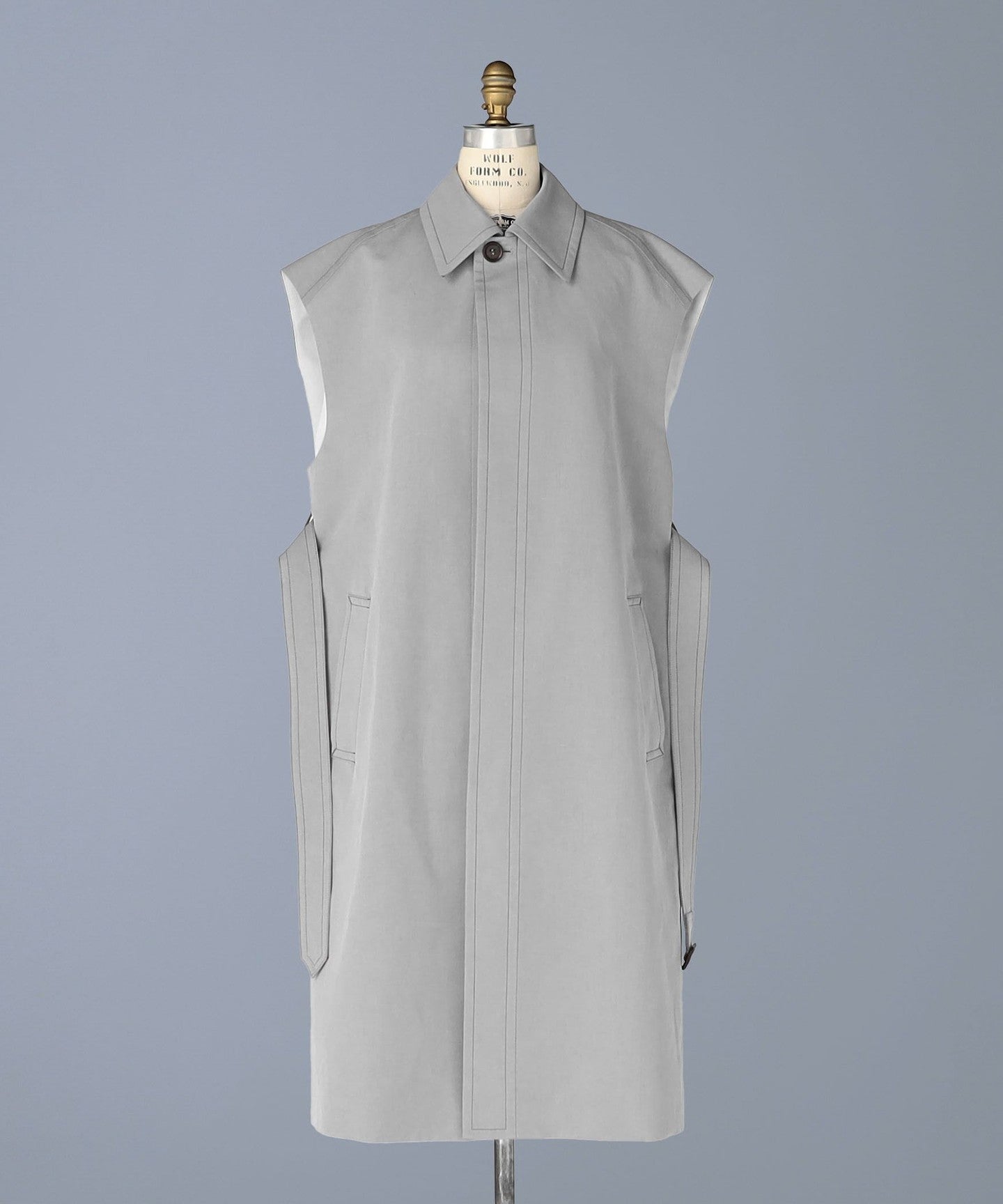 This sleeveless coat features a high-tone gray color that adds a touch of lightness.