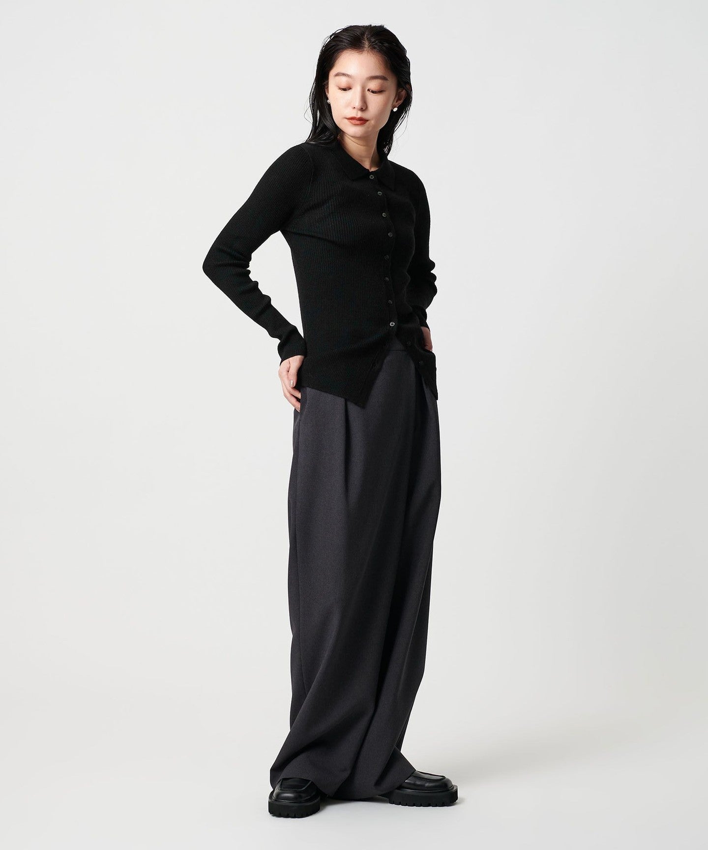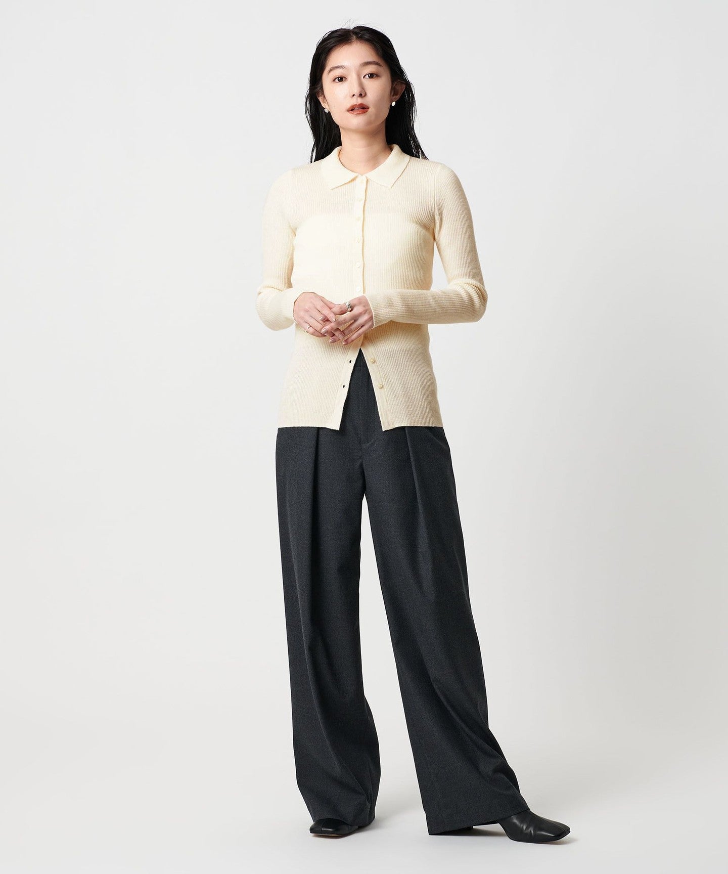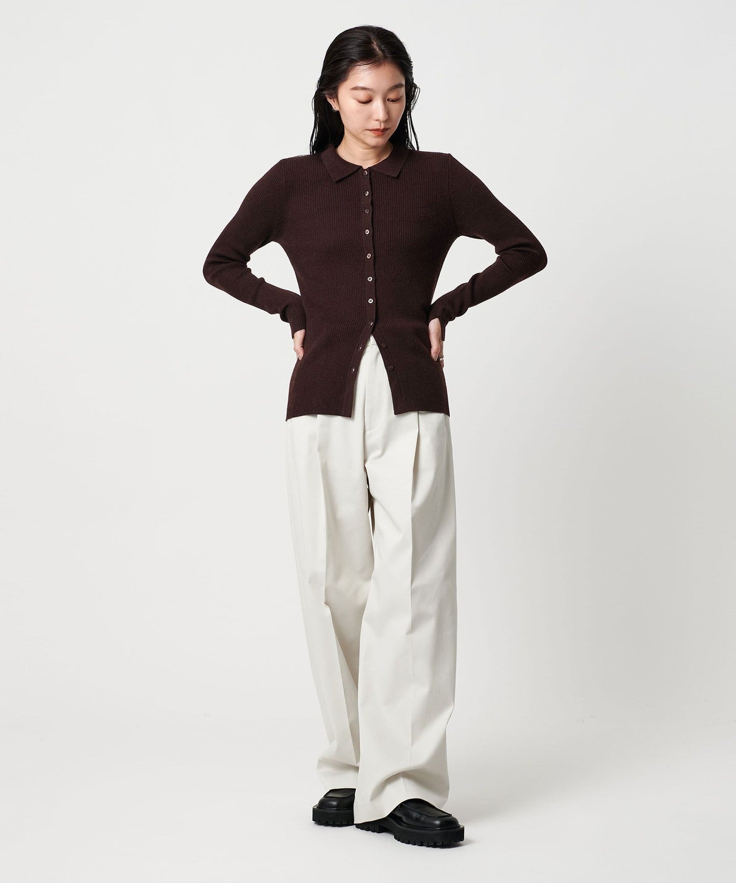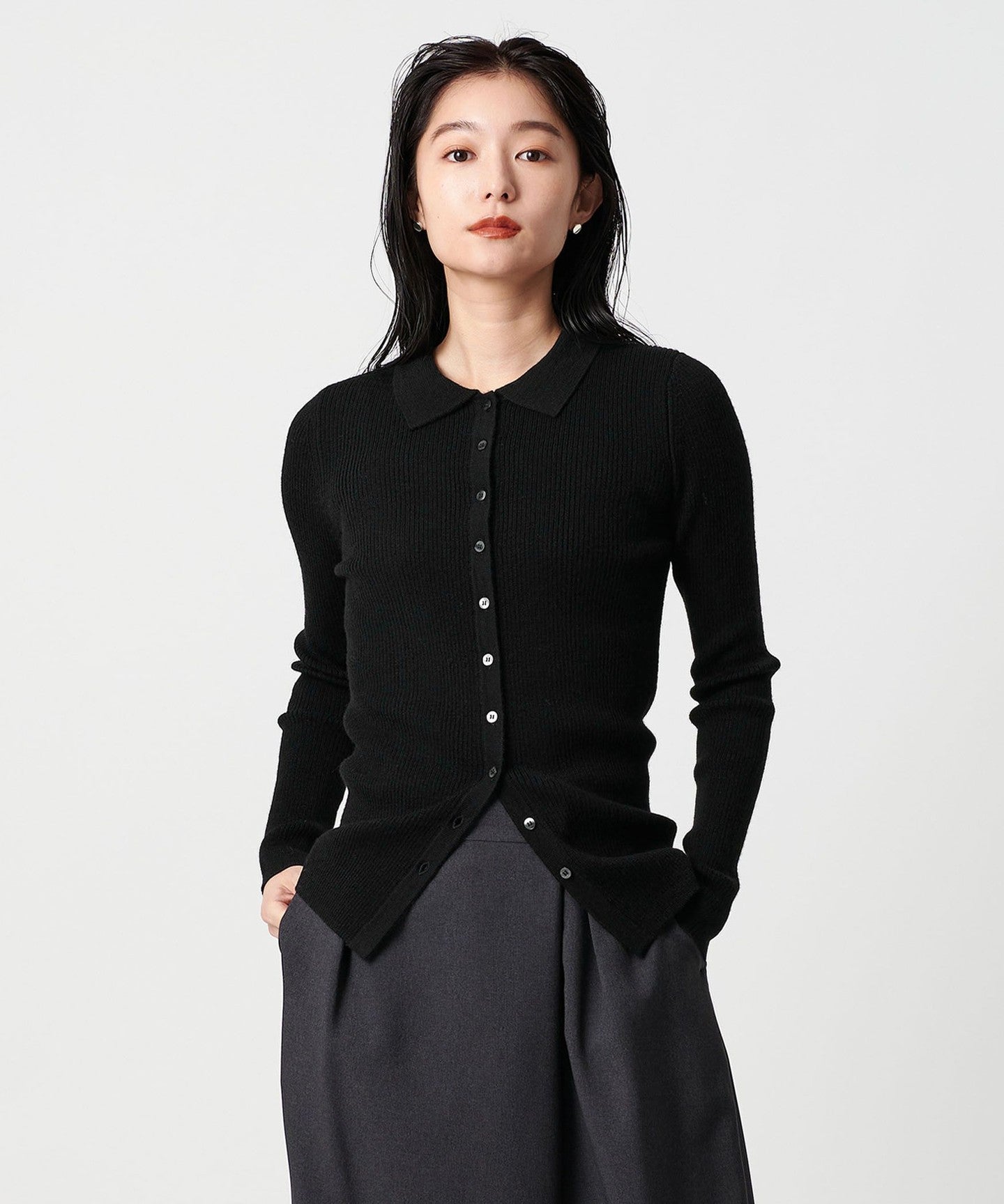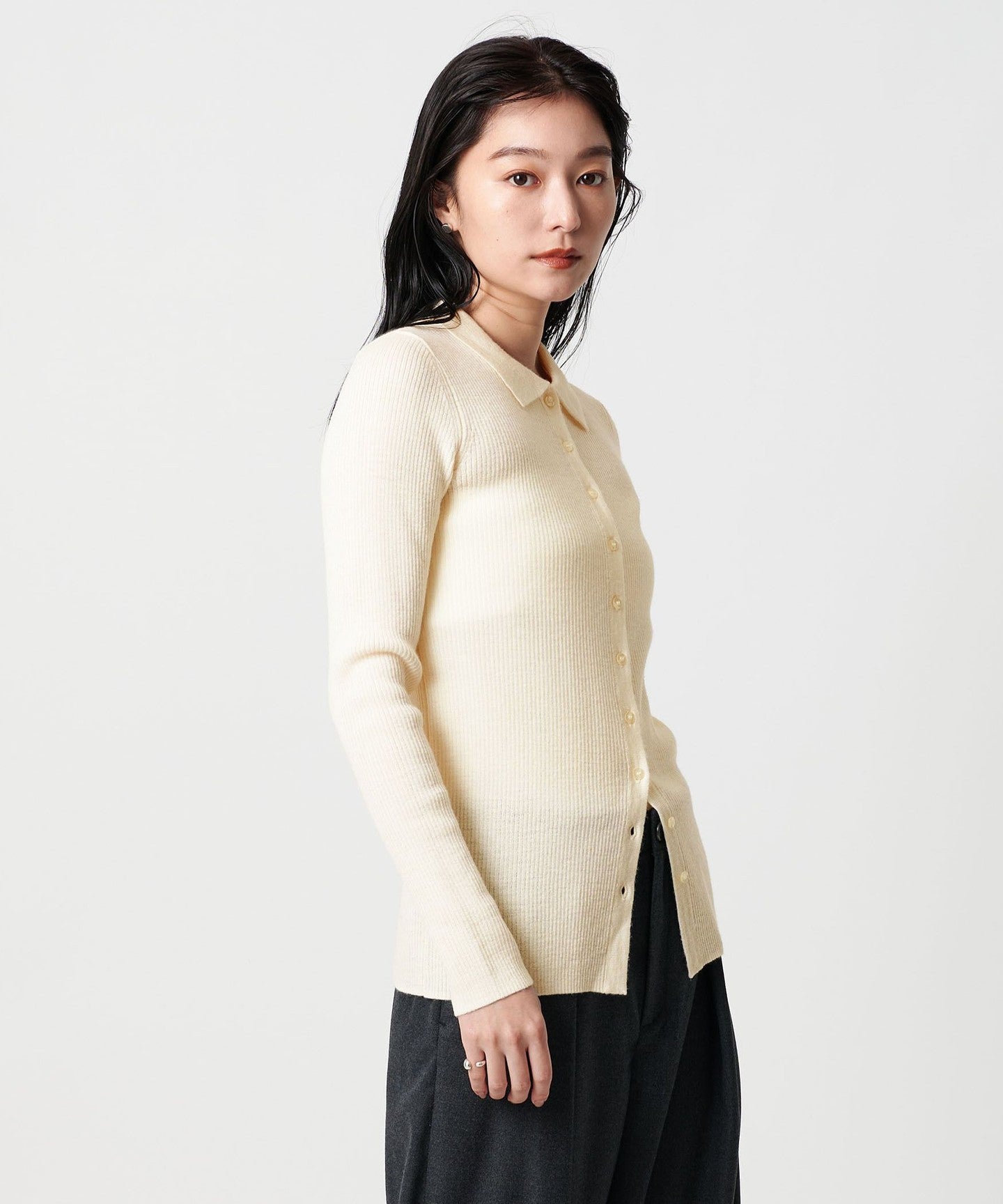 細めのリブが上品な印象を与える襟付きカーディガン。