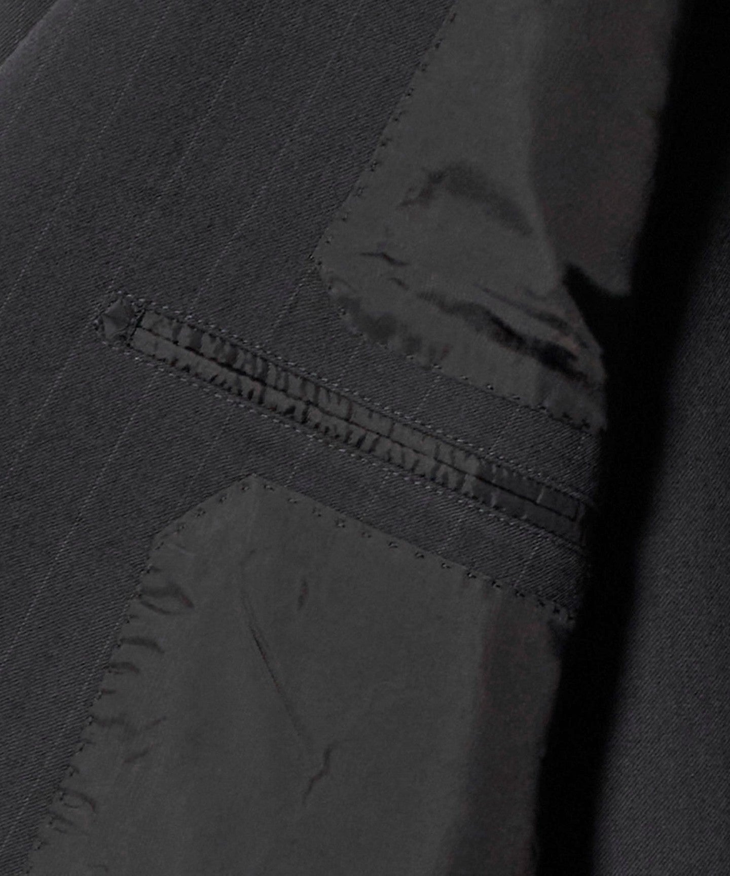 This four-button double-breasted jacket features straight lines and no chest pocket. Crafted from luxurious fabric woven with high-quality, fine-count yarns in a high-density double twill weave, the surface is tightly pressed during the finishing process to create a firm texture. Thicker and firmer than typical suit fabric, it creates a body balance that accentuates the silhouette. The cuff buttons are slightly larger than average, creating a subtle yet assertive design. Visual nuances such as slightly dropped shoulders, wide sleeves, and a subdued texture create a striking style. While simple, its carefully considered appearance creates a modern impression, making it a piece that will elevate any fashion statement.