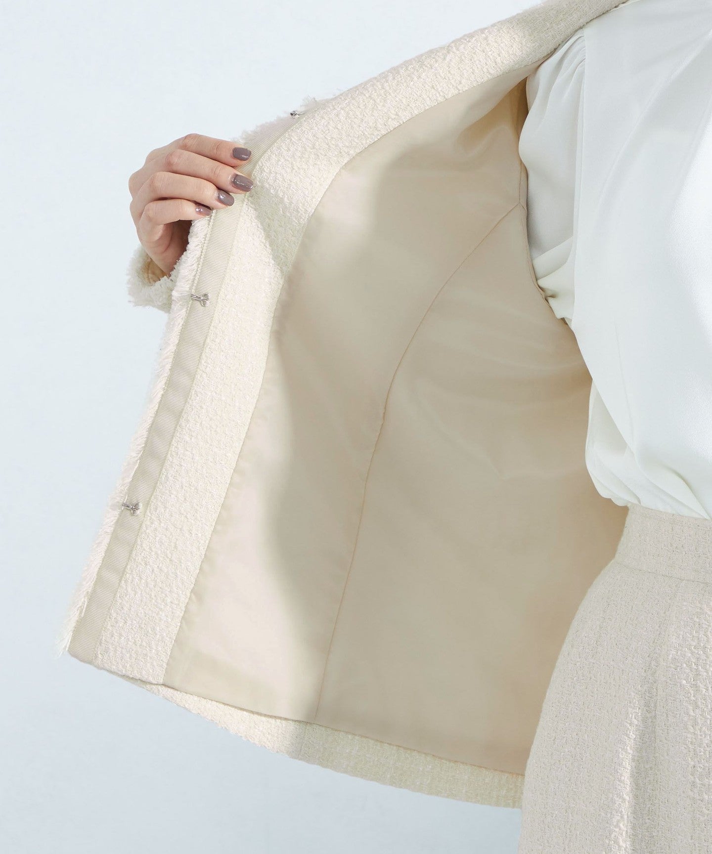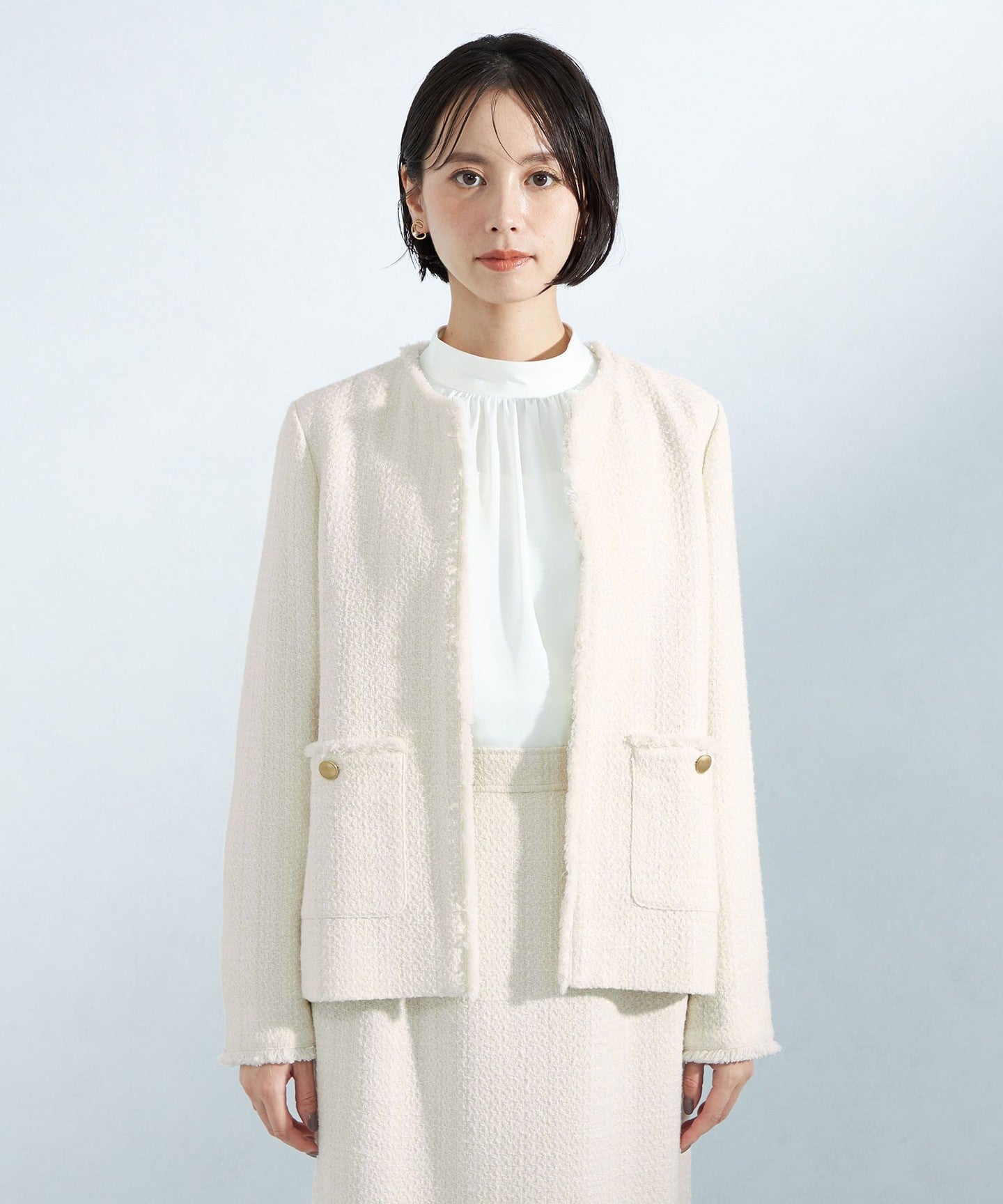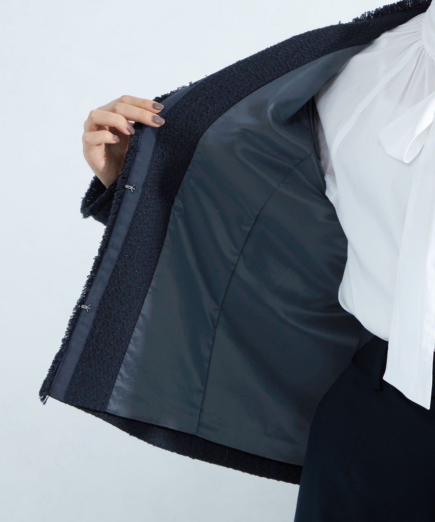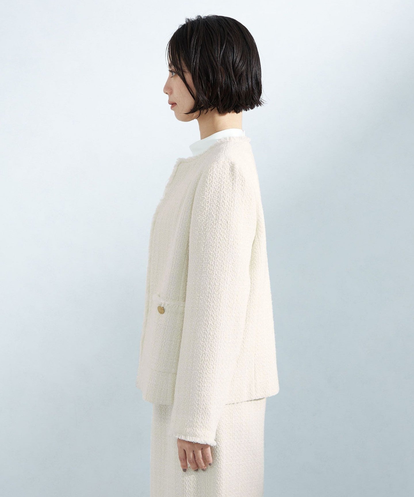 This collarless jacket has an attractive, elegant tweed-like texture.