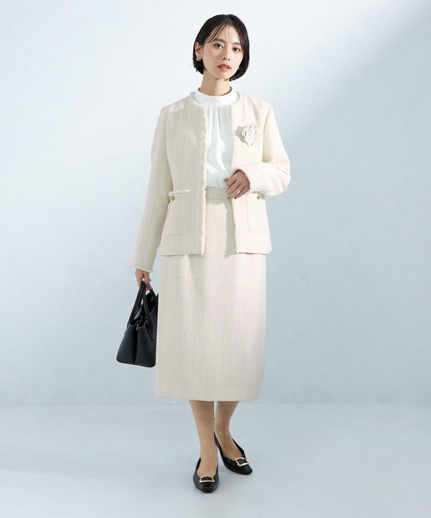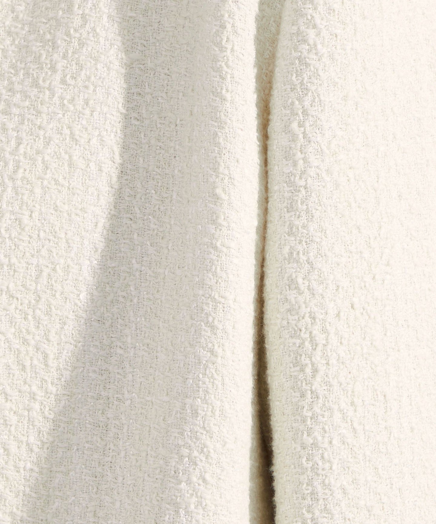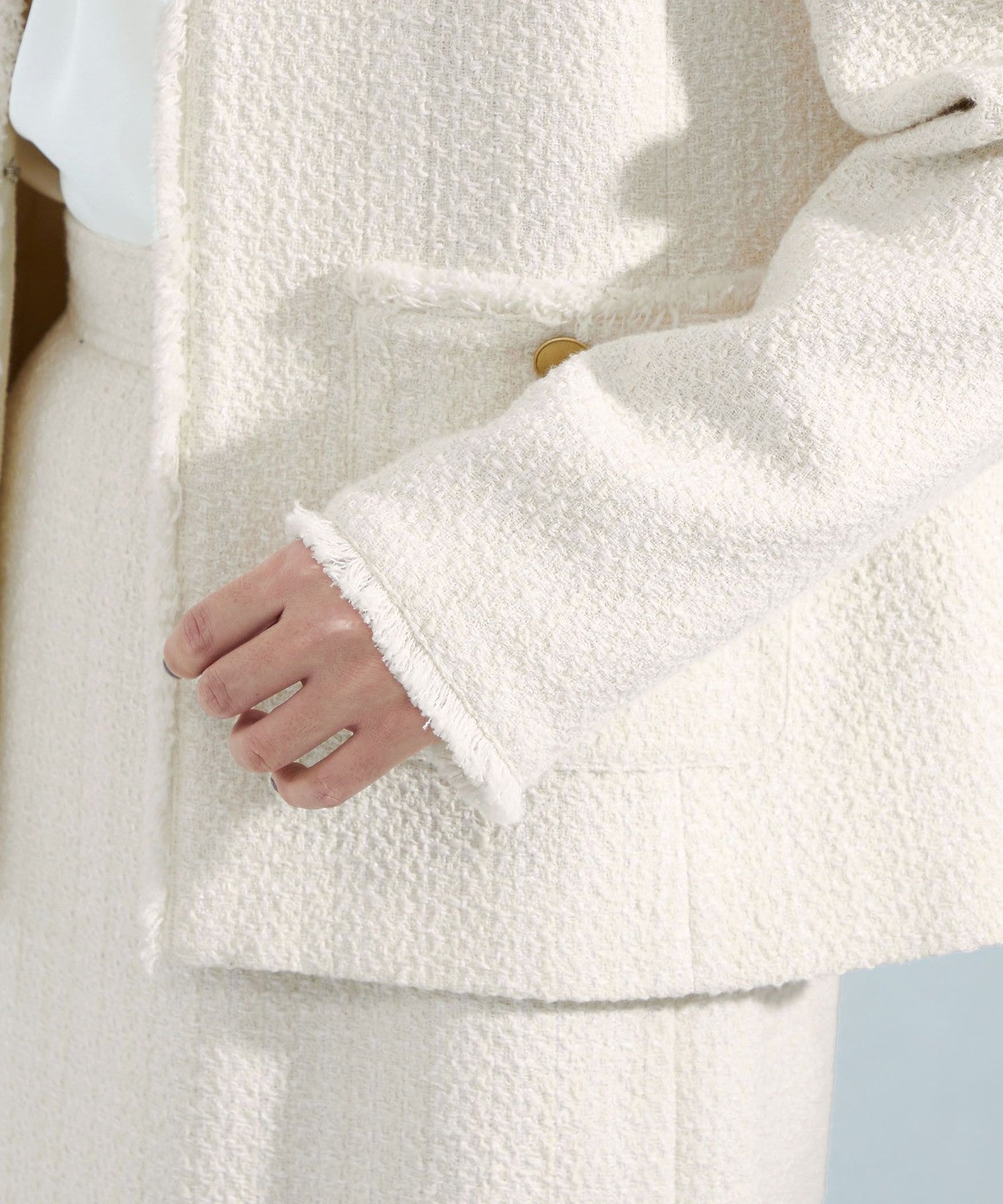 This collarless jacket has an attractive, elegant tweed-like texture.