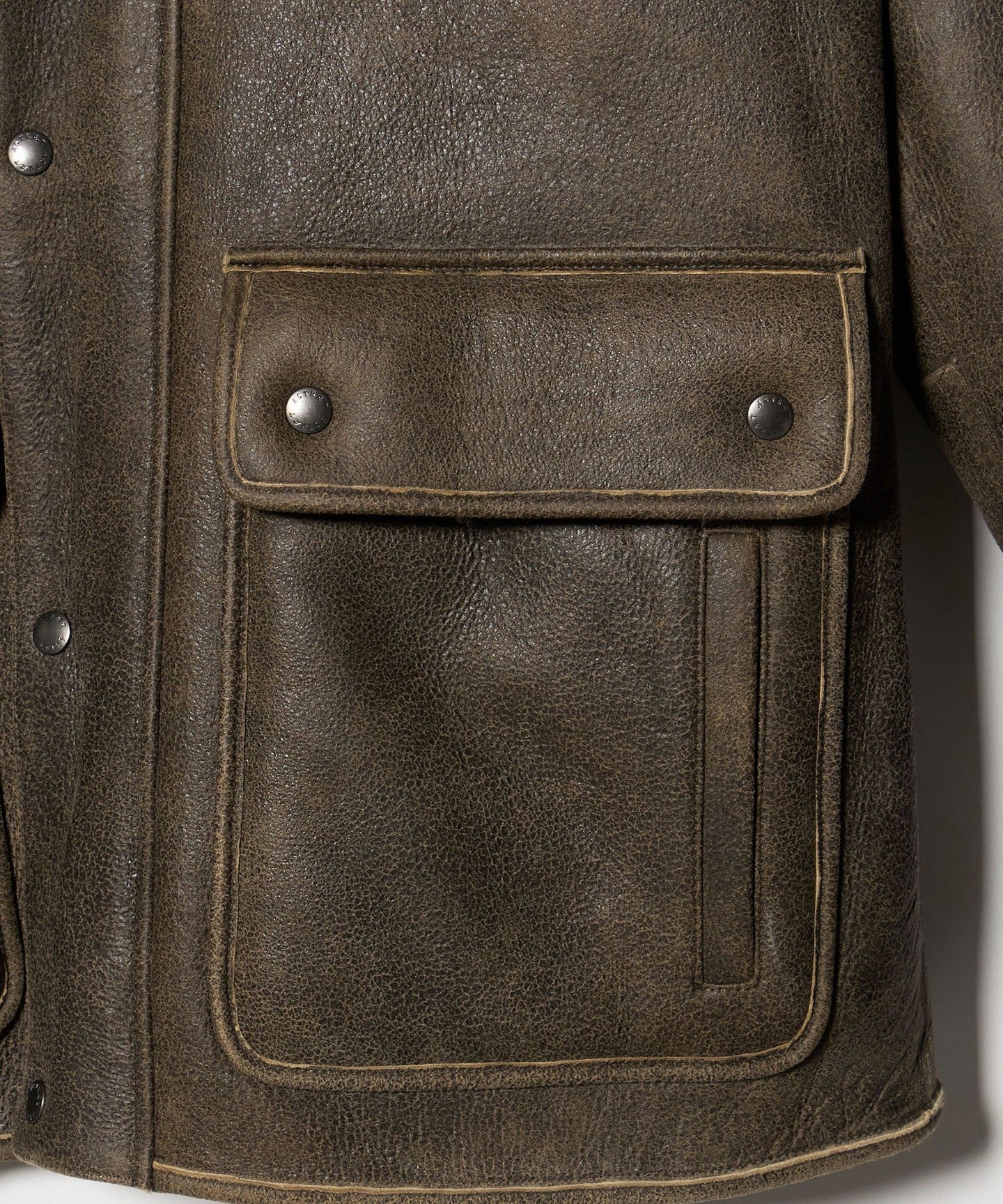 Mouton material with a cracked leather surface to give it an aged look.