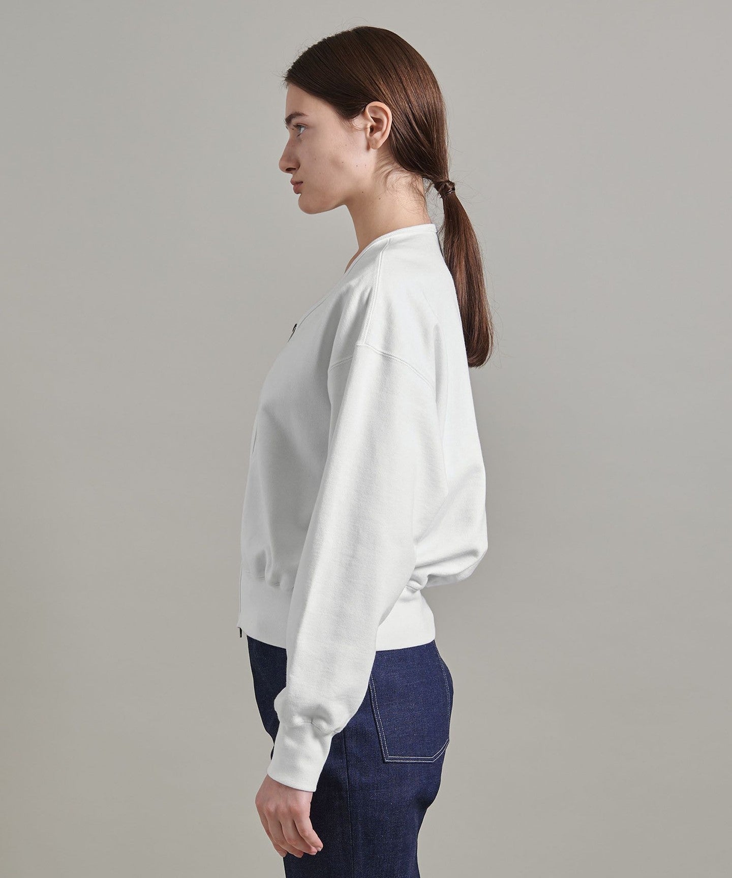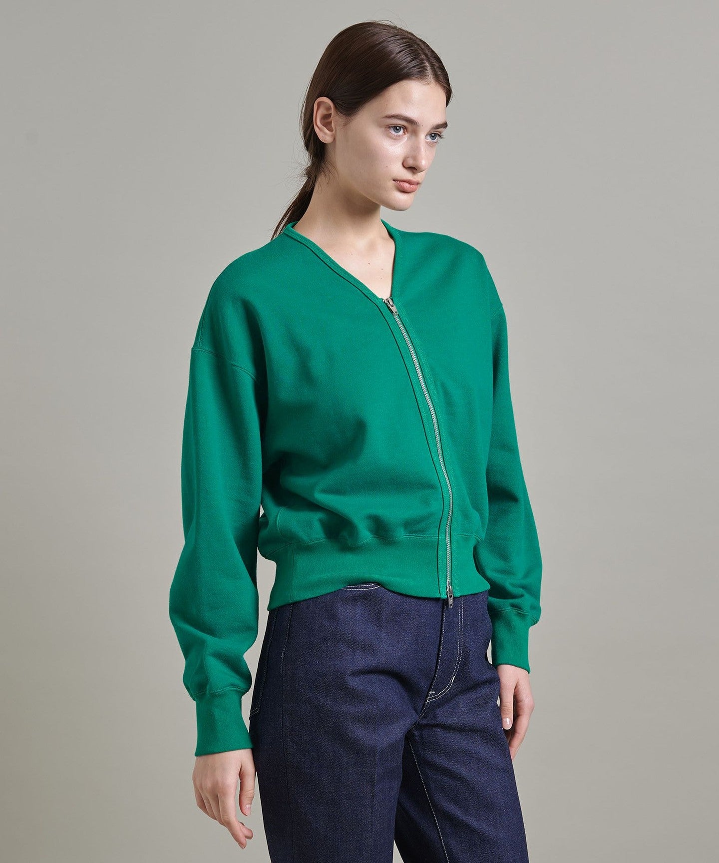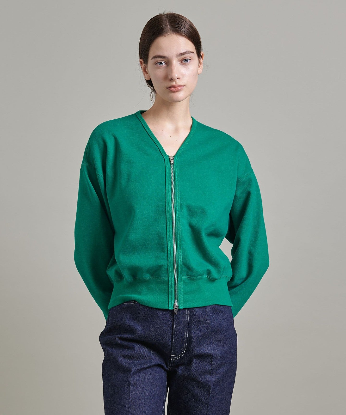 A sweatshirt cardigan with a vintage-like design featuring a front zipper.