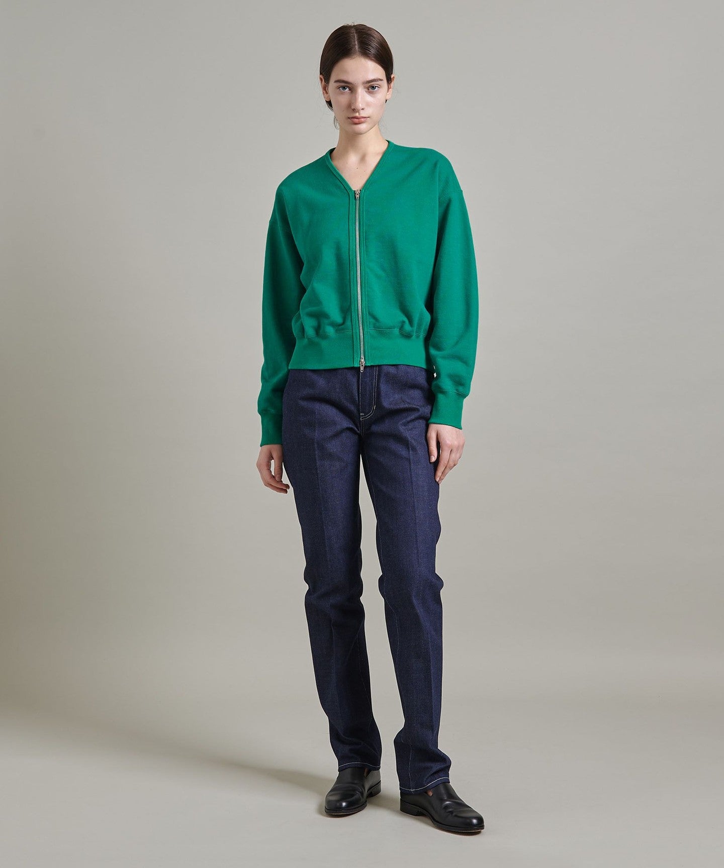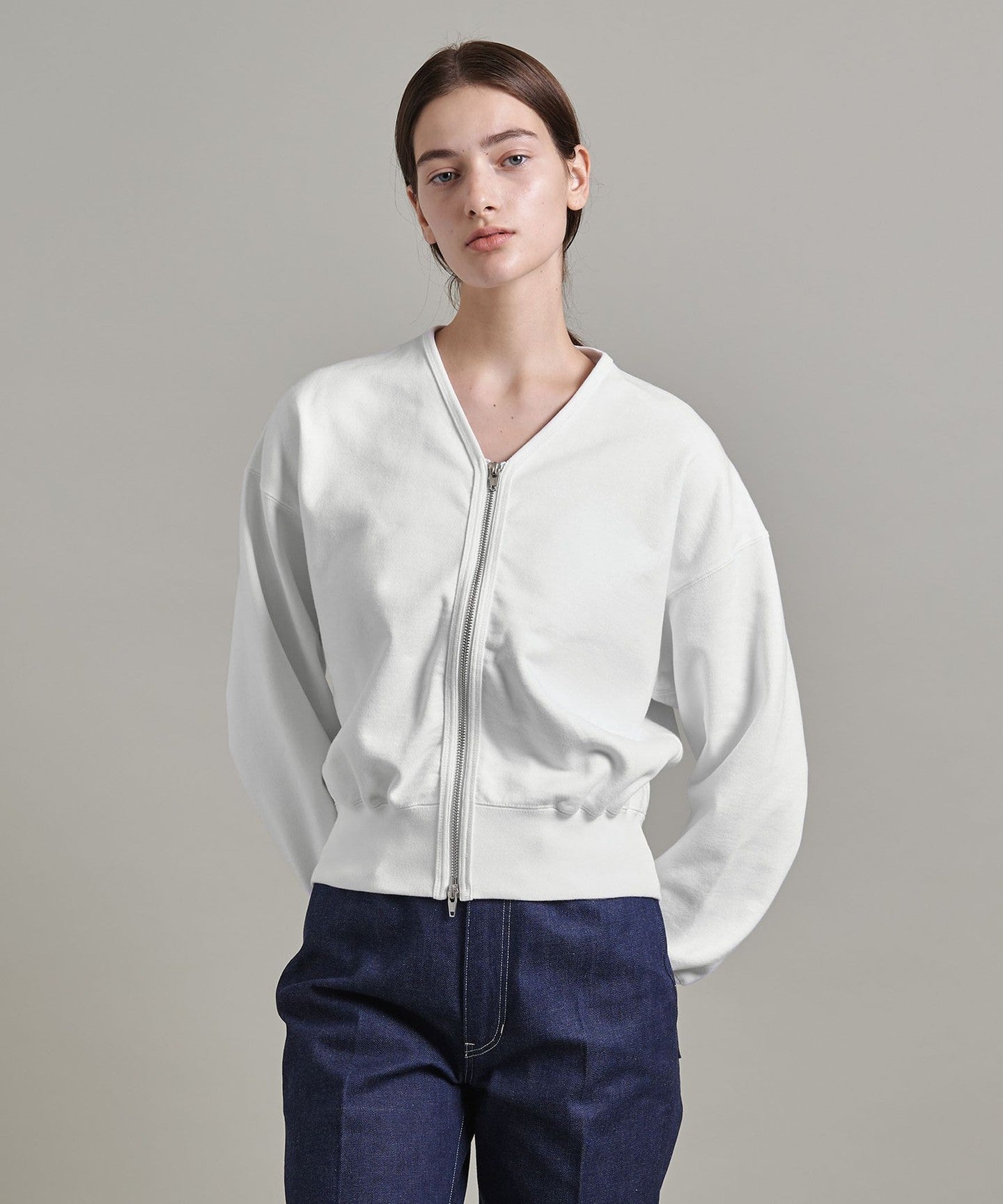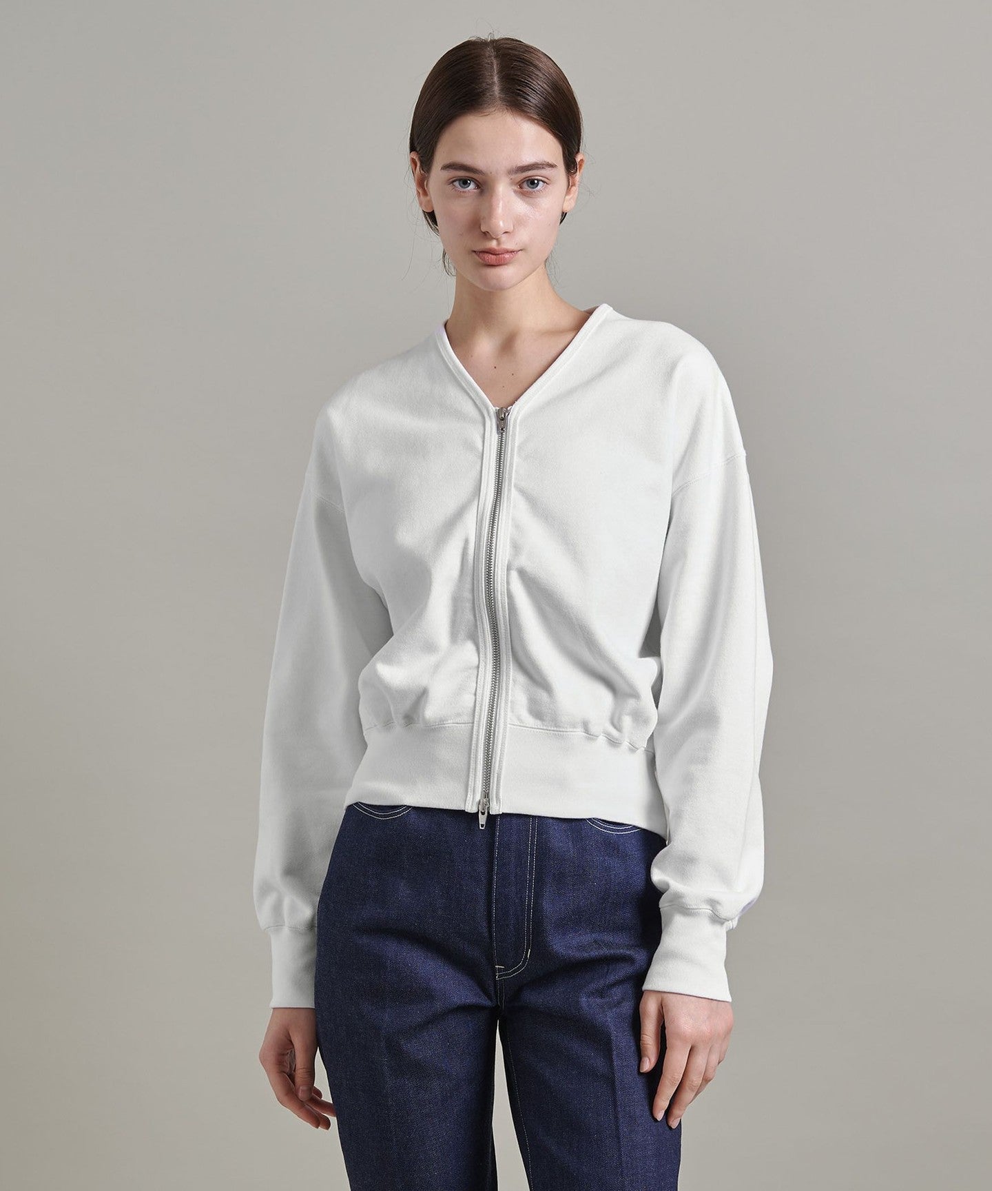 A sweatshirt cardigan with a vintage-like design featuring a front zipper.