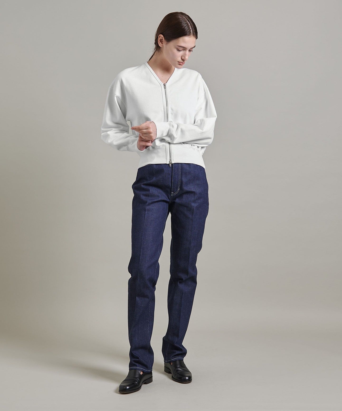 A casual coordination with denim pants gives an elegant and mature feminine impression.