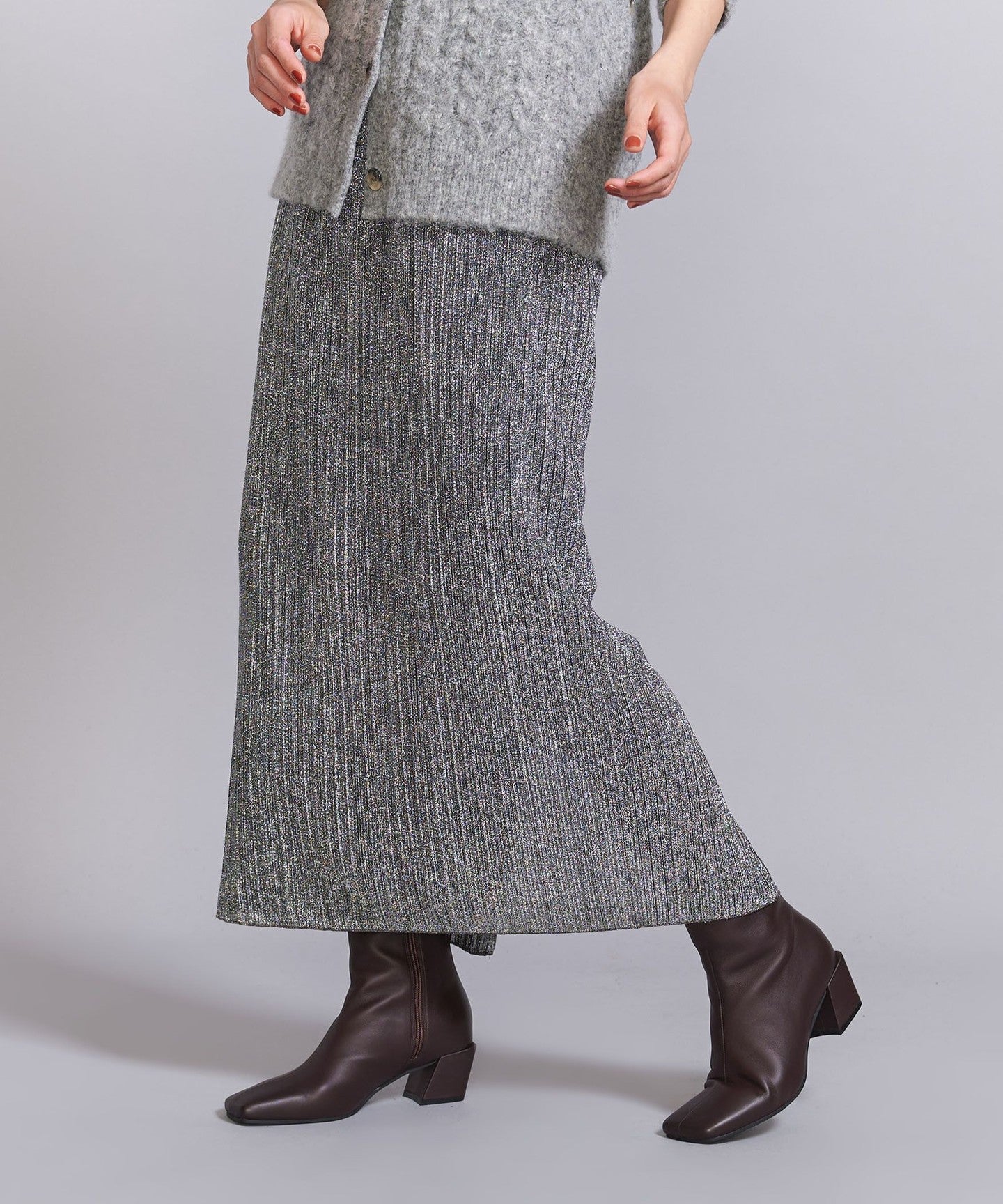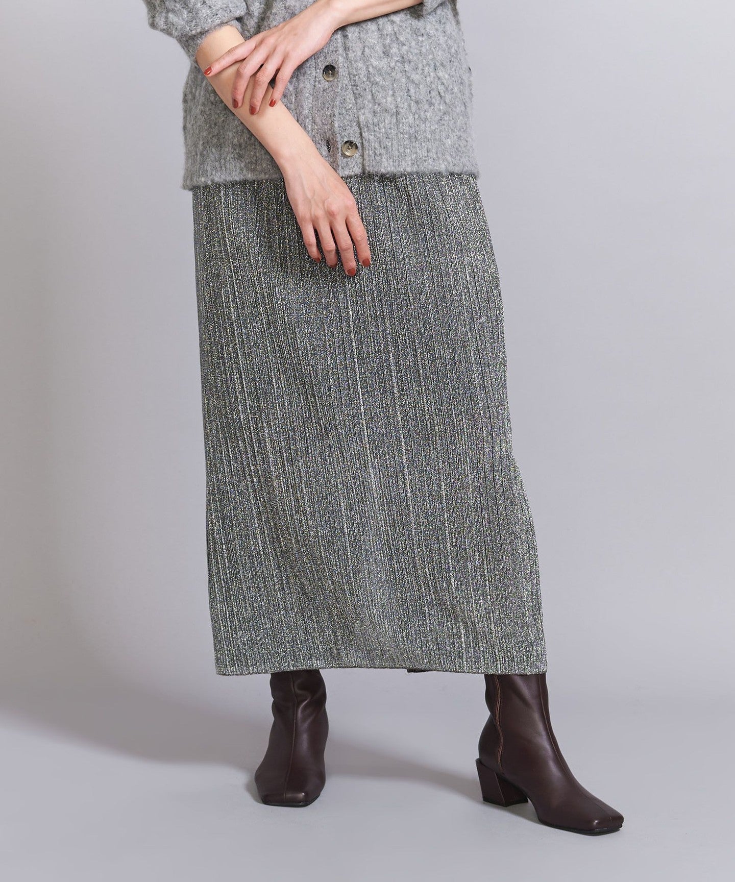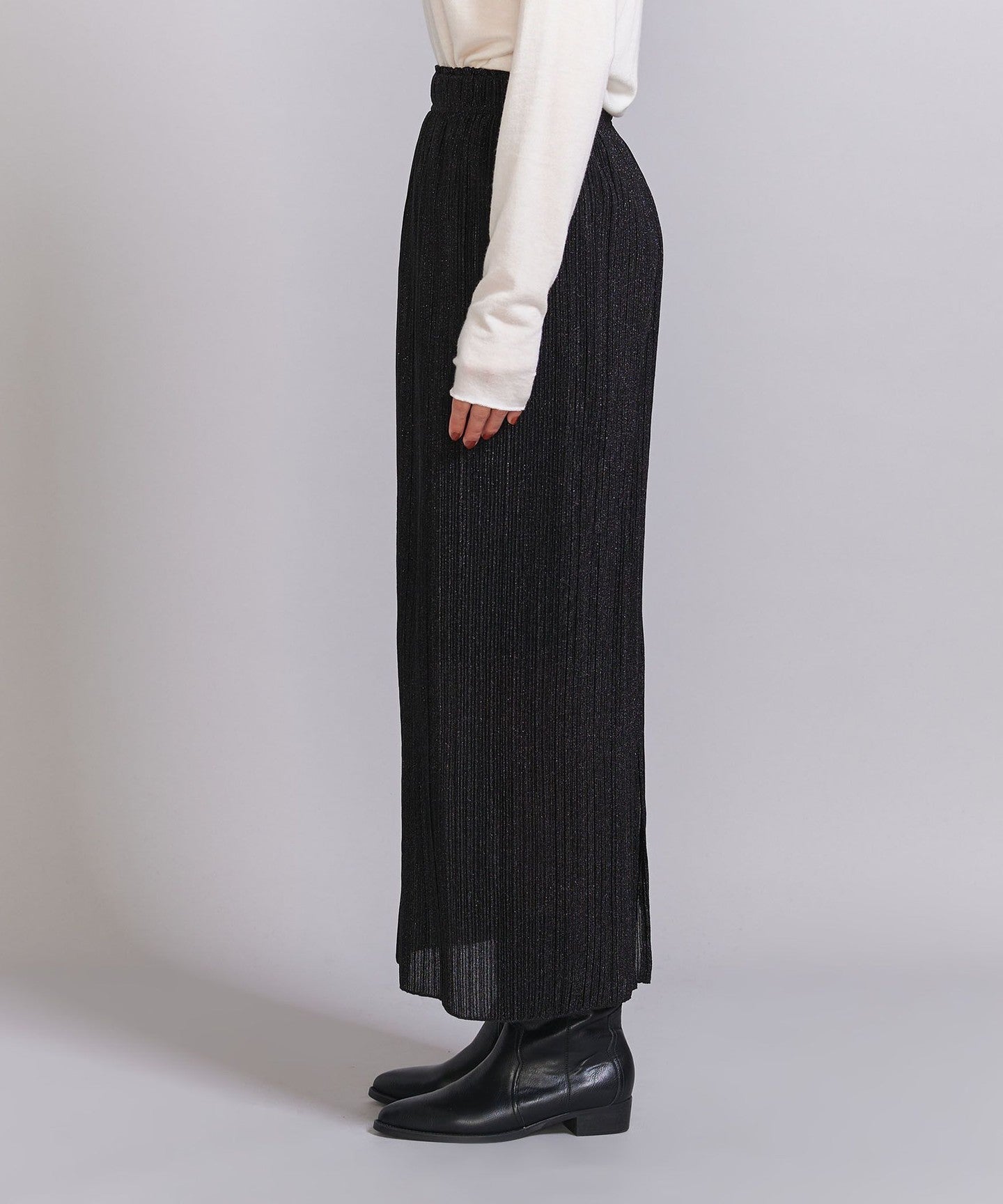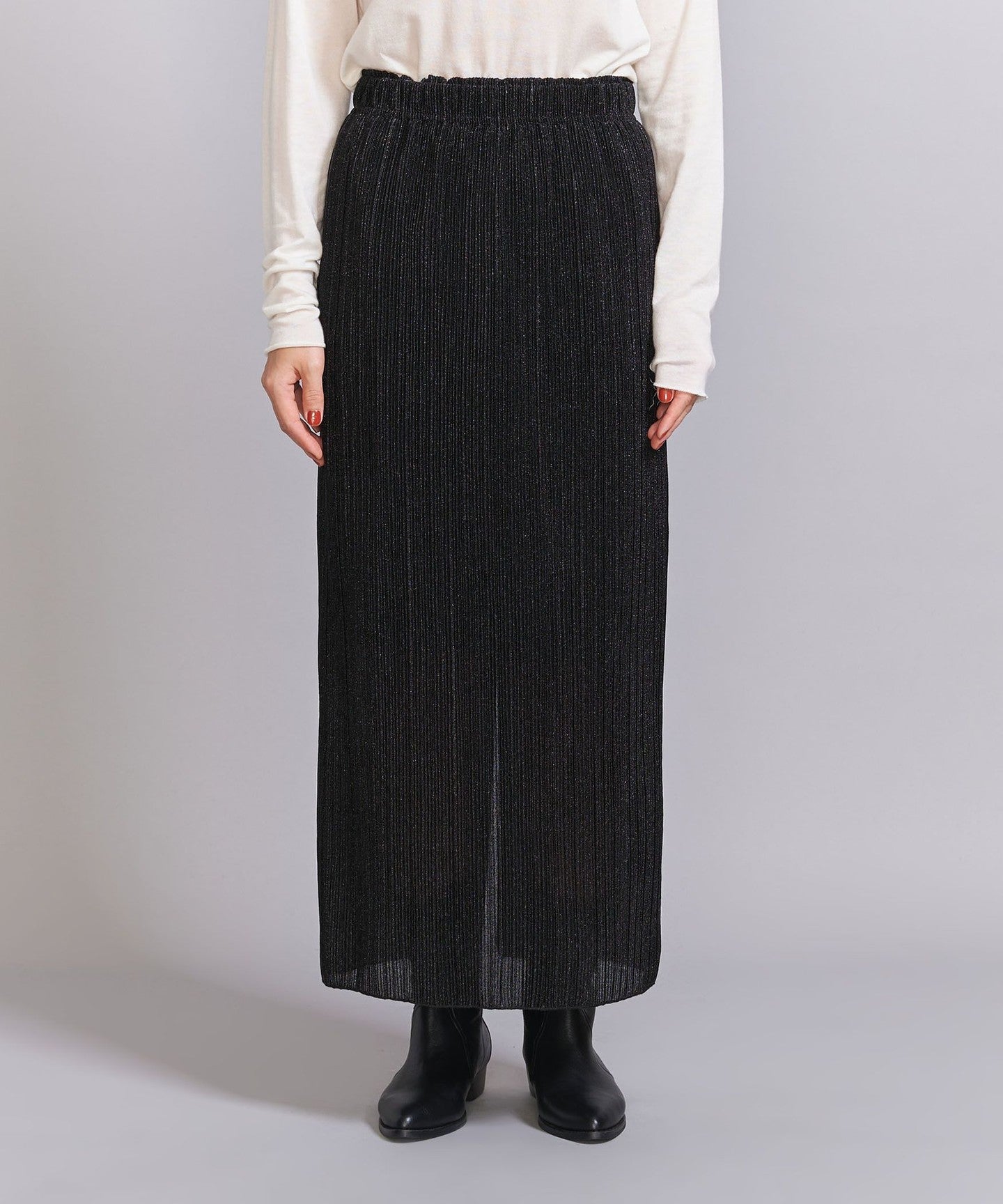 A narrow silhouette pleated skirt with a sophisticated feel