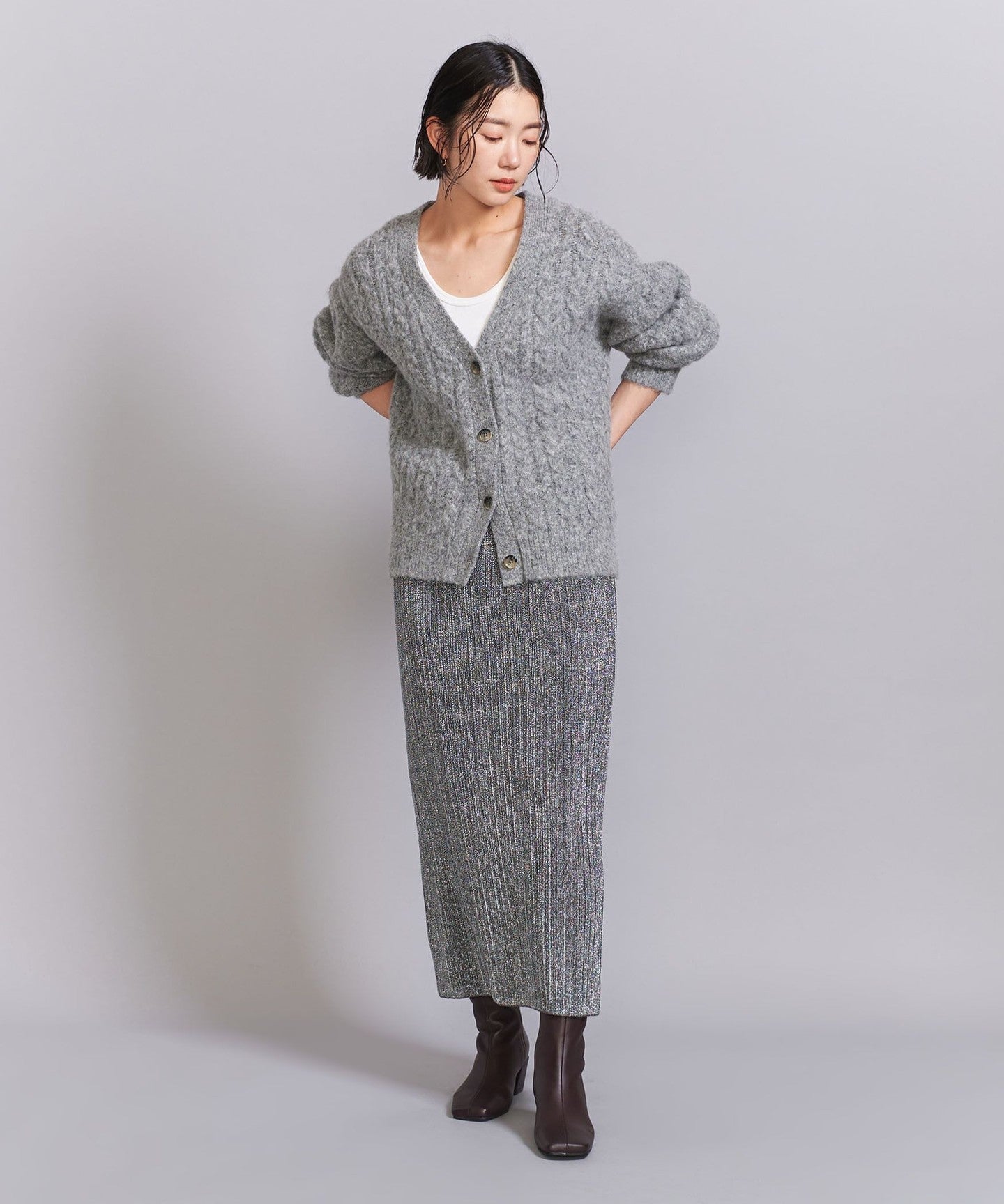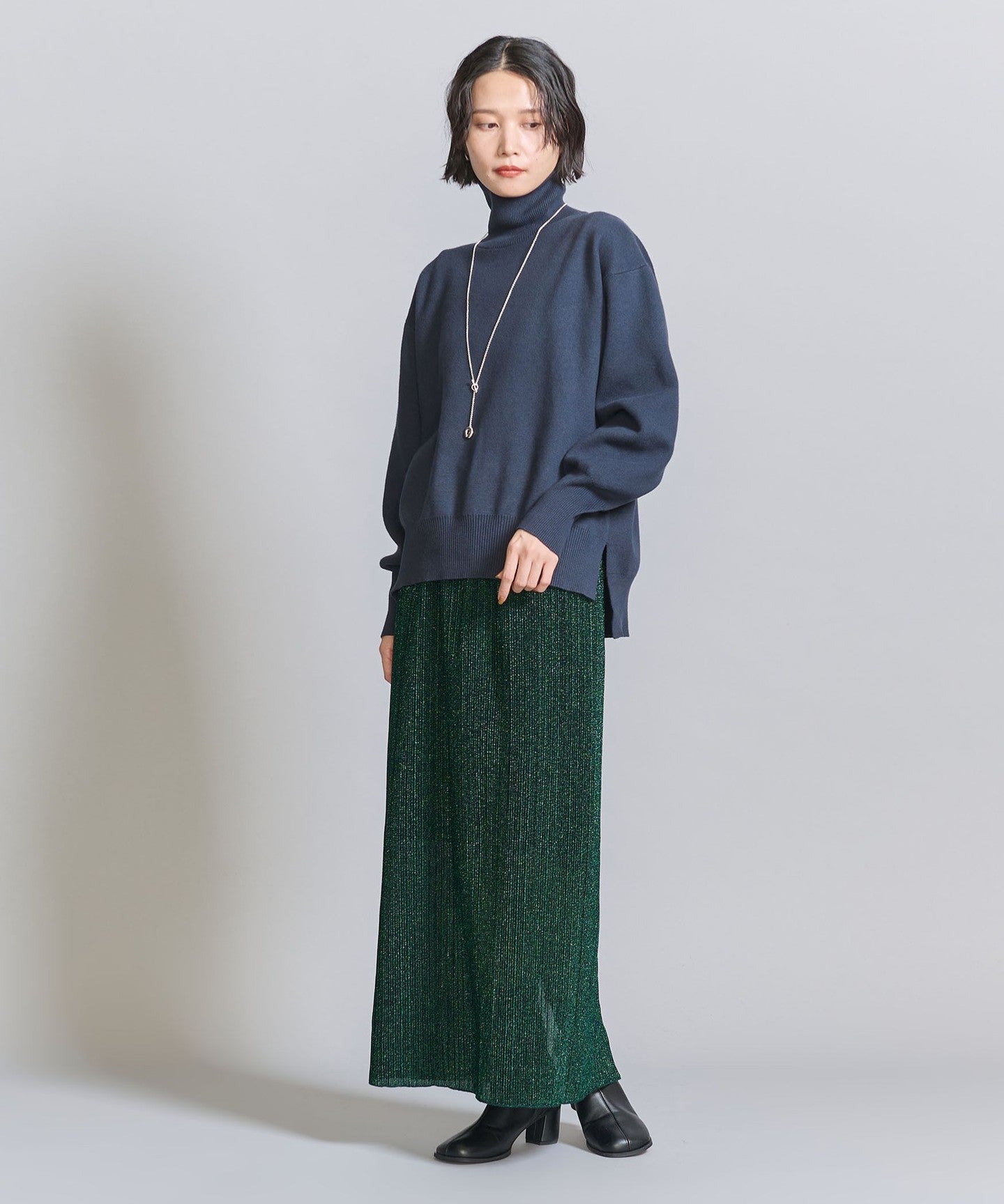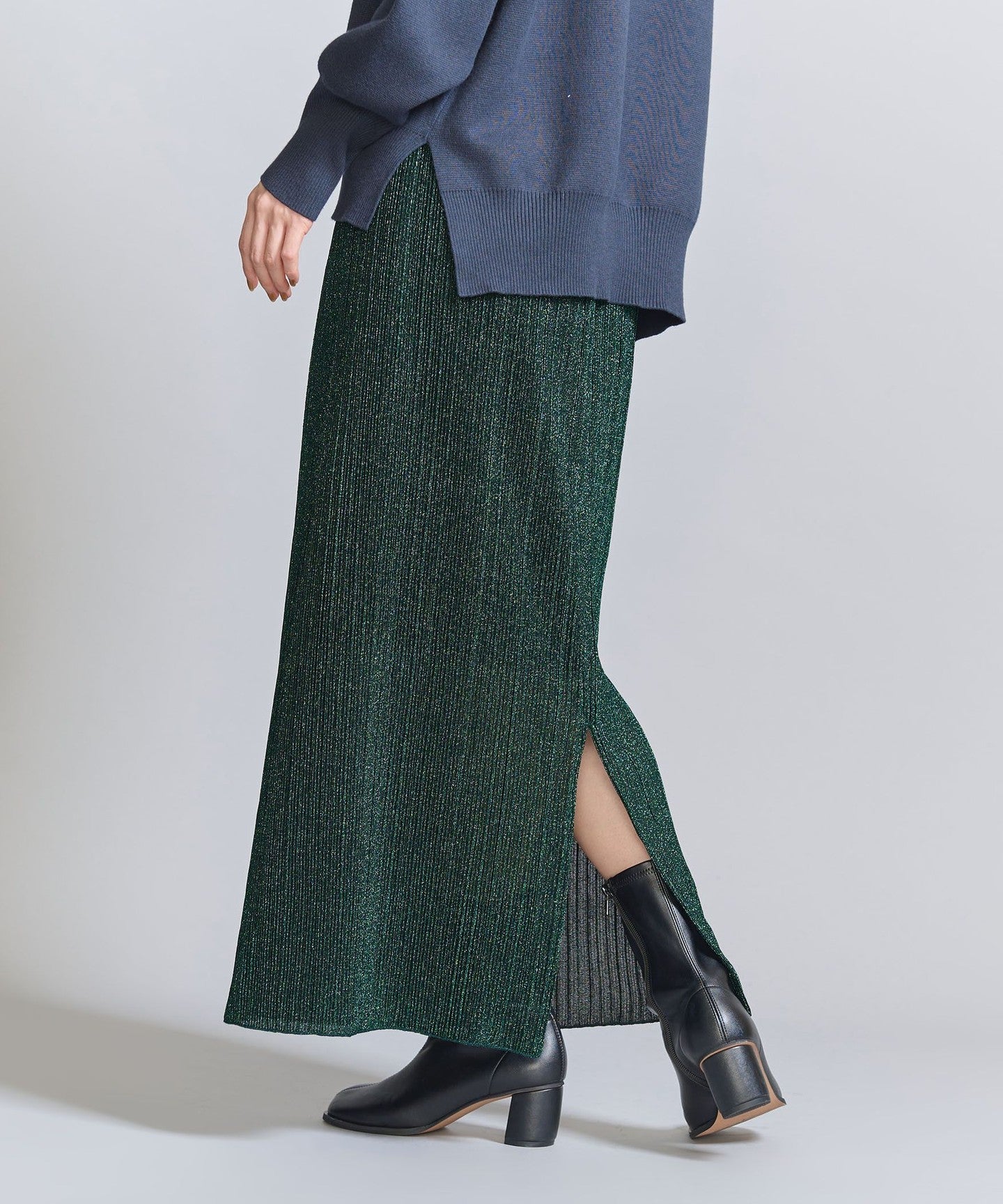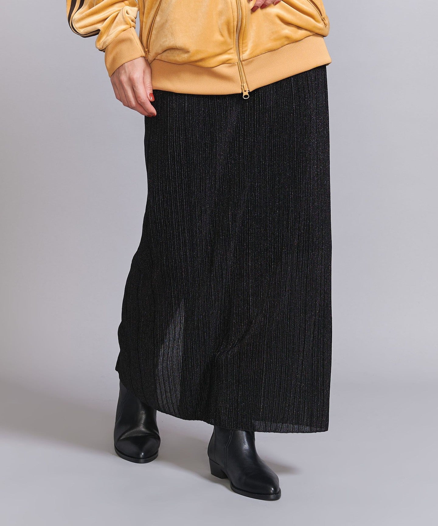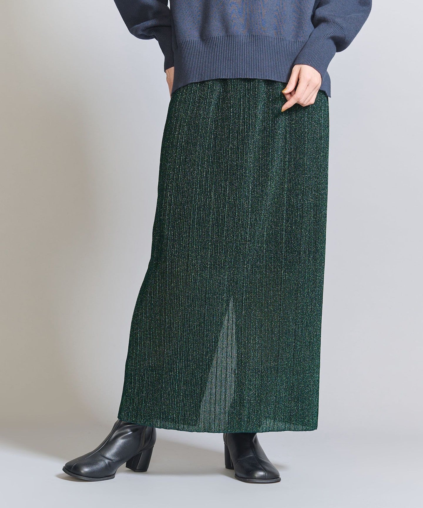 A narrow silhouette pleated skirt with a sophisticated feel