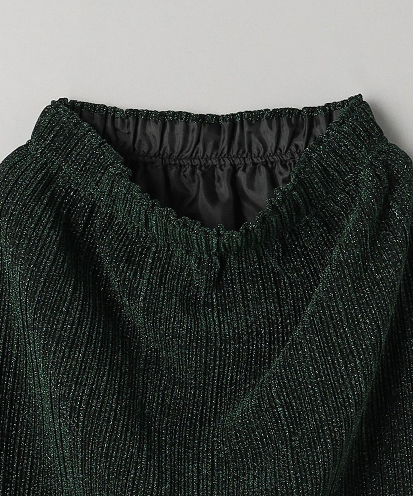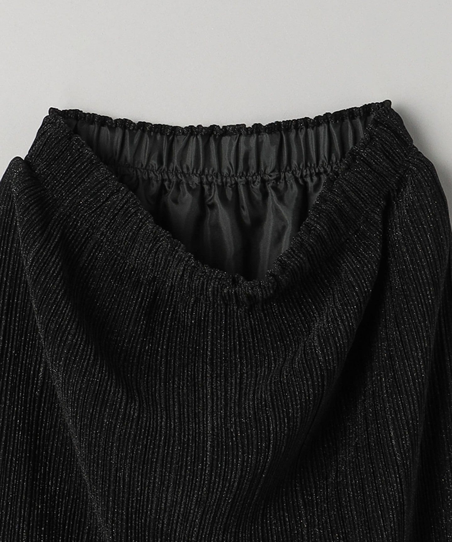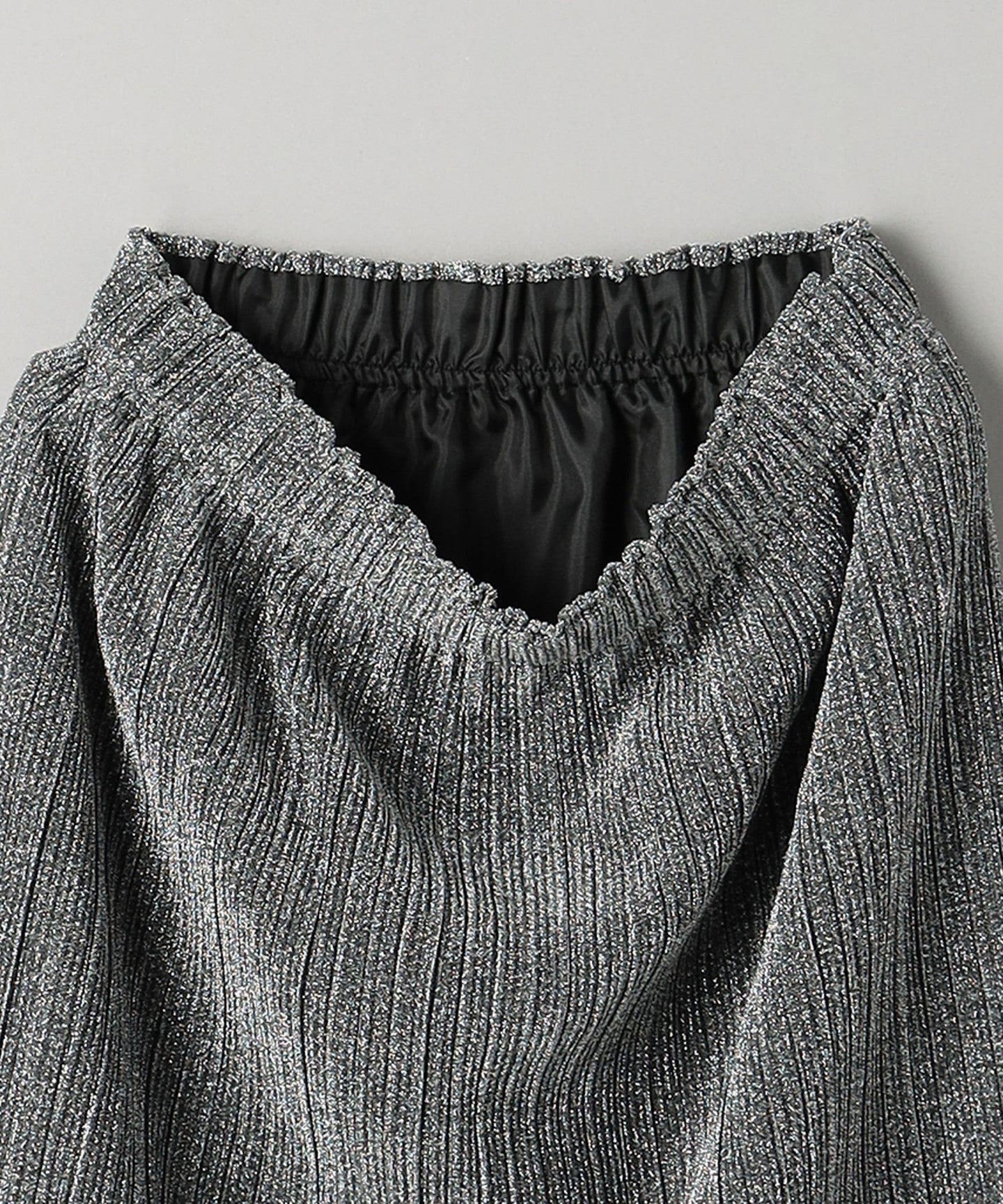 The jersey material is made with finely and densely packed glitter yarn and has been pleated.