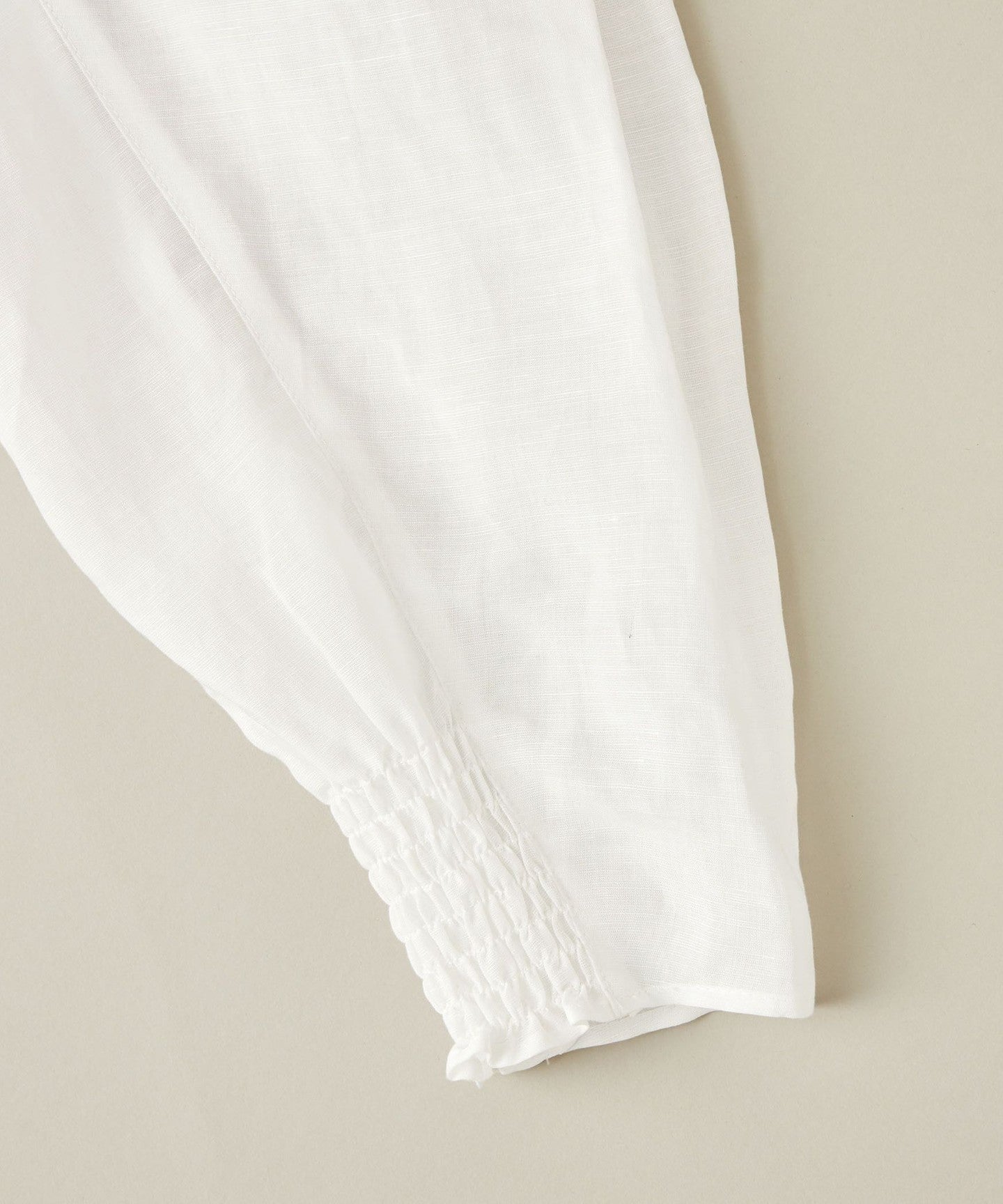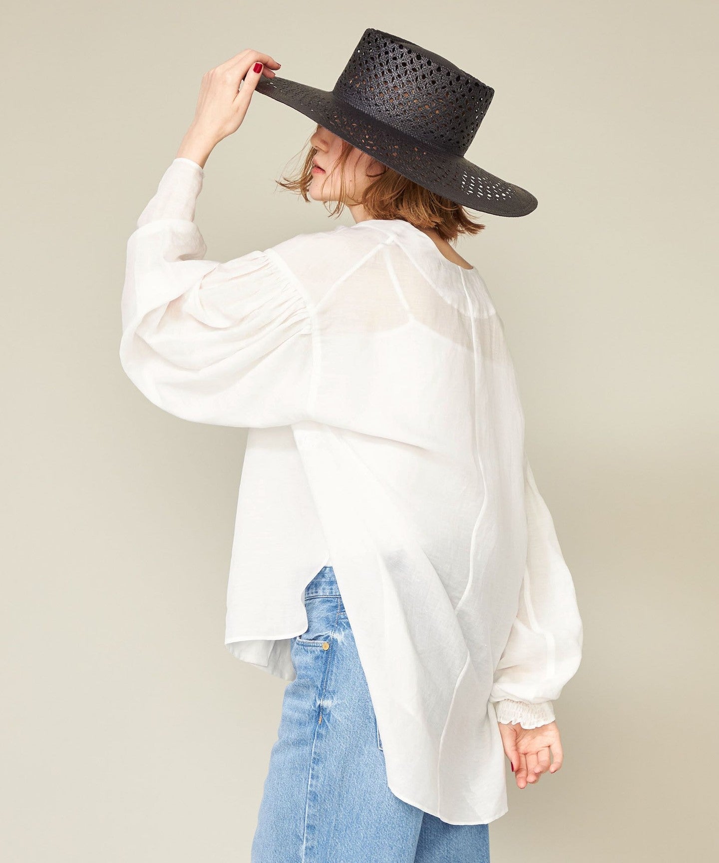 A blouse that looks like a wrap, with attention to detail in the pattern cutting and on the shoulders and cuffs.
