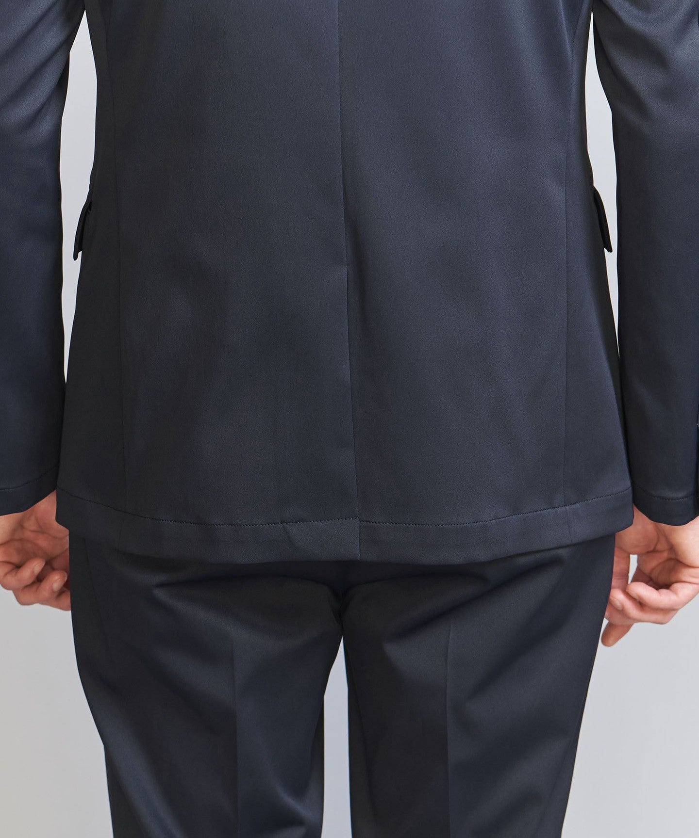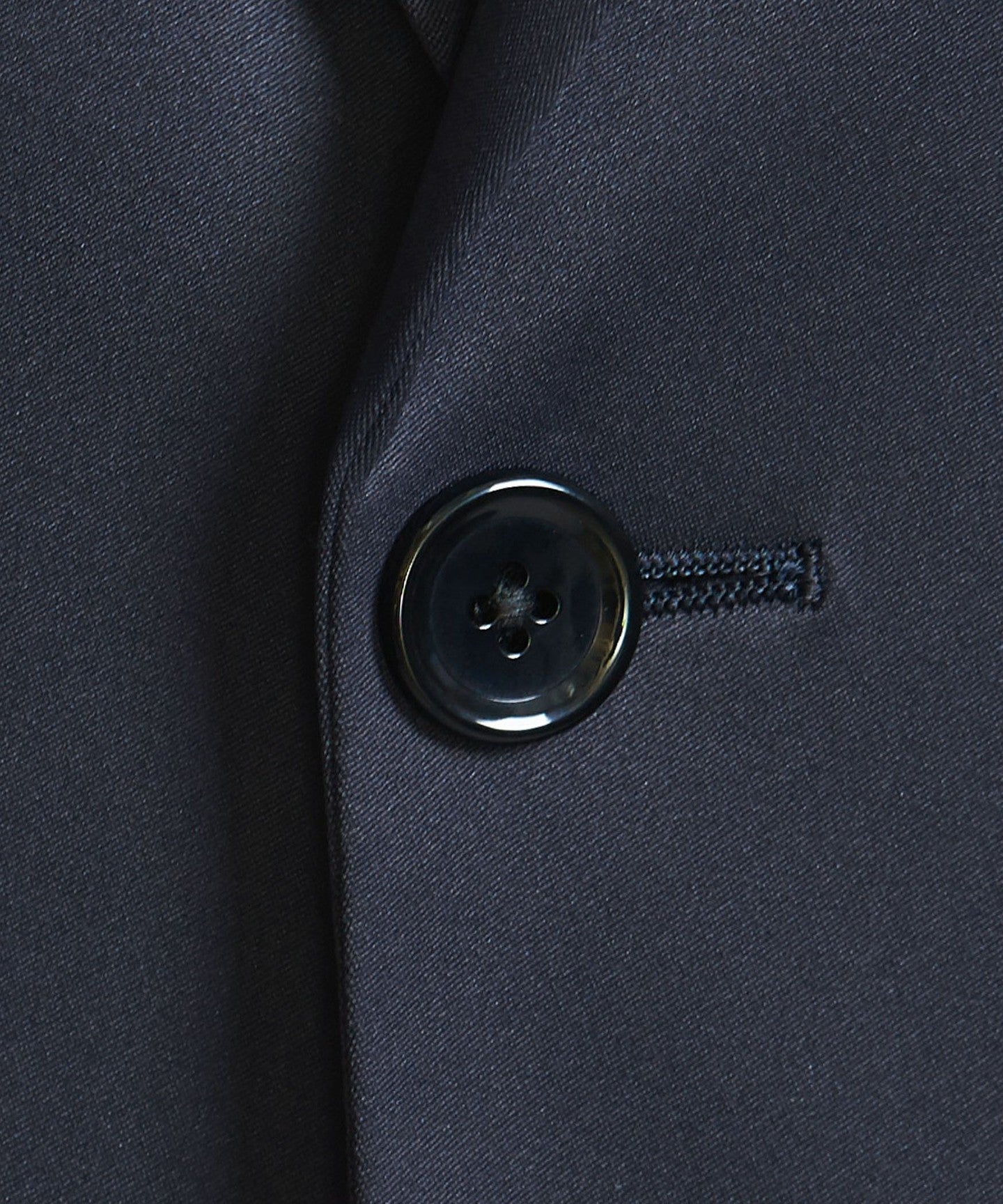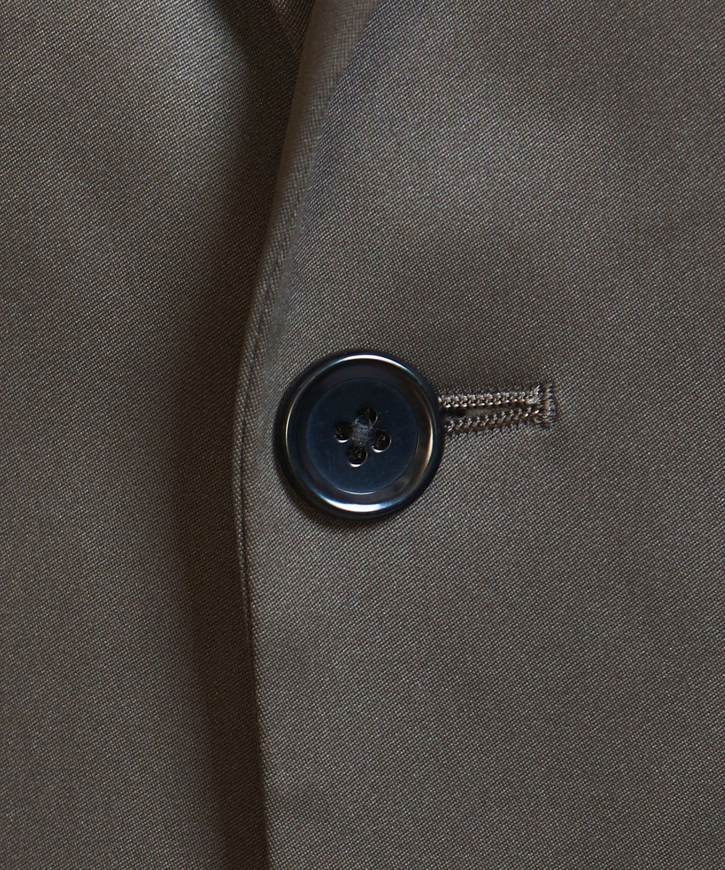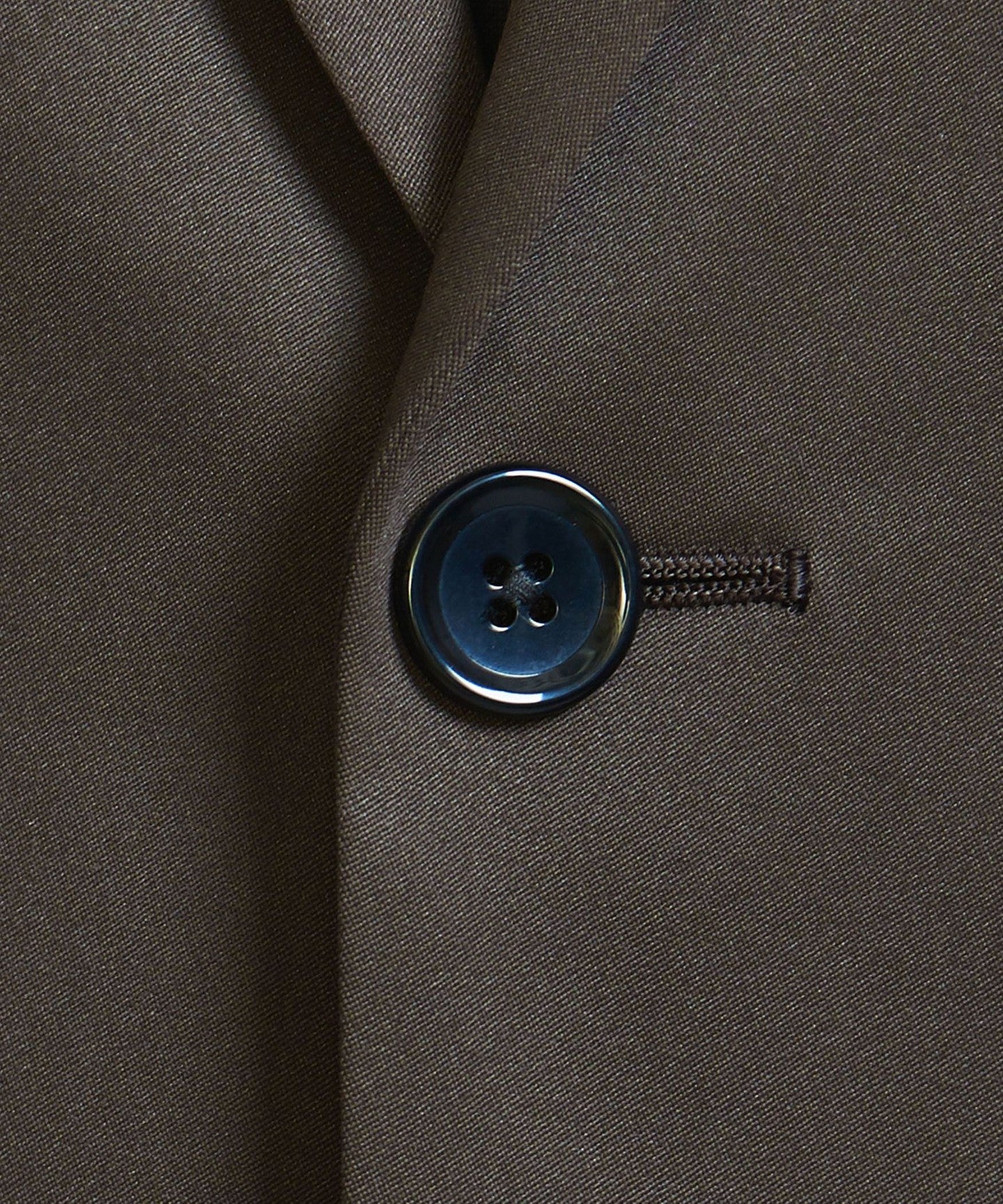 Details include a single 2-button closure, 2-button opening at the cuffs, center vent, notch lapel, double flap pockets, and left and right inner pockets.