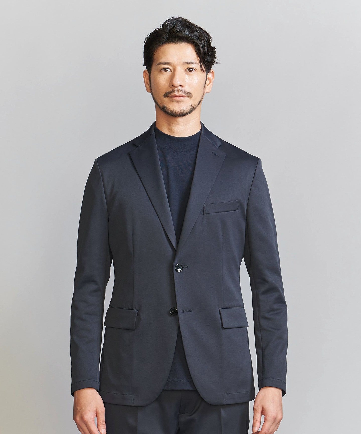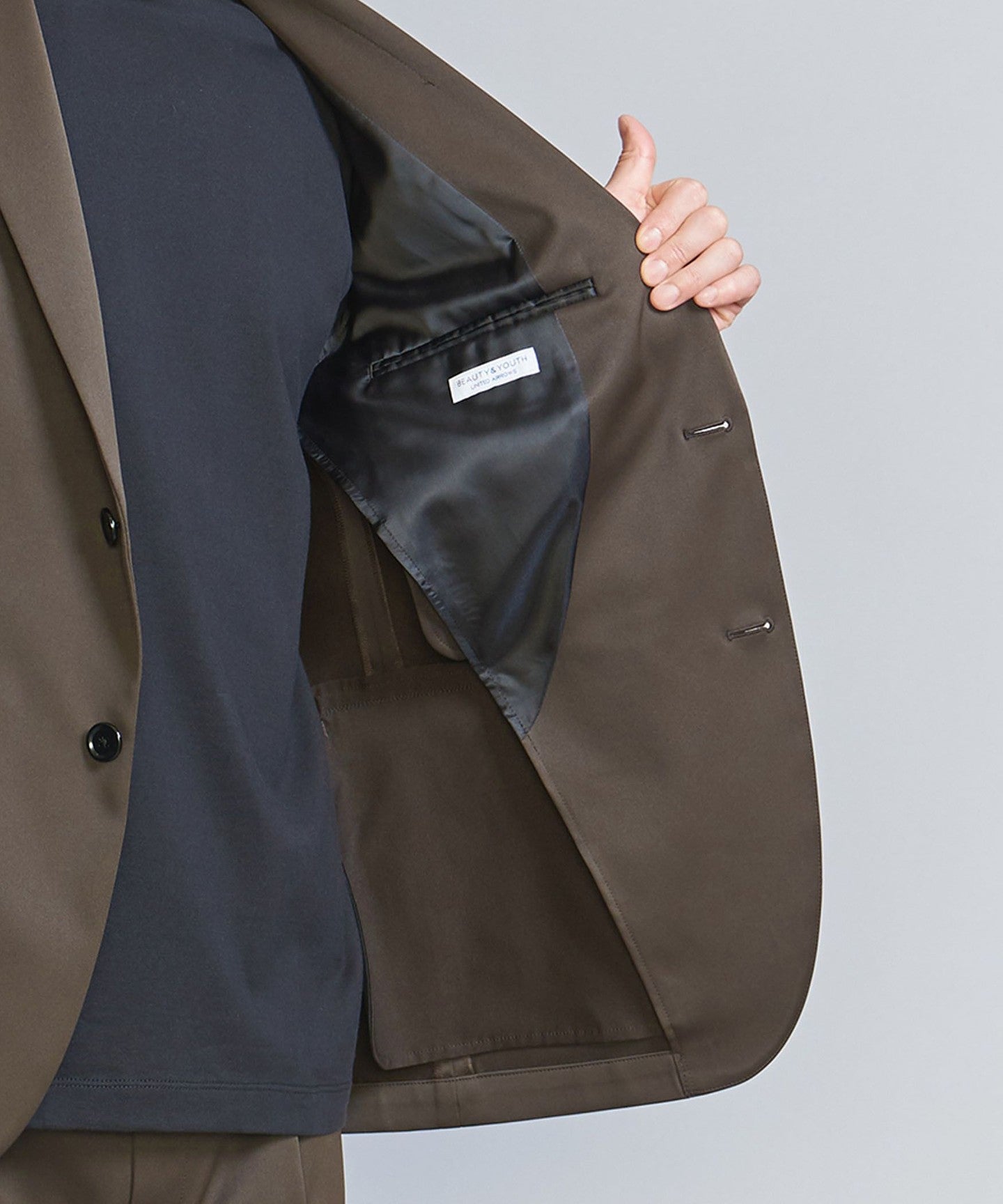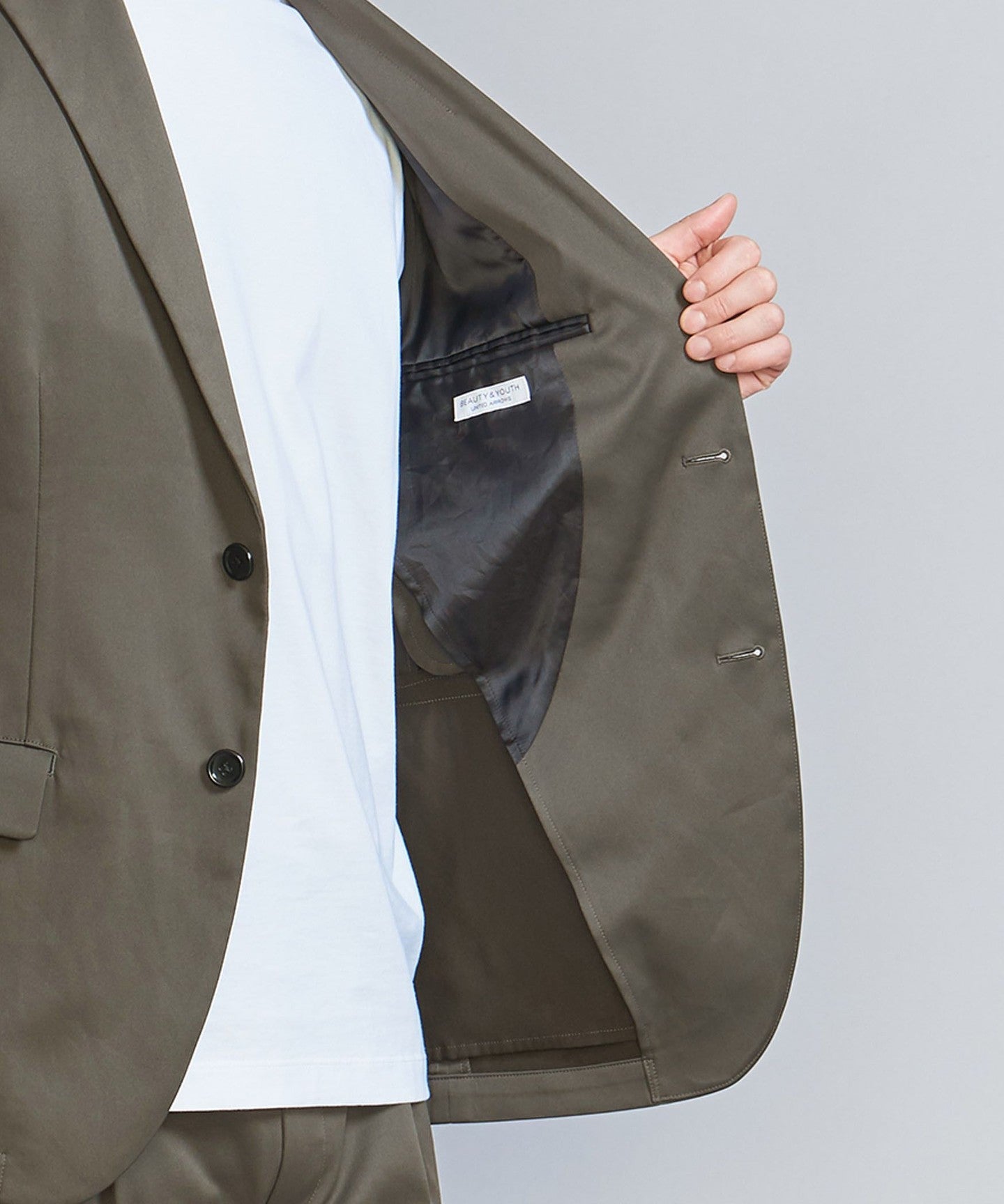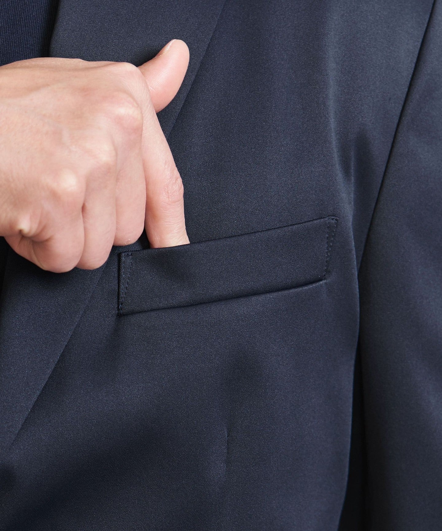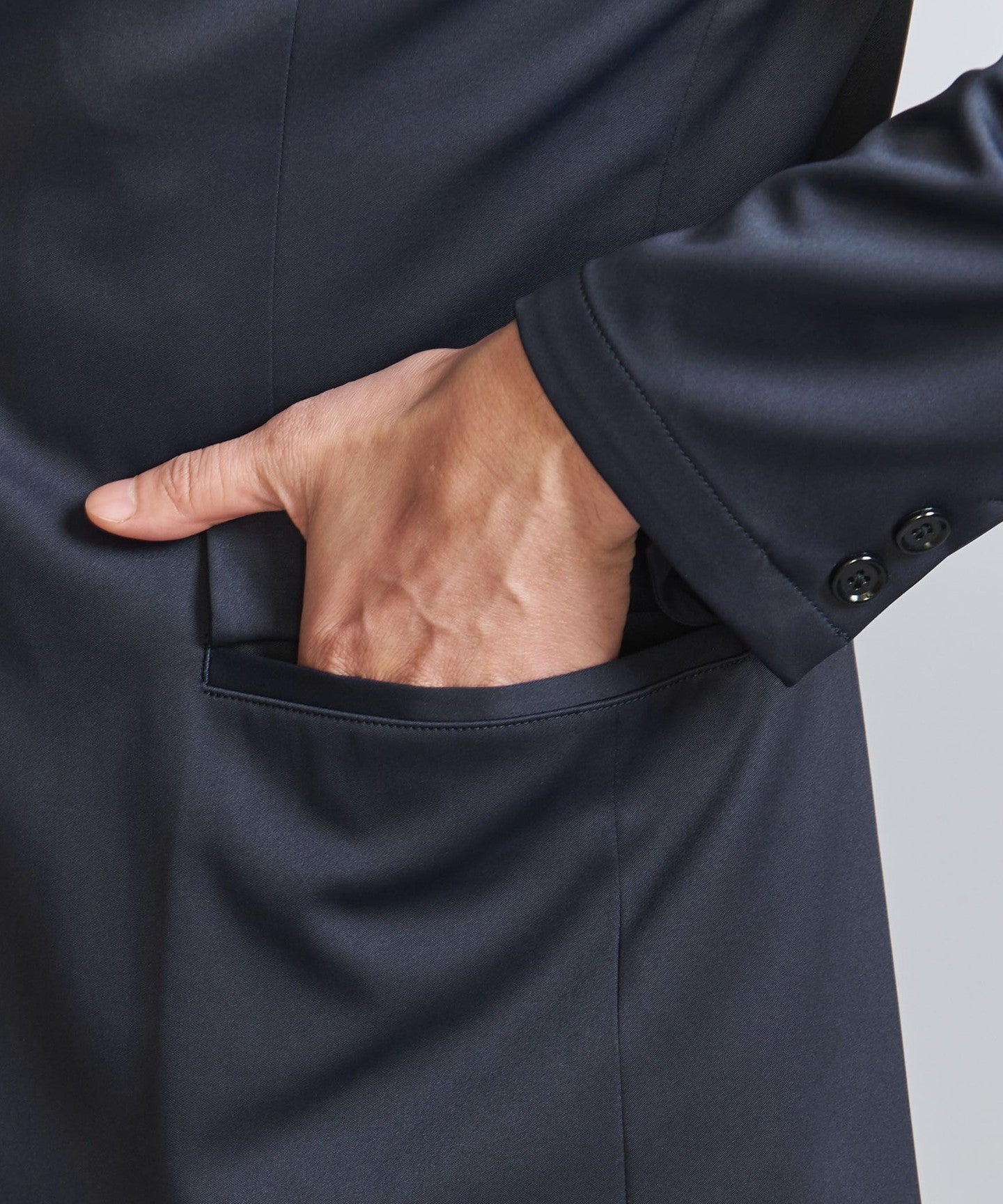 Details include a single 2-button closure, 2-button opening at the cuffs, center vent, notch lapel, double flap pockets, and left and right inner pockets.