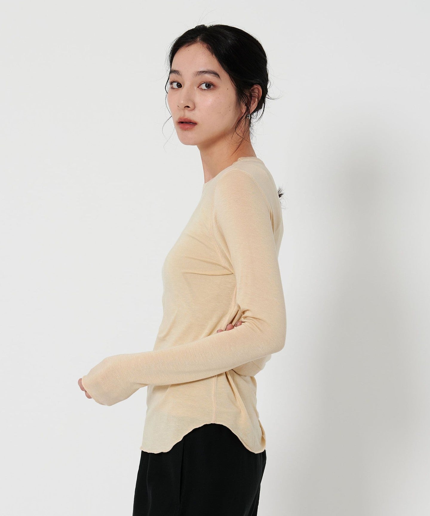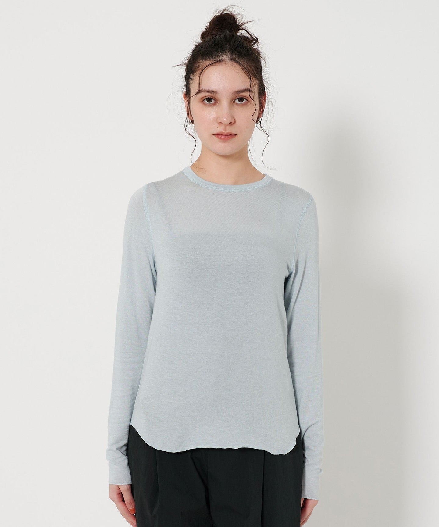 A crew neck cut-and-sew that accentuates femininity and is comfortable to wear.