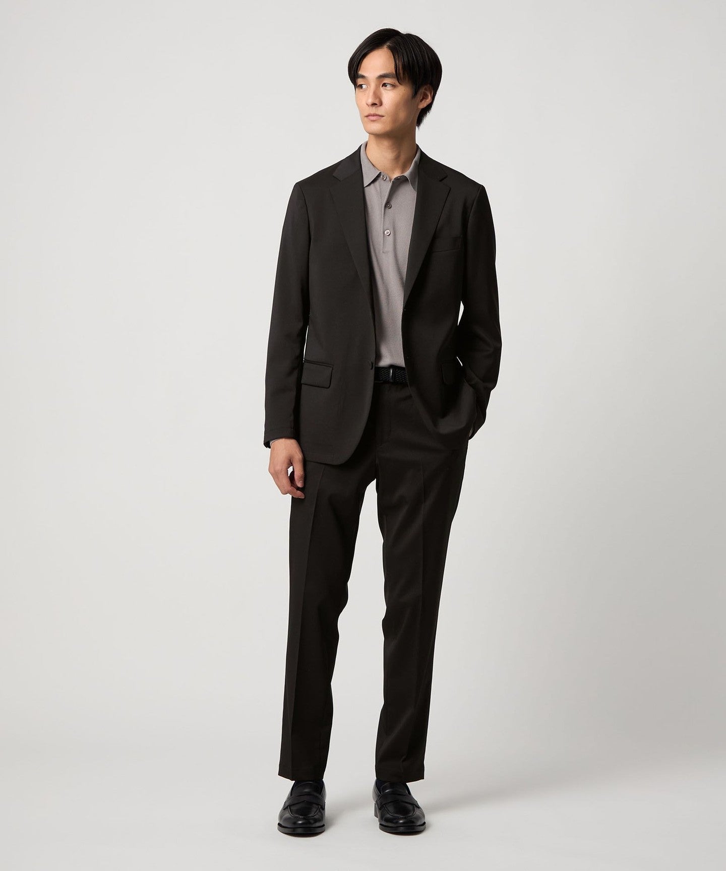 A single-breasted two-button jacket that provides a comfortable fit while still maintaining a neat appearance.