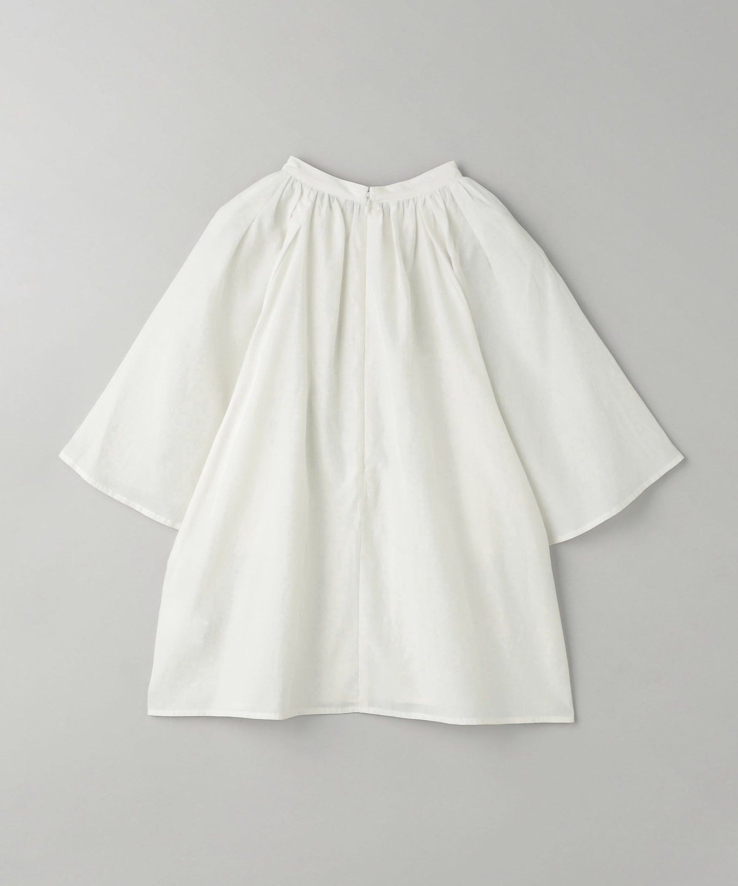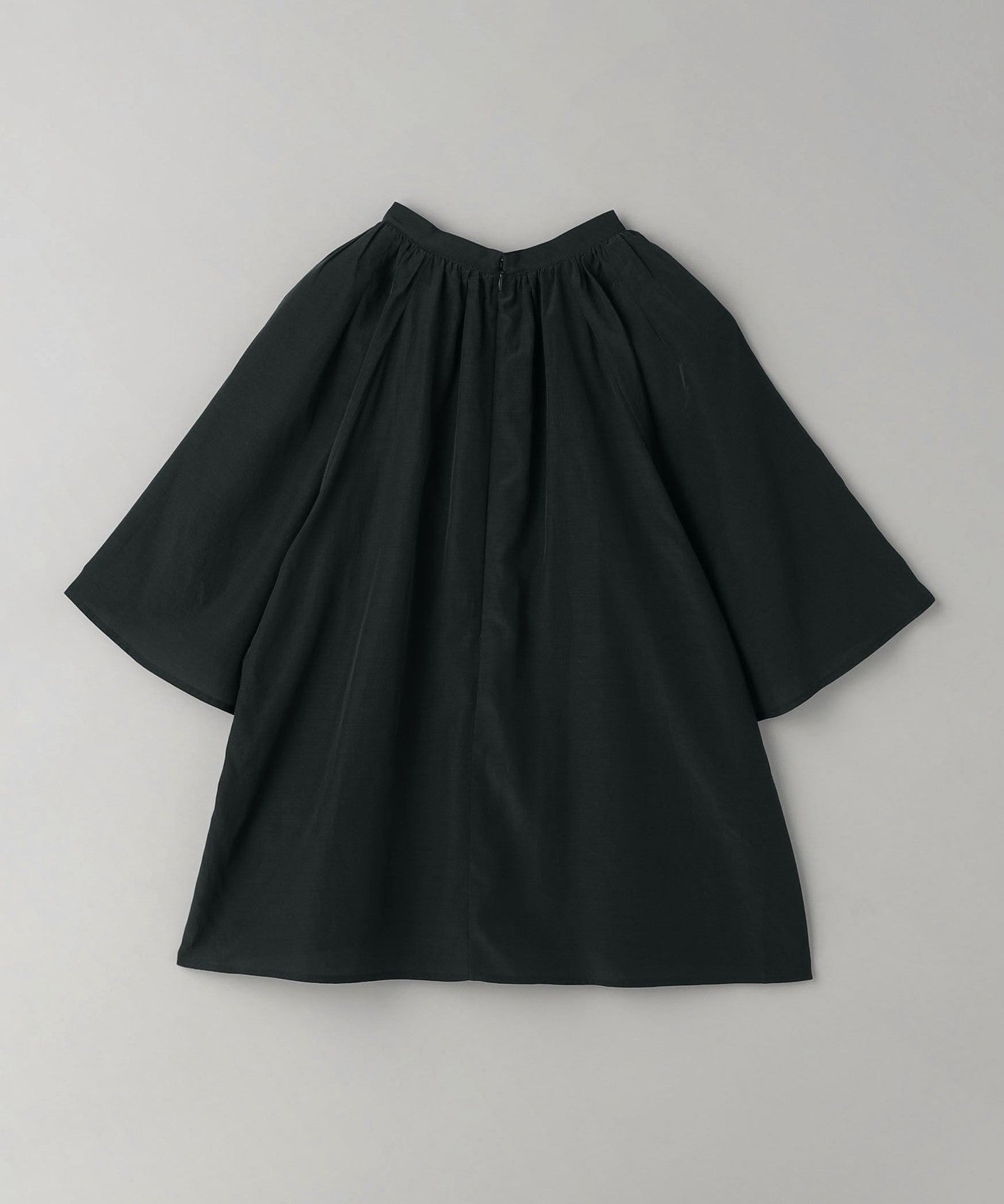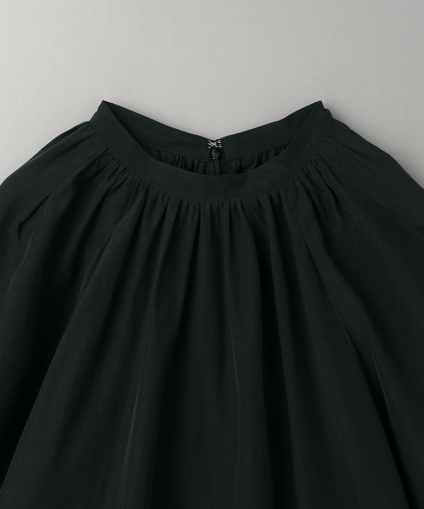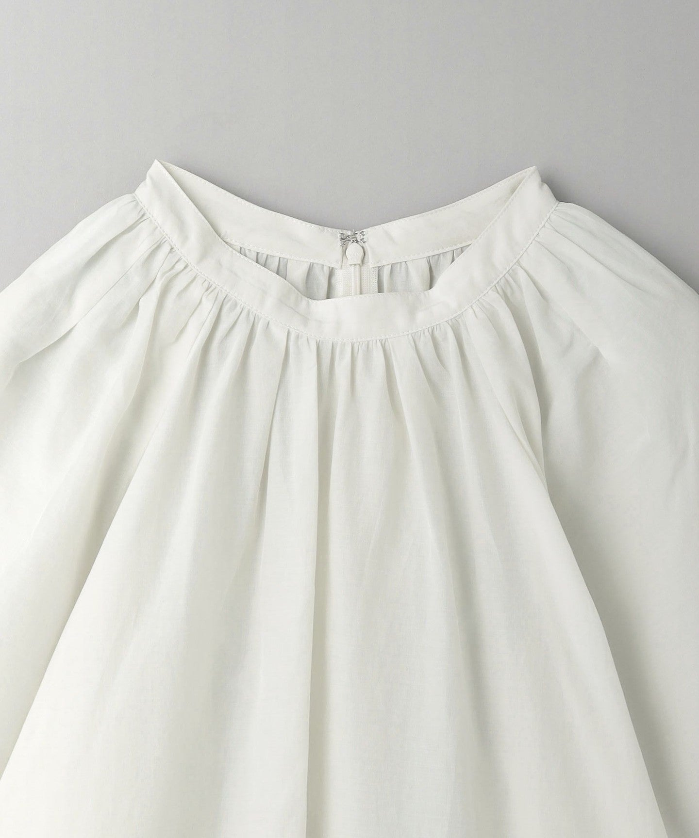 A flared sleeve blouse with a loose stand collar and a concealed opening at the back.
