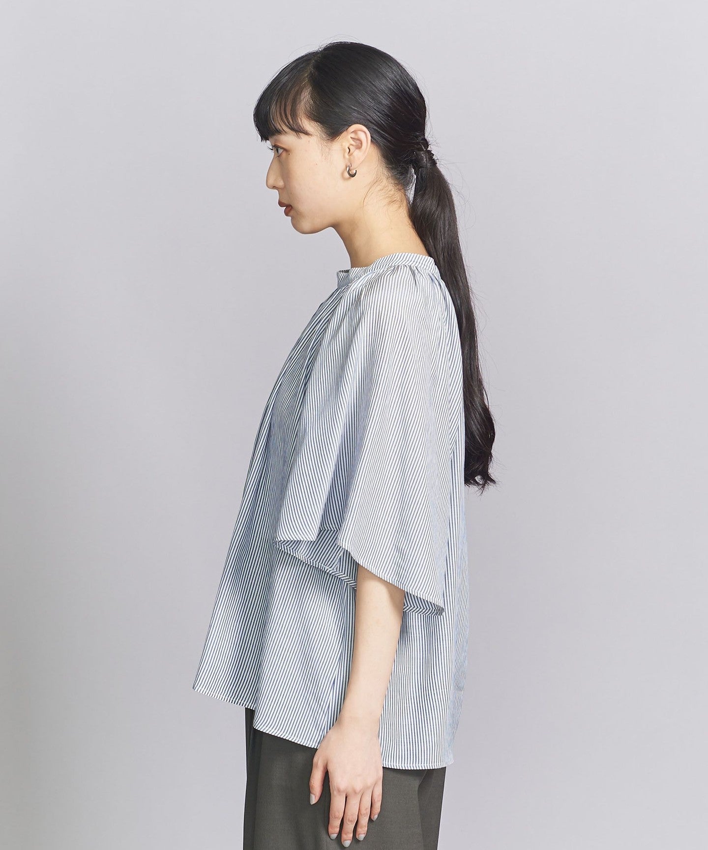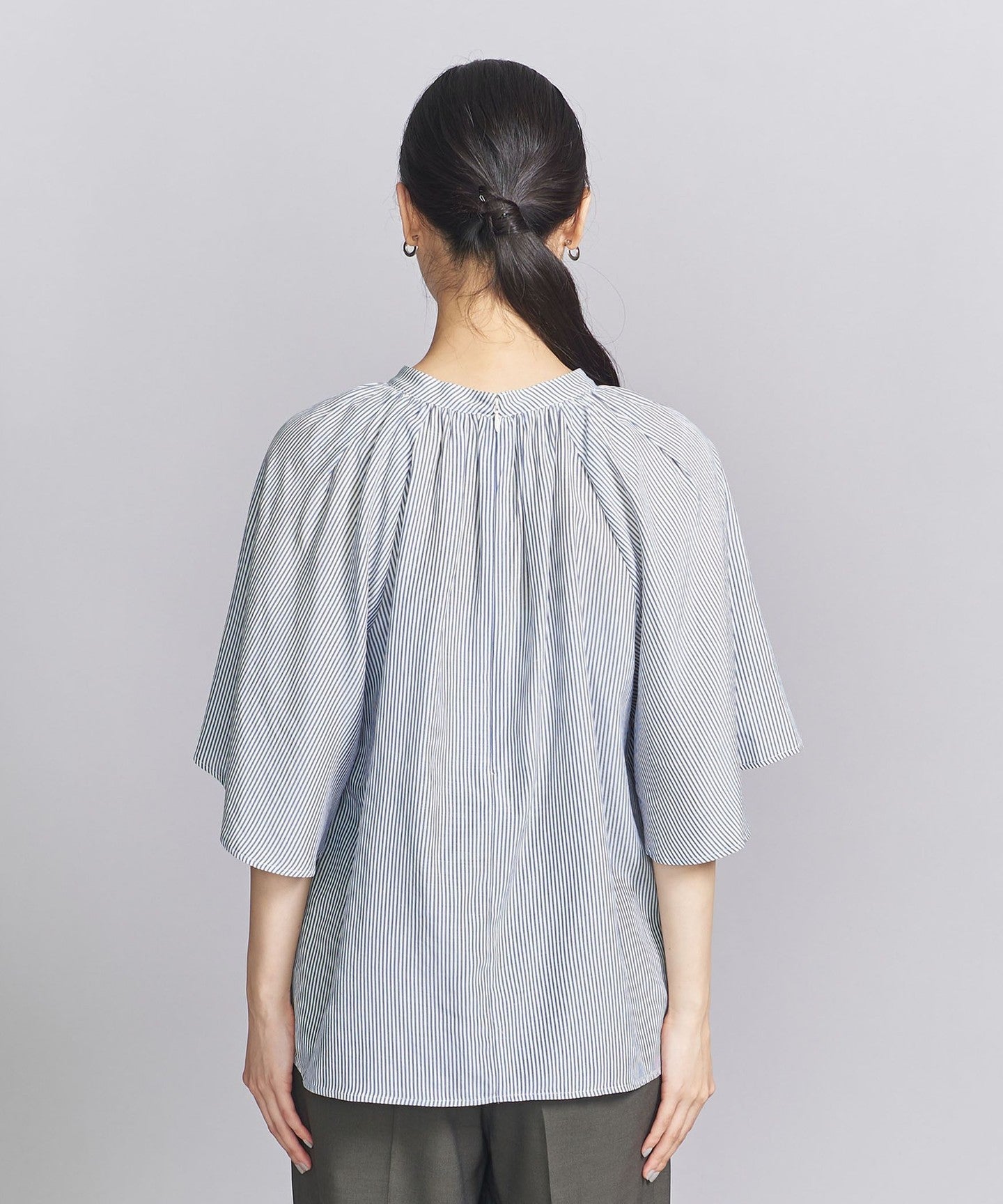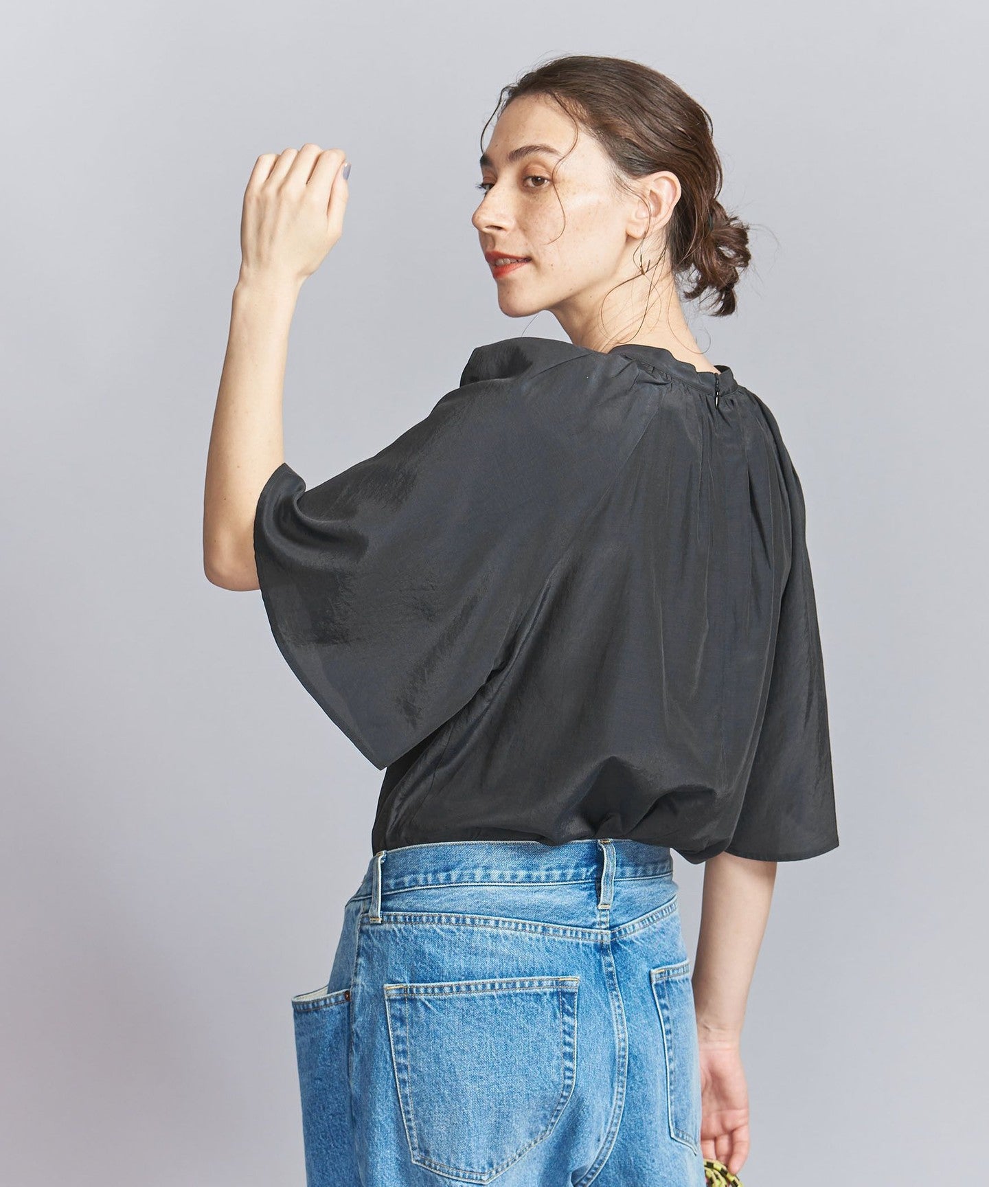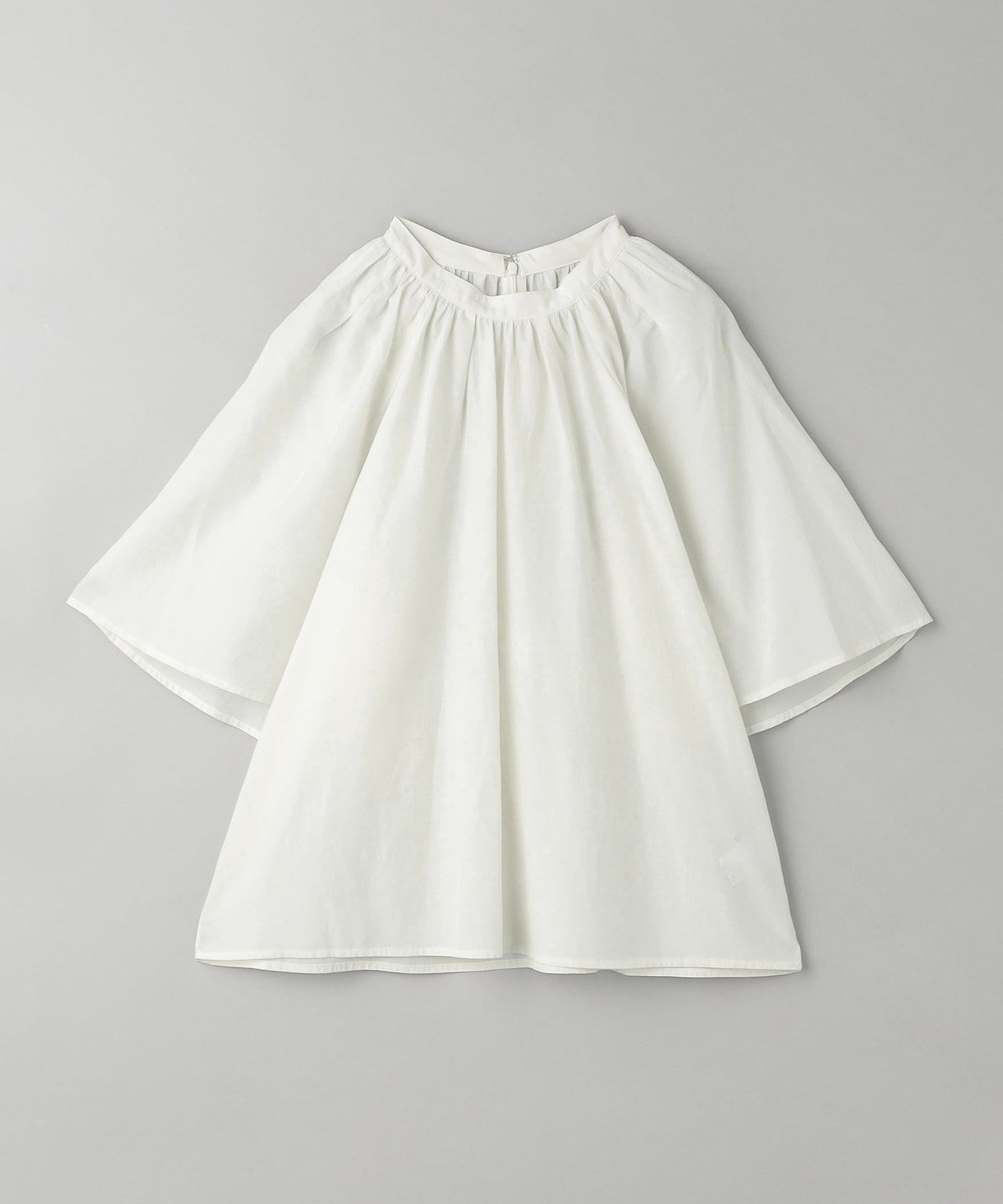 A flared sleeve blouse with a loose stand collar and a concealed opening at the back.