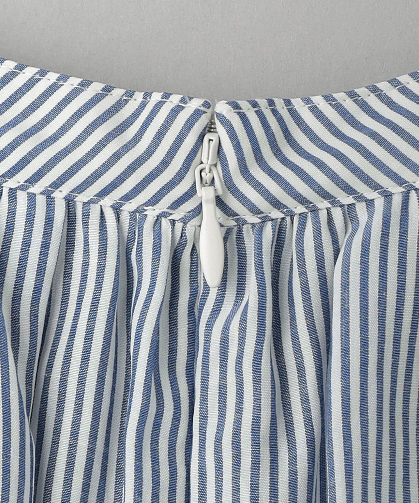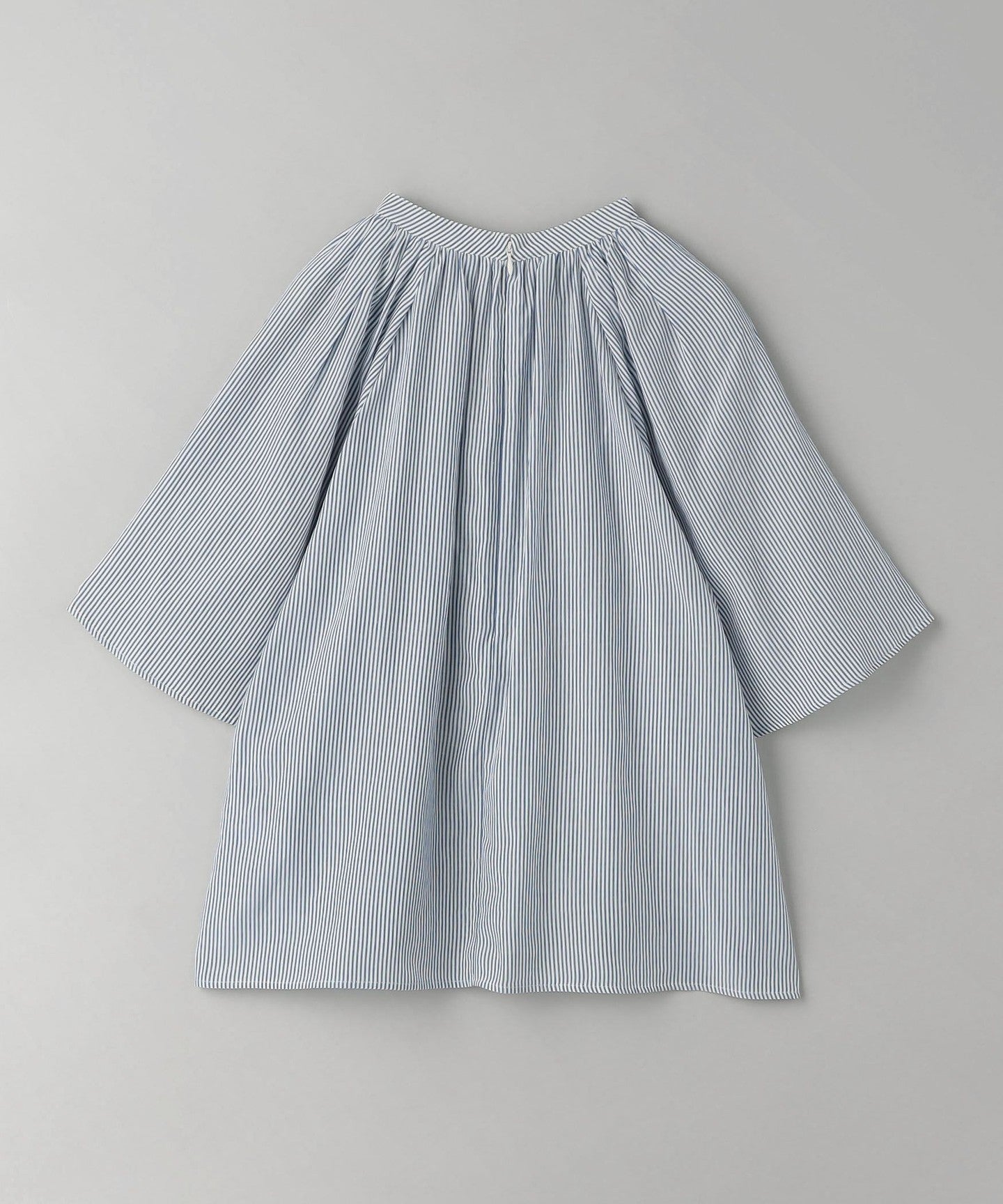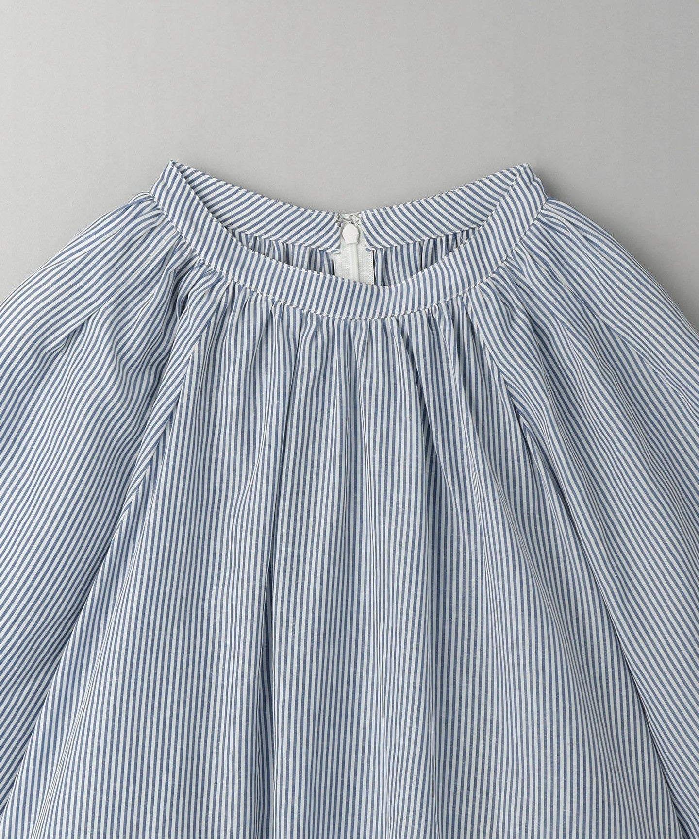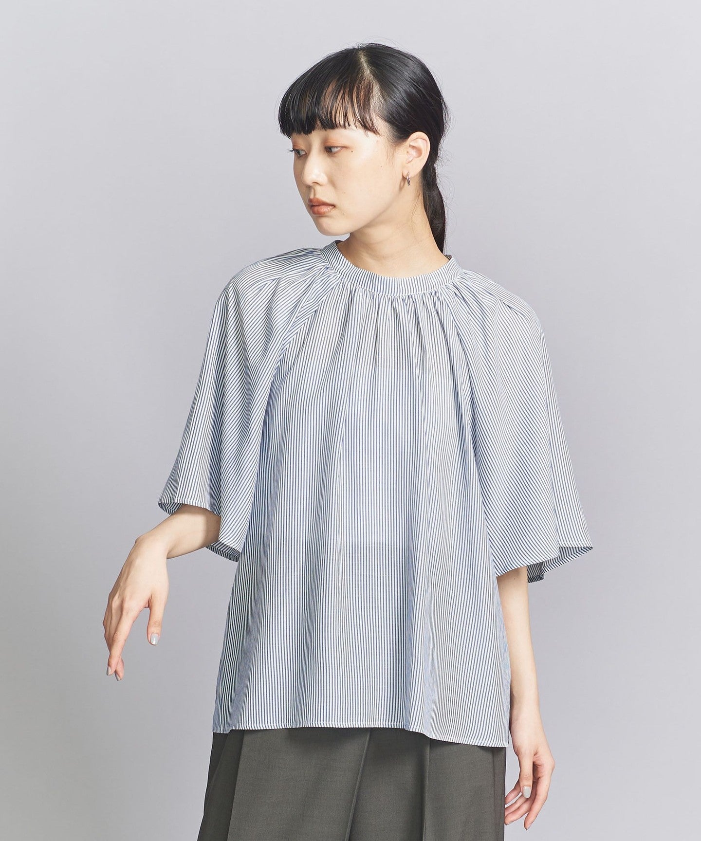 A flared sleeve blouse with a loose stand collar and a concealed opening at the back.