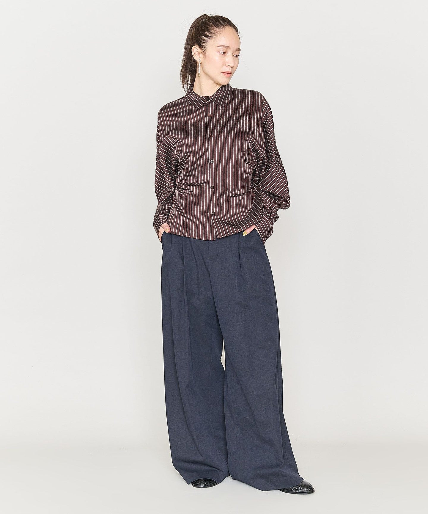 A striped shirt characterized by a balance between curved, voluminous sleeves and a compact body.