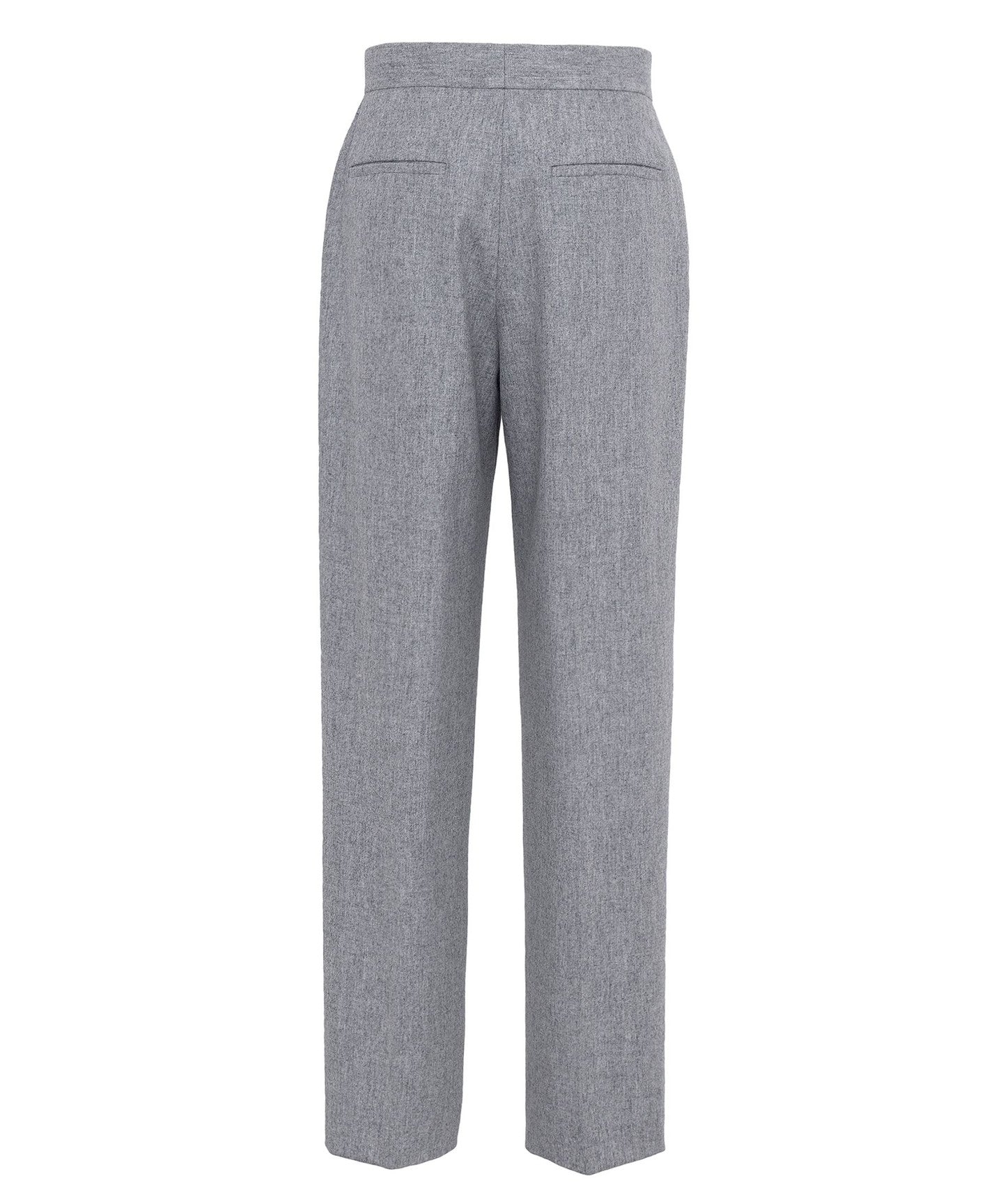 These pants have a tapered silhouette with a deep rise and a curved waist.