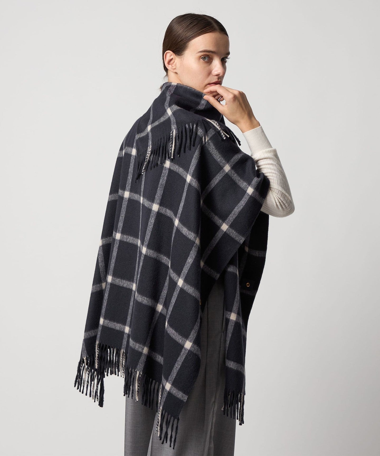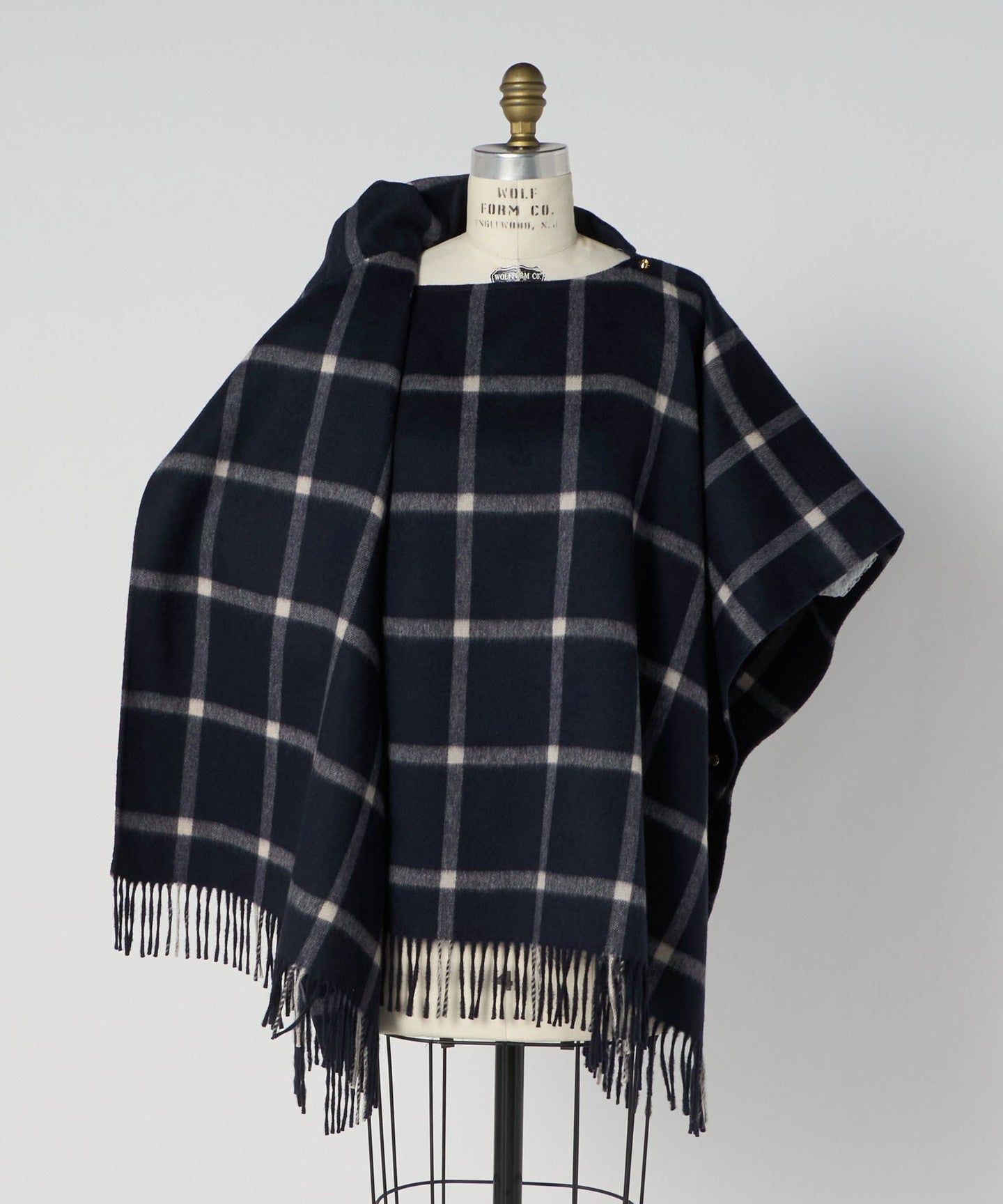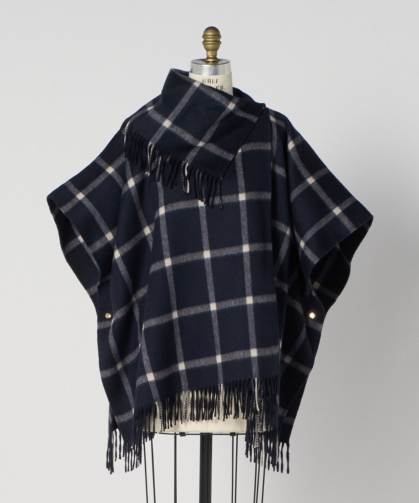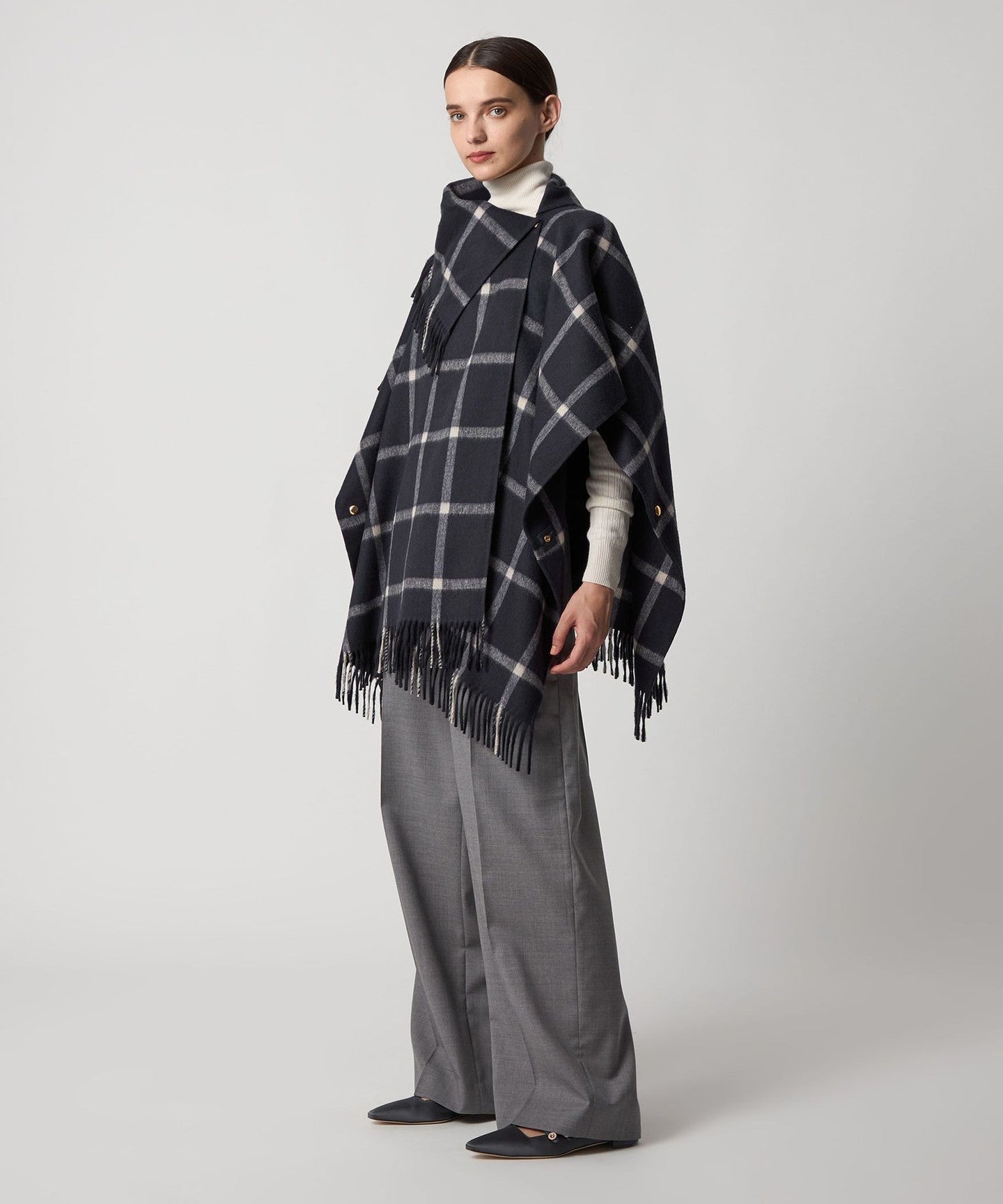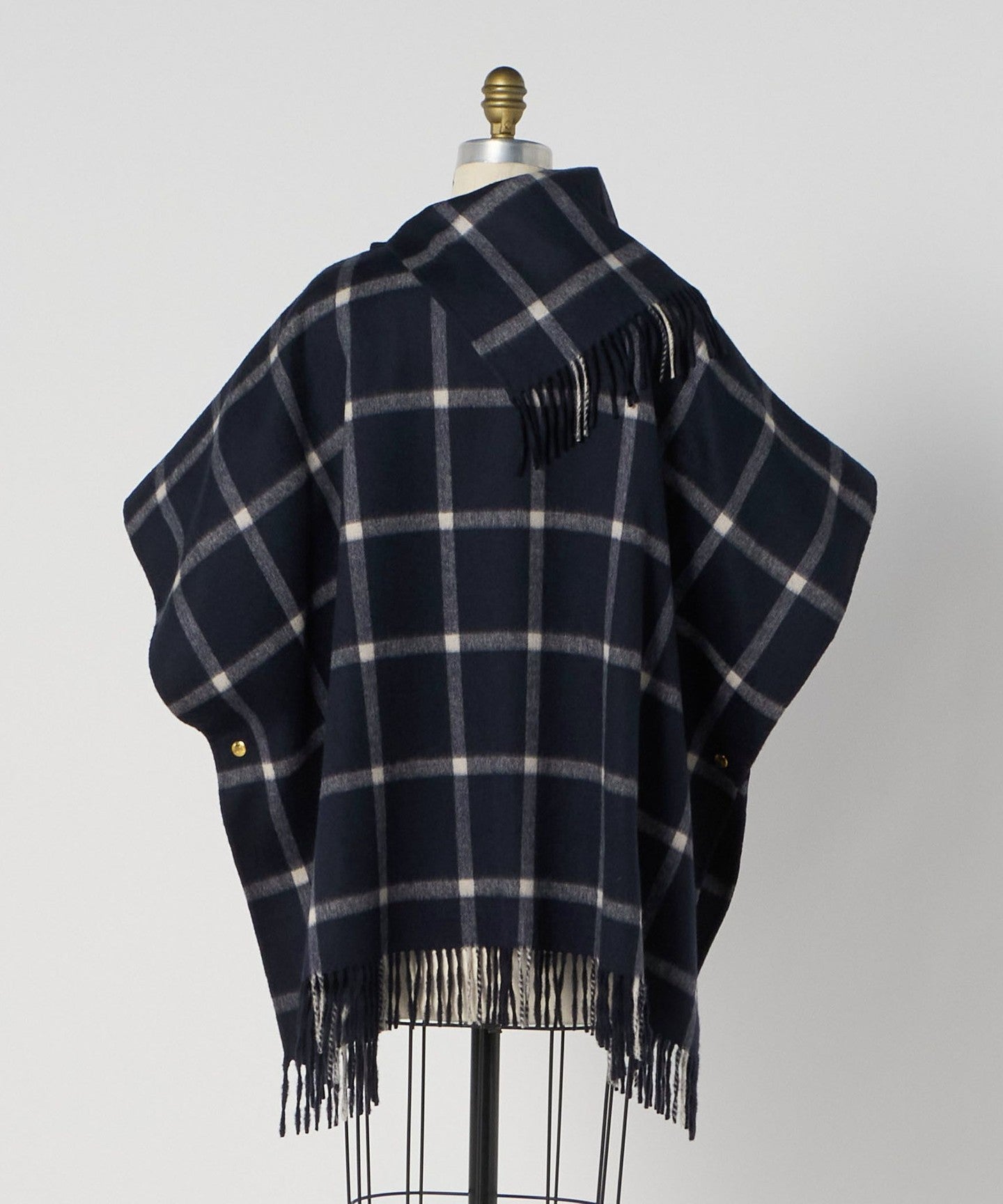 This poncho outerwear features a bold windowpane pattern and fringe, giving it a classic feel.