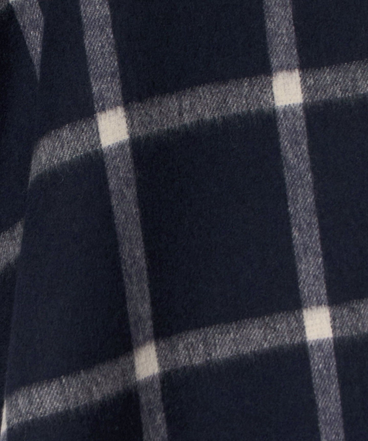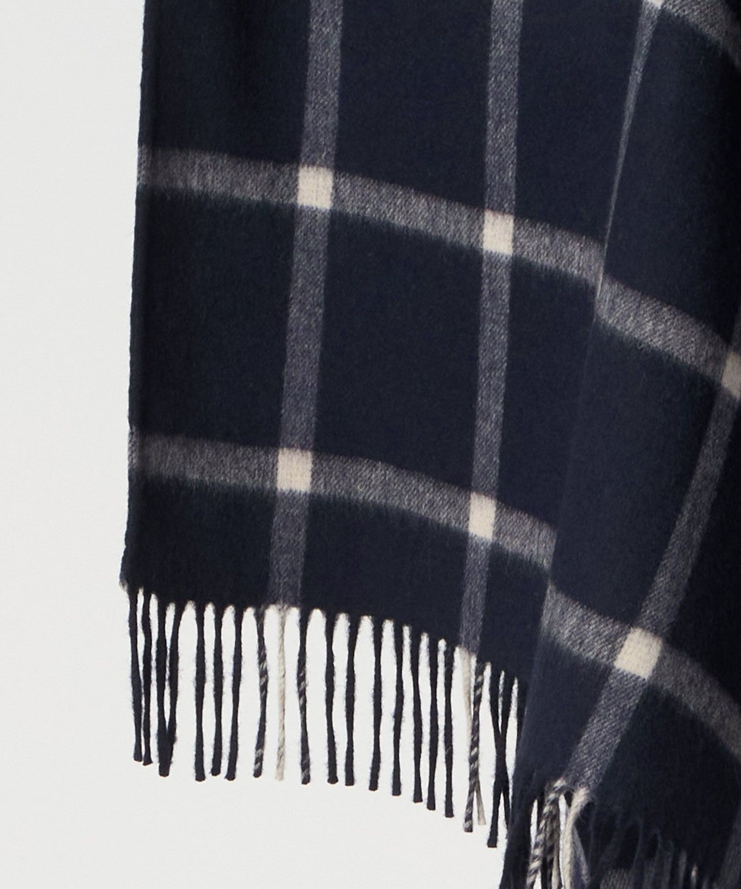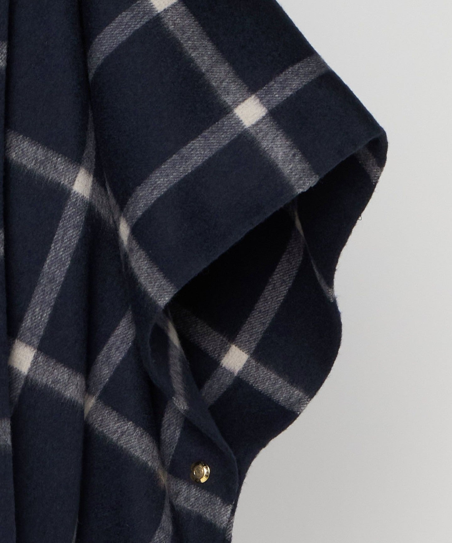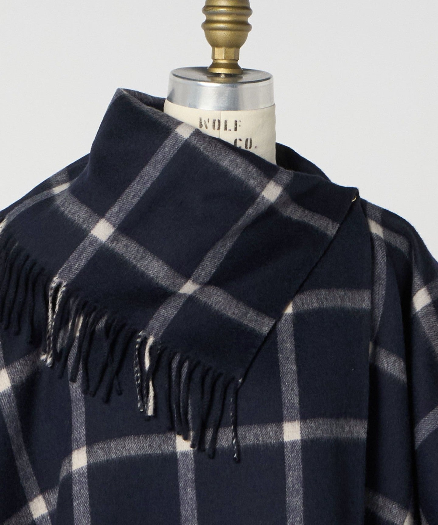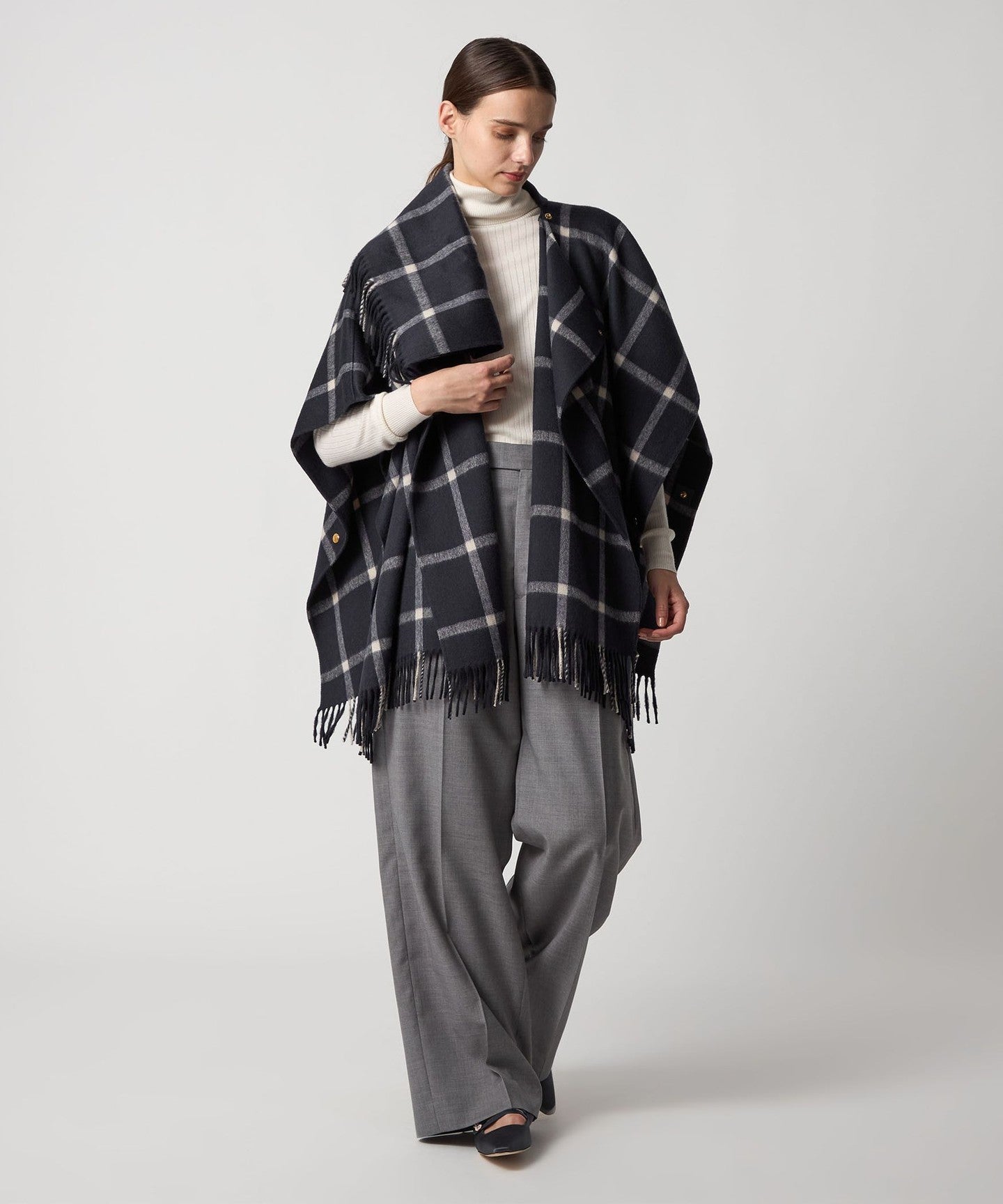 This poncho outerwear features a bold windowpane pattern and fringe, giving it a classic feel.