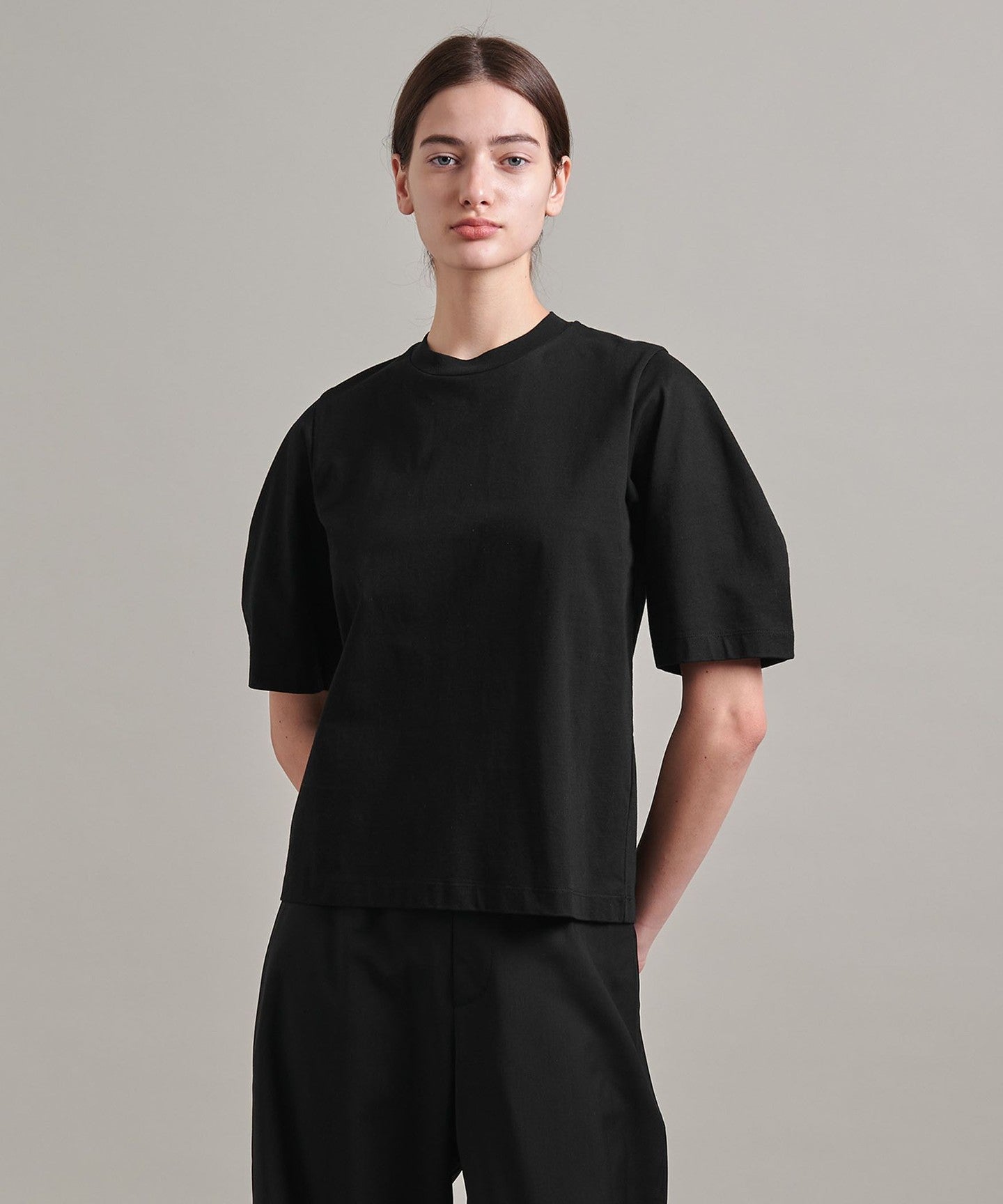 A cut-and-sew top with a short sleeve version of LOEFF's classic crescent sleeve