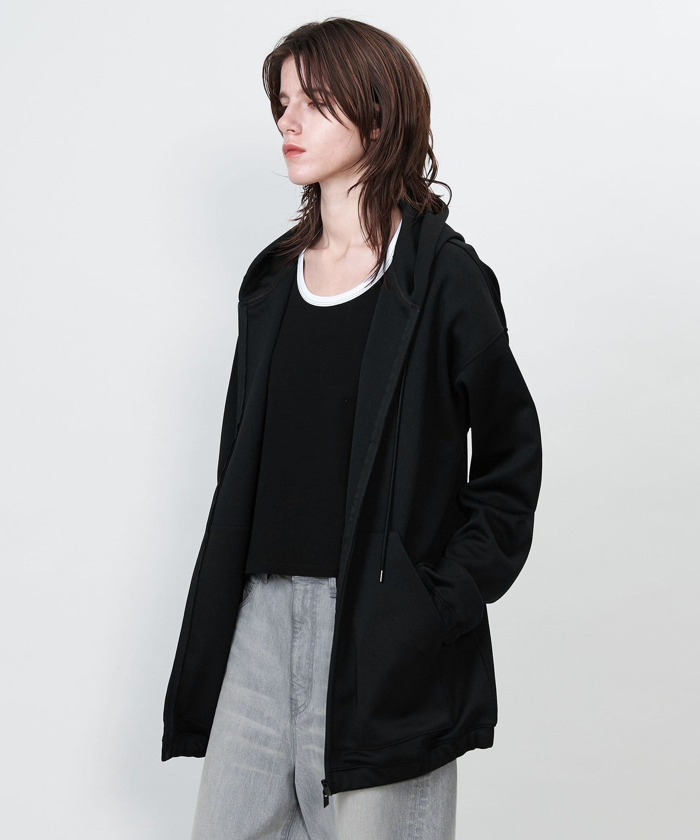A loose-fitting zip-up hoodie suitable for both men and women.