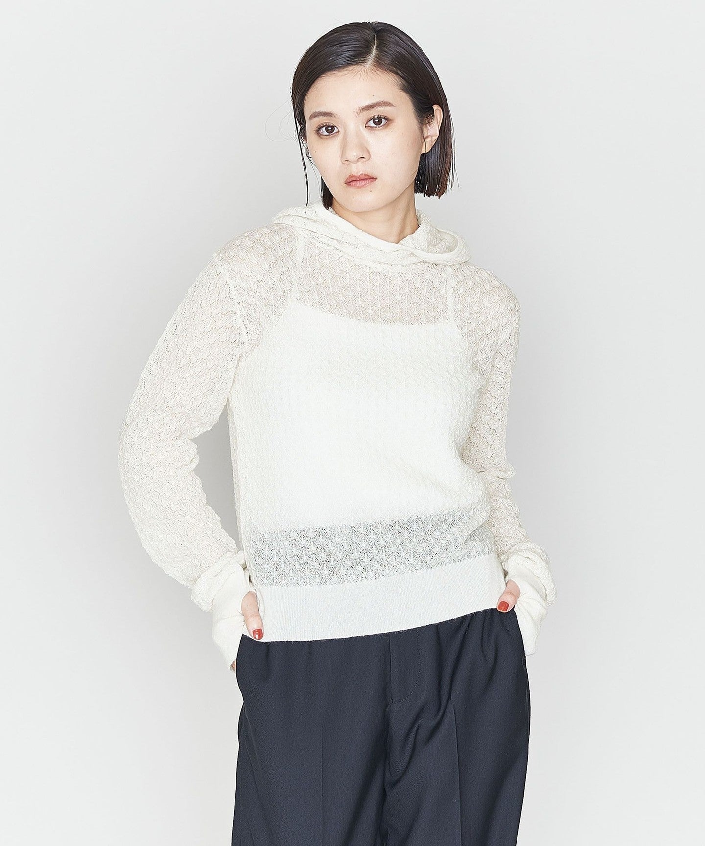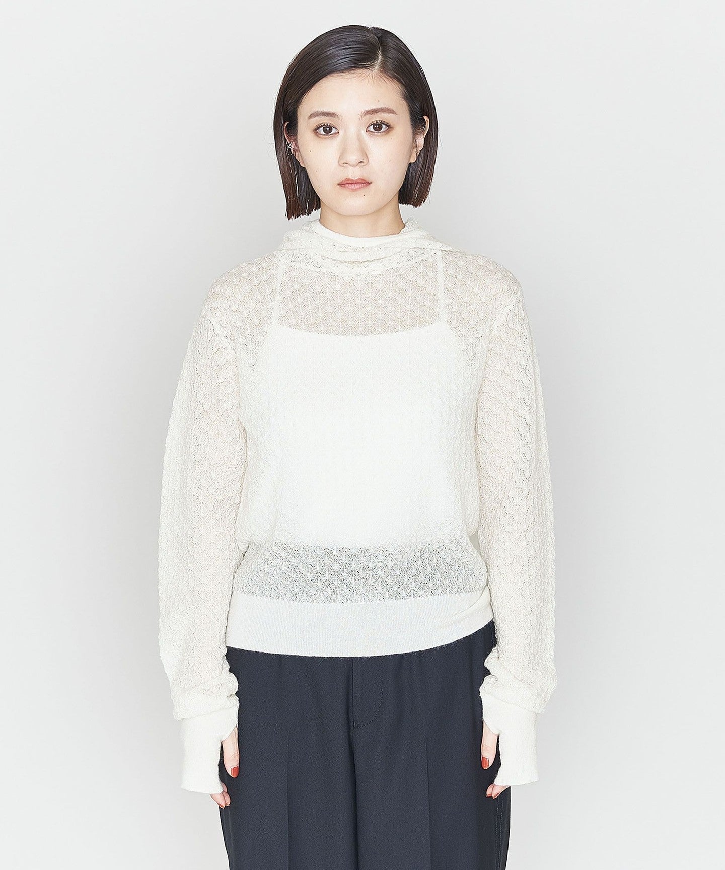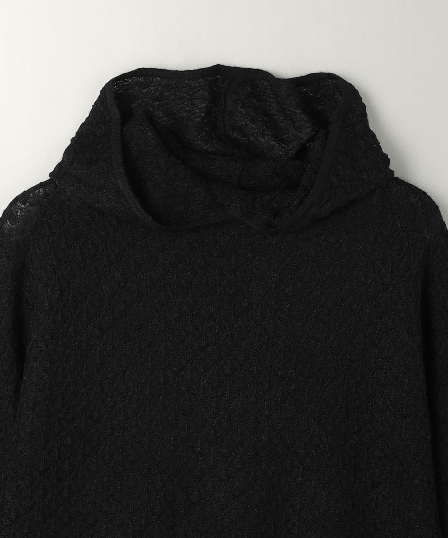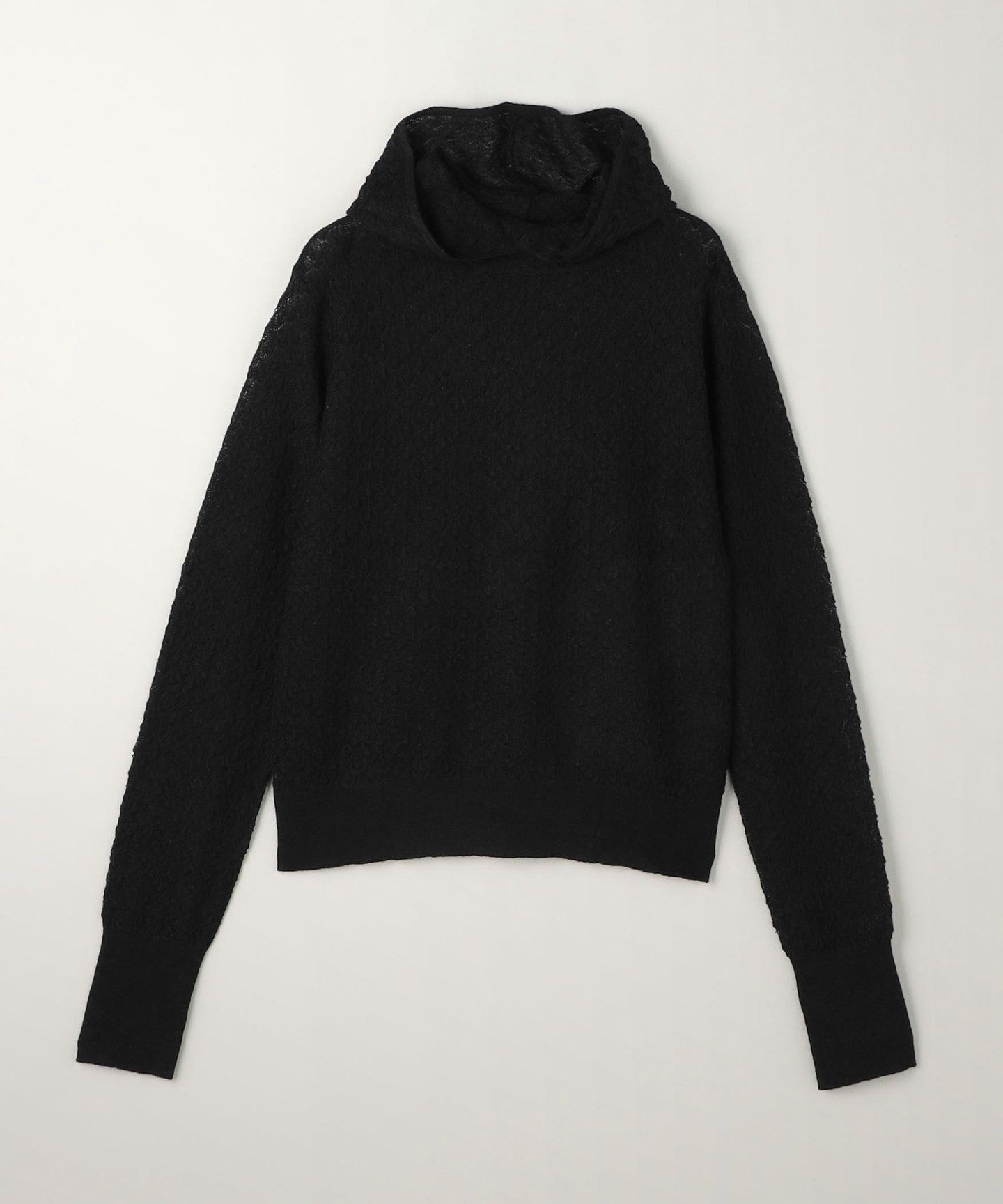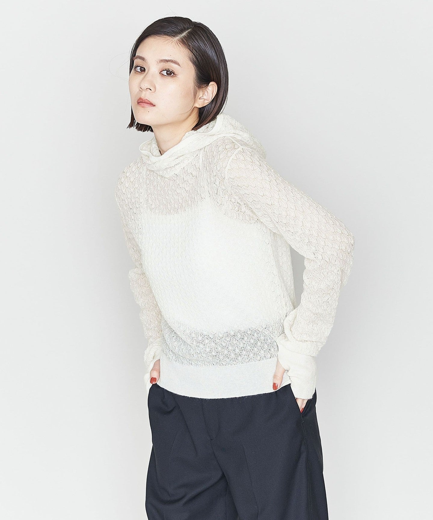 A hooded knit pullover with a light and thin knit that resembles eyelet lace.