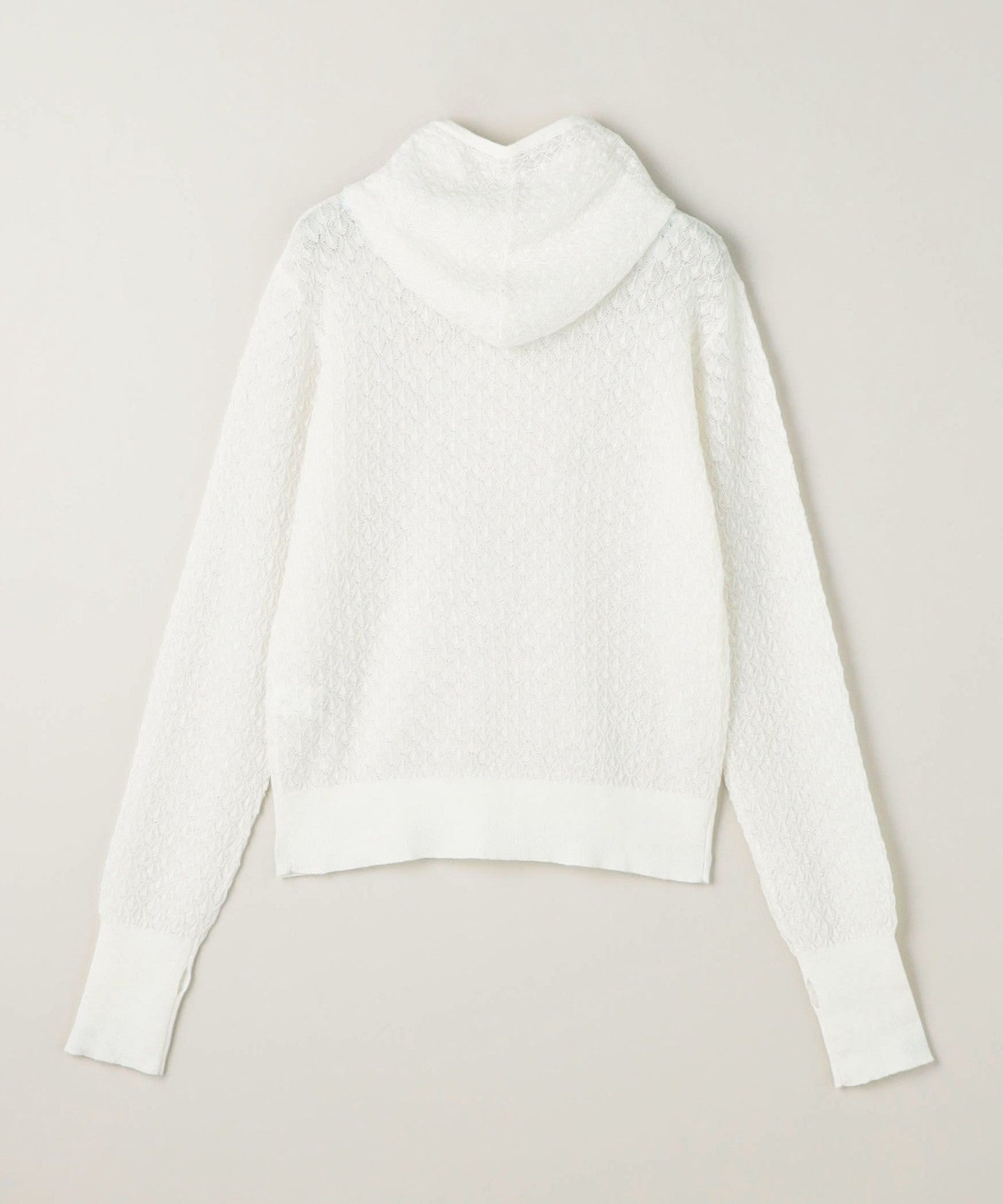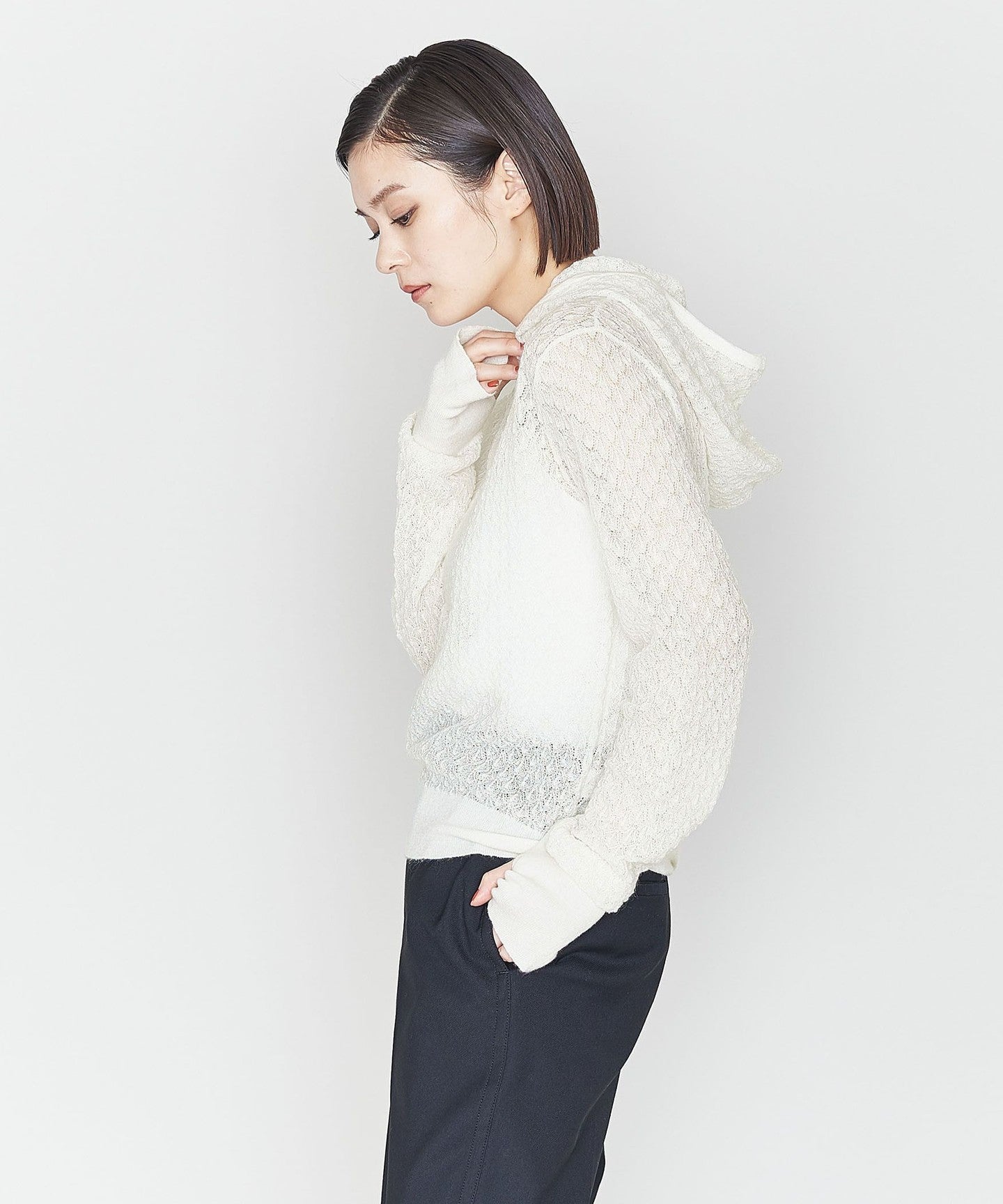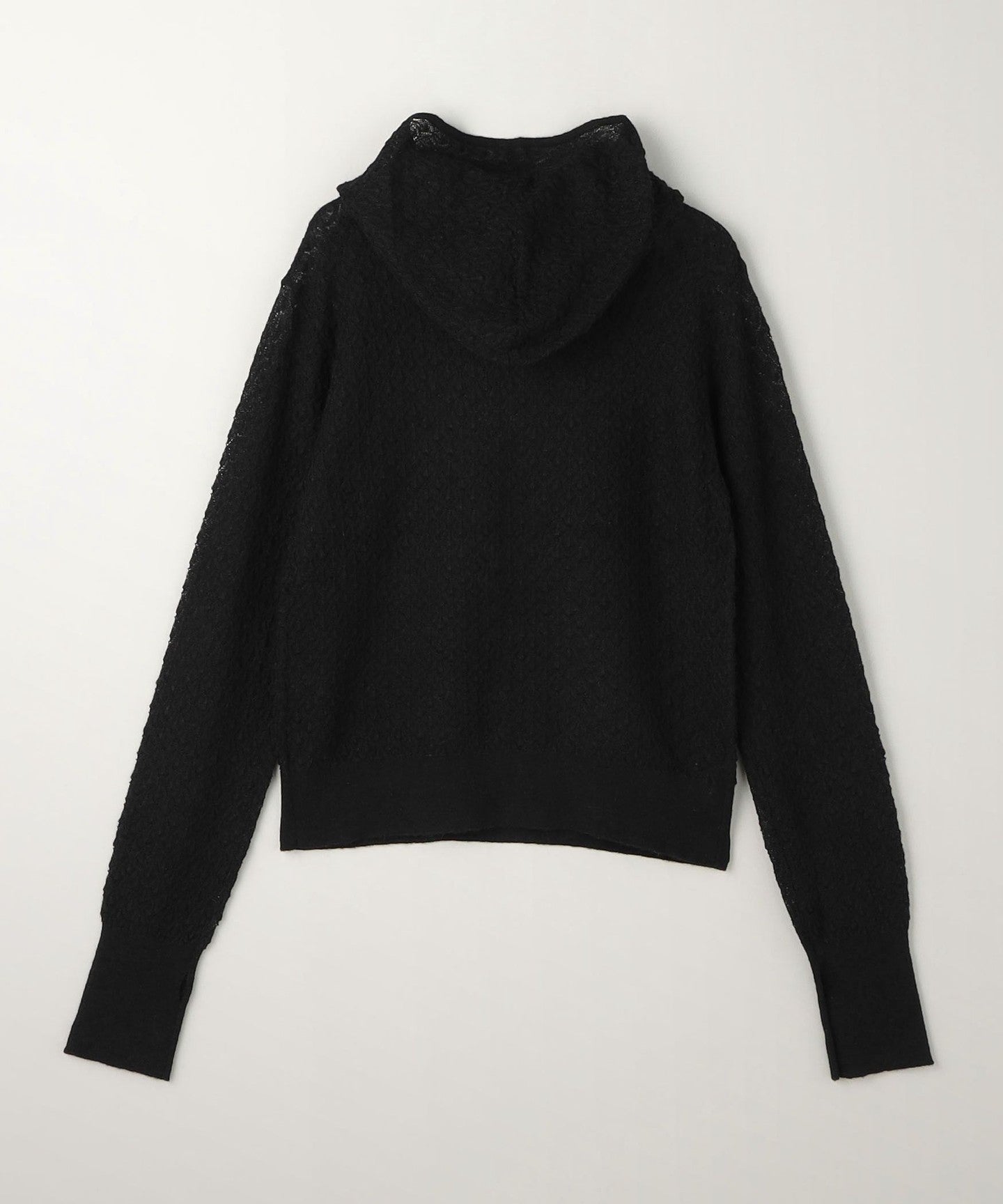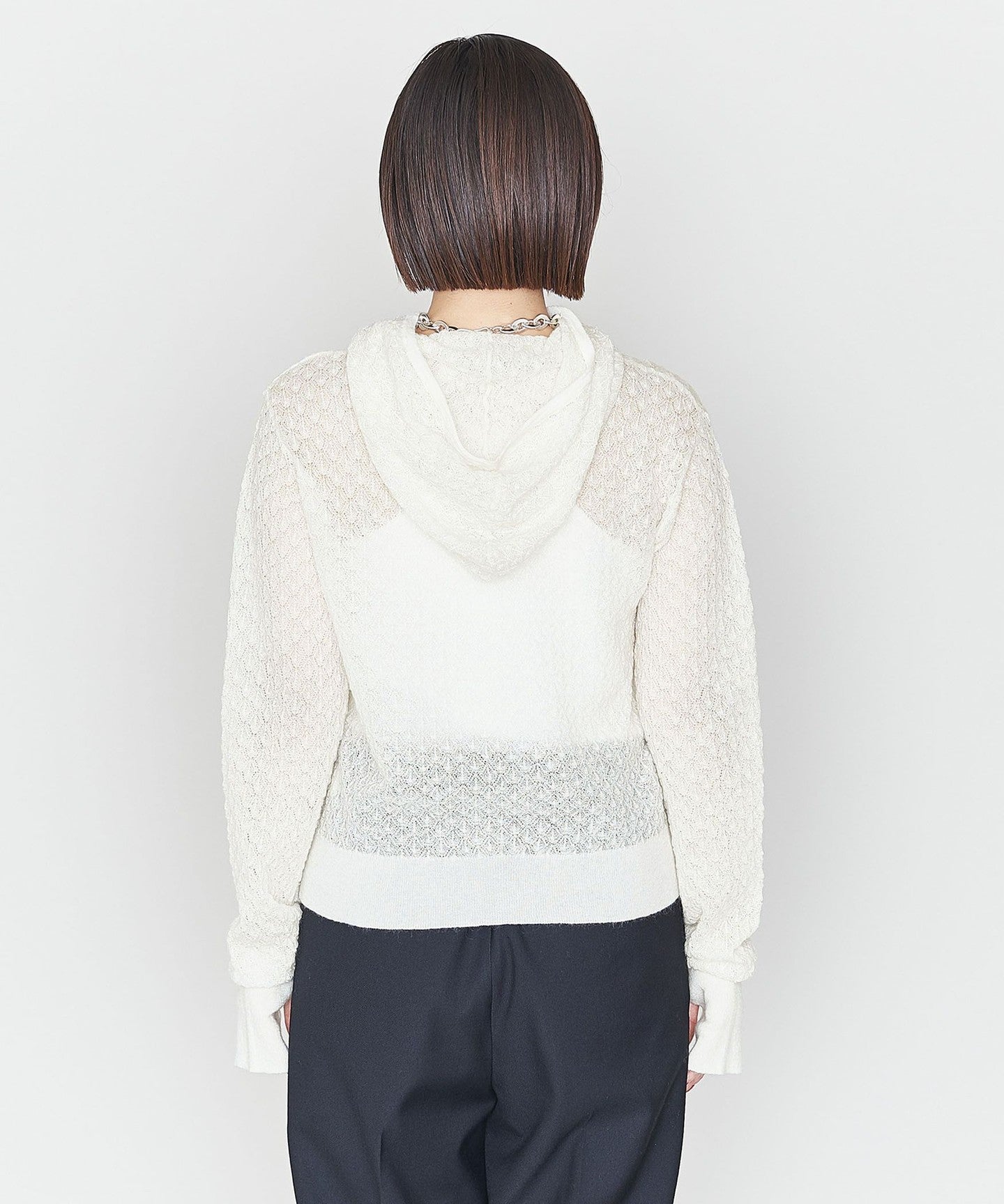 A hooded knit pullover with a light and thin knit that resembles eyelet lace.