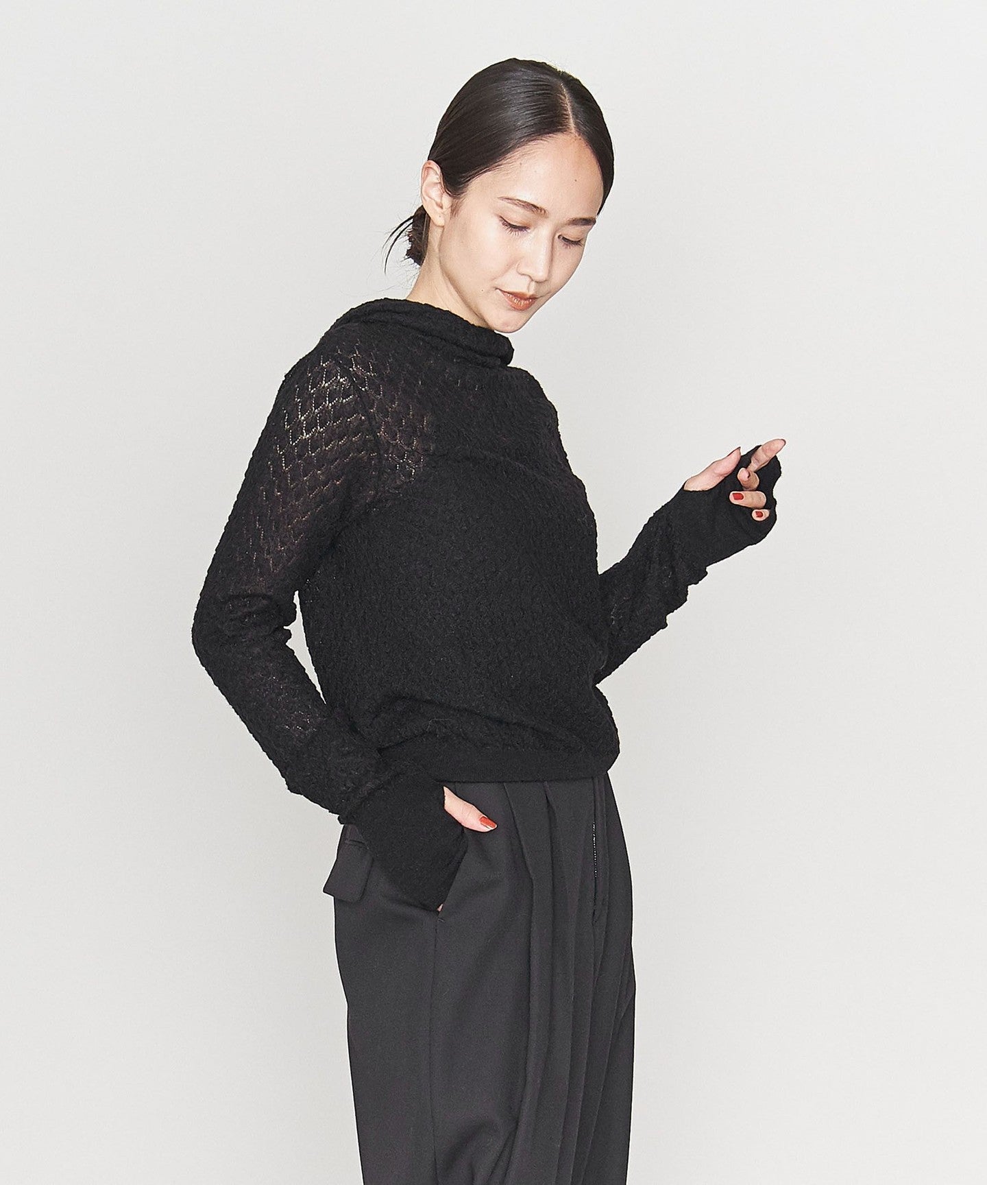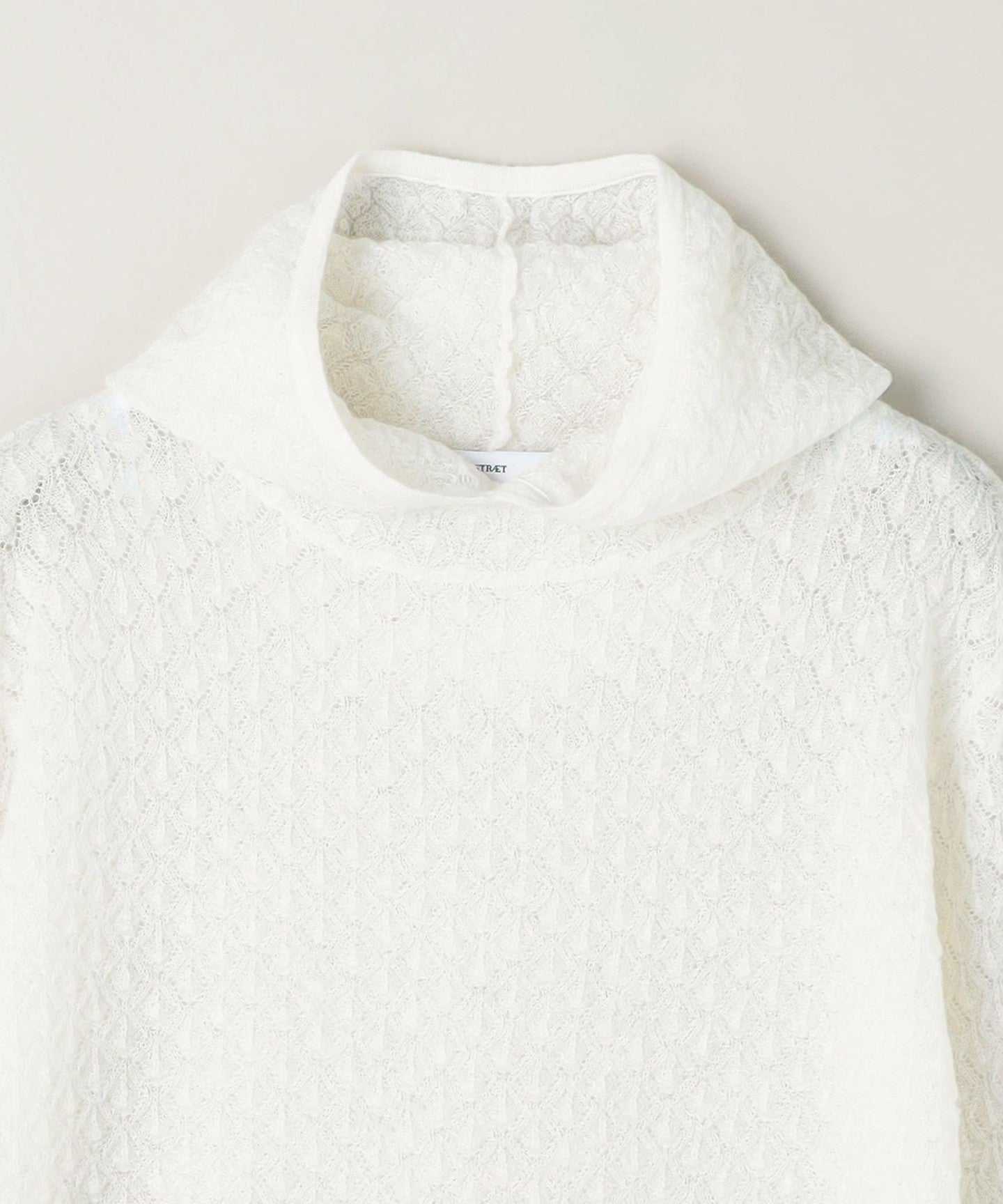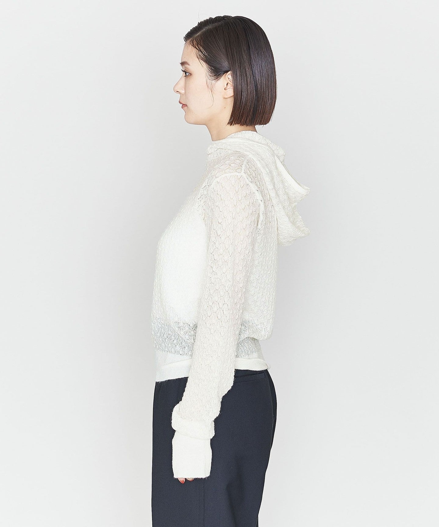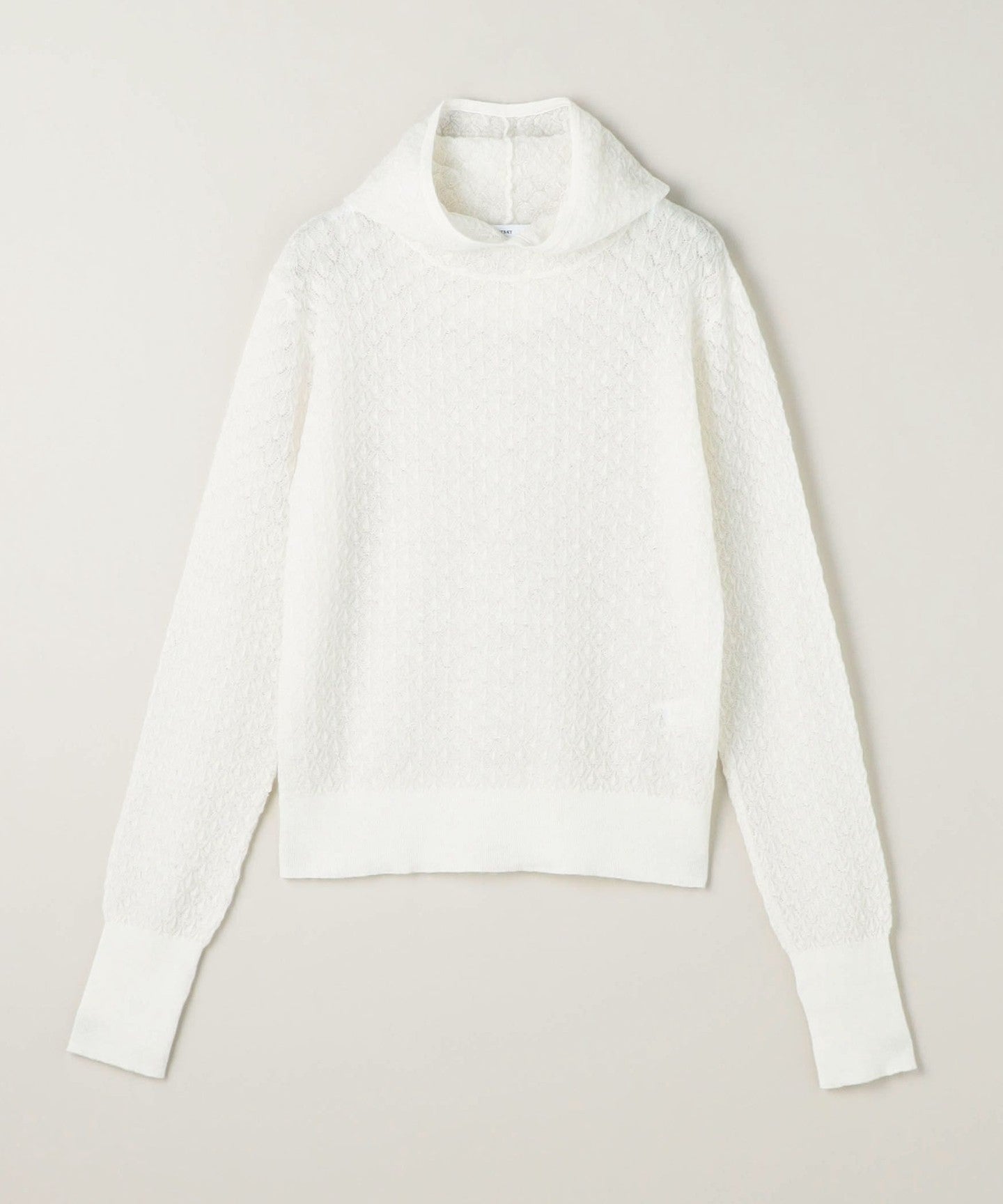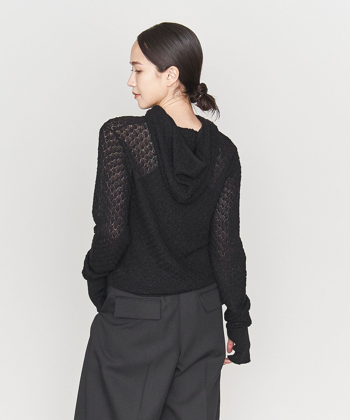 A hooded knit pullover with a light and thin knit that resembles eyelet lace.