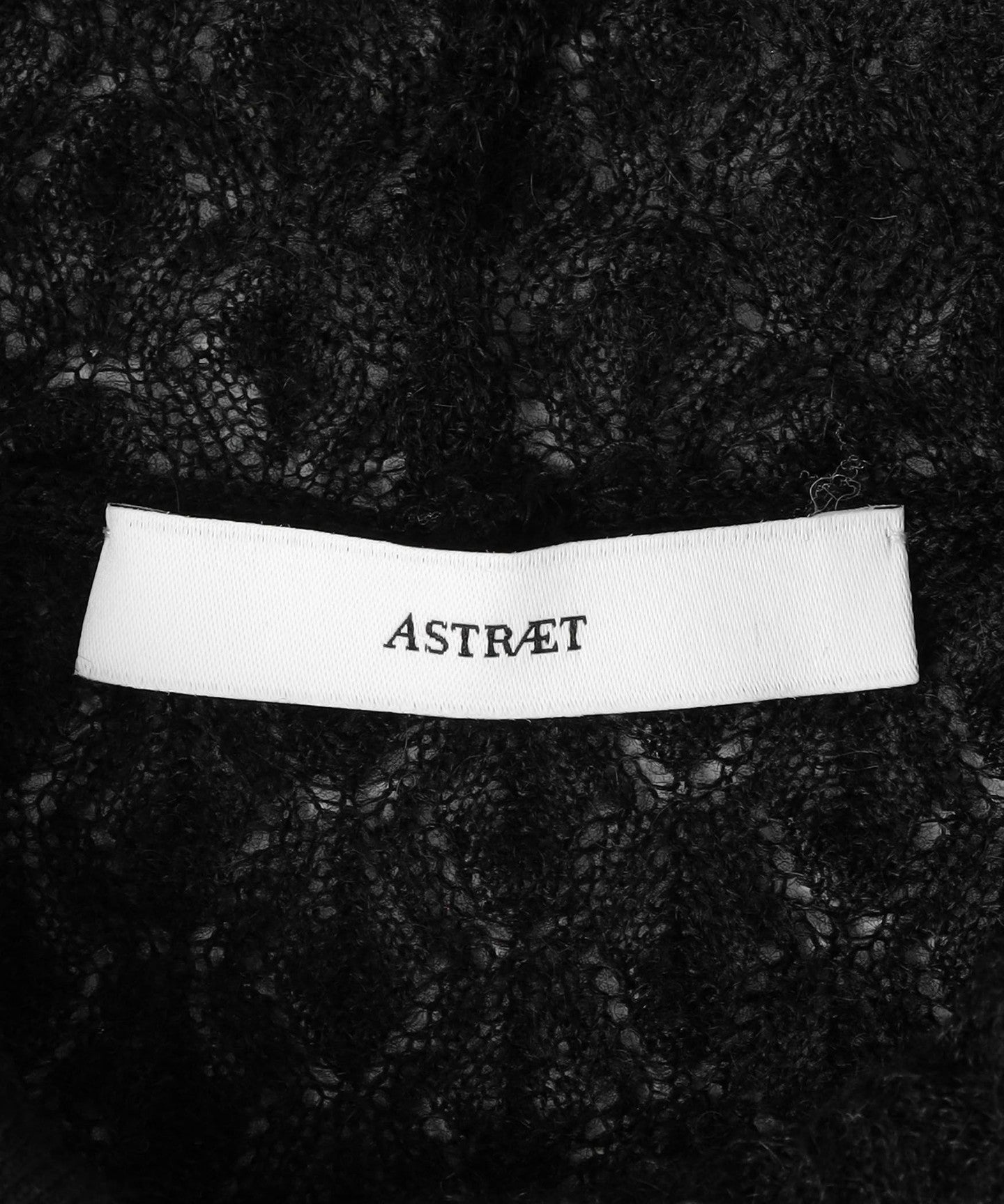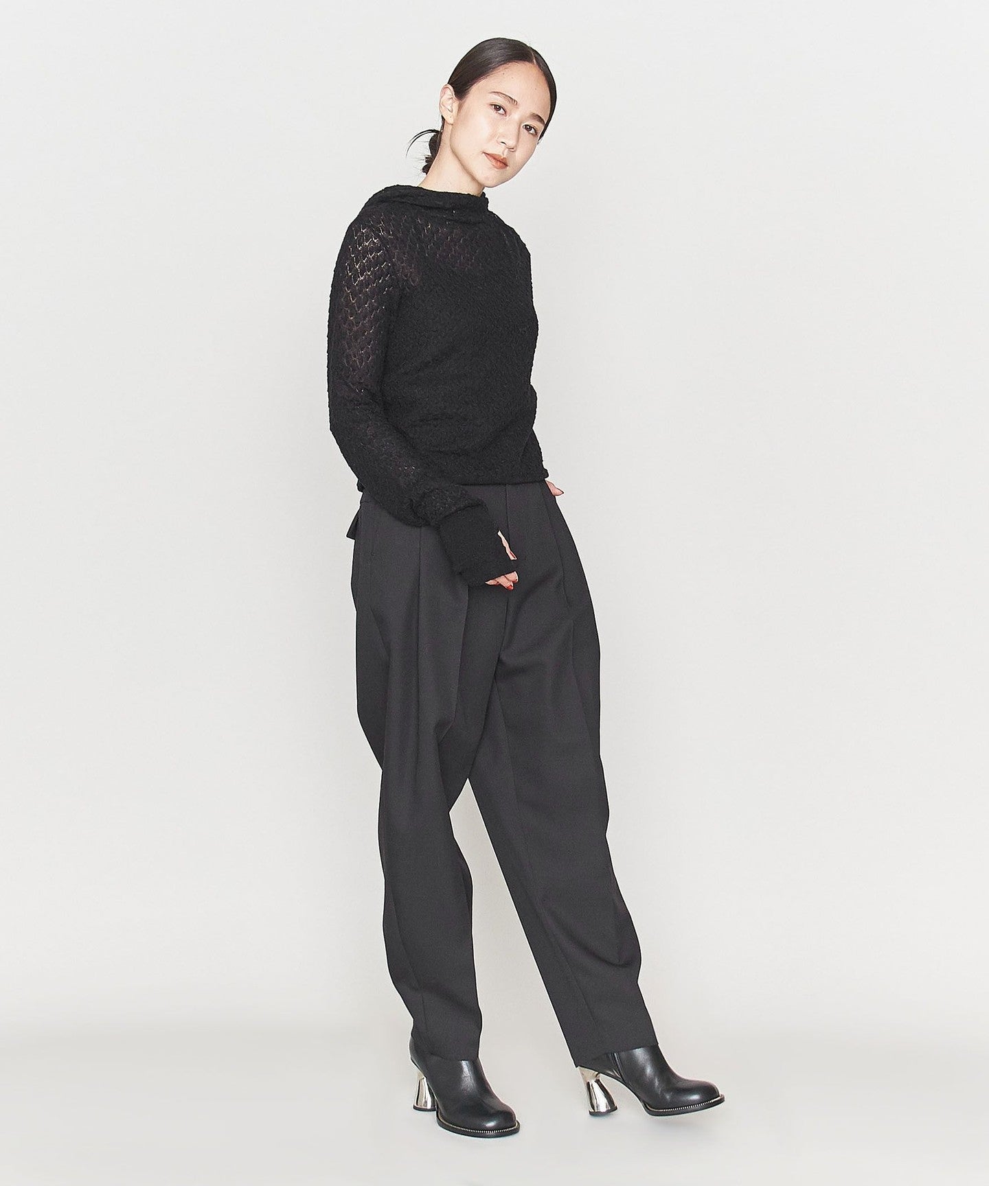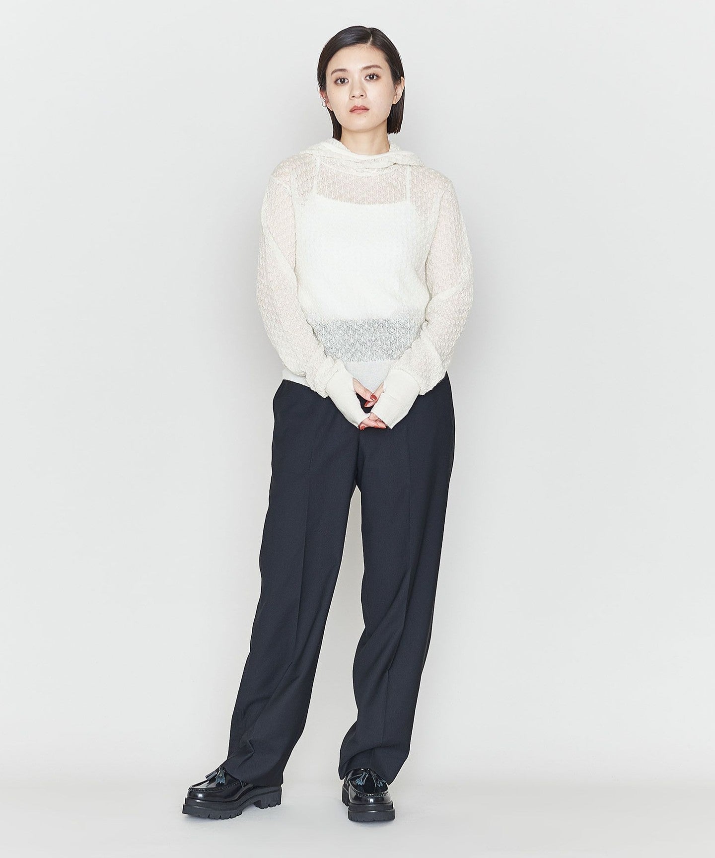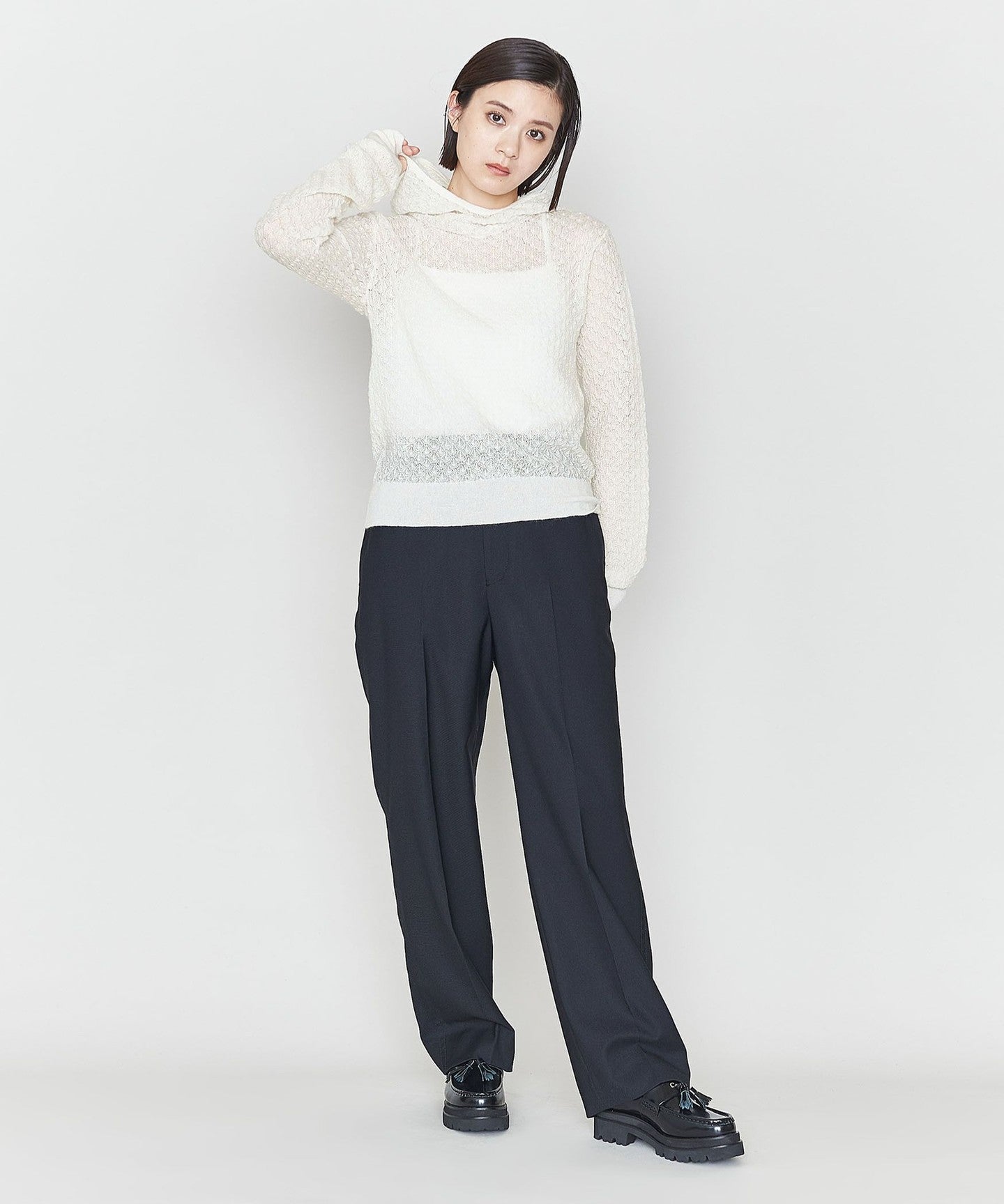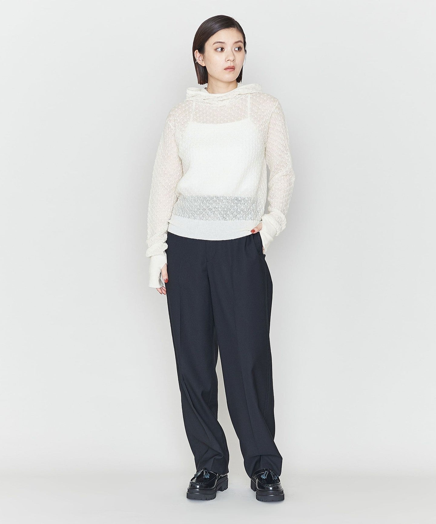 A hooded knit pullover with a light and thin knit that resembles eyelet lace.