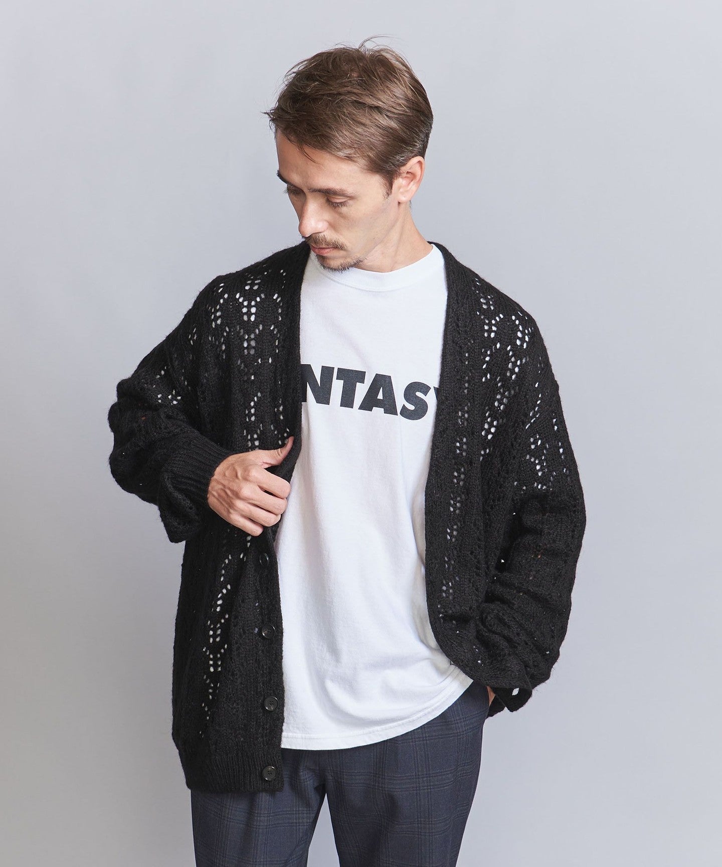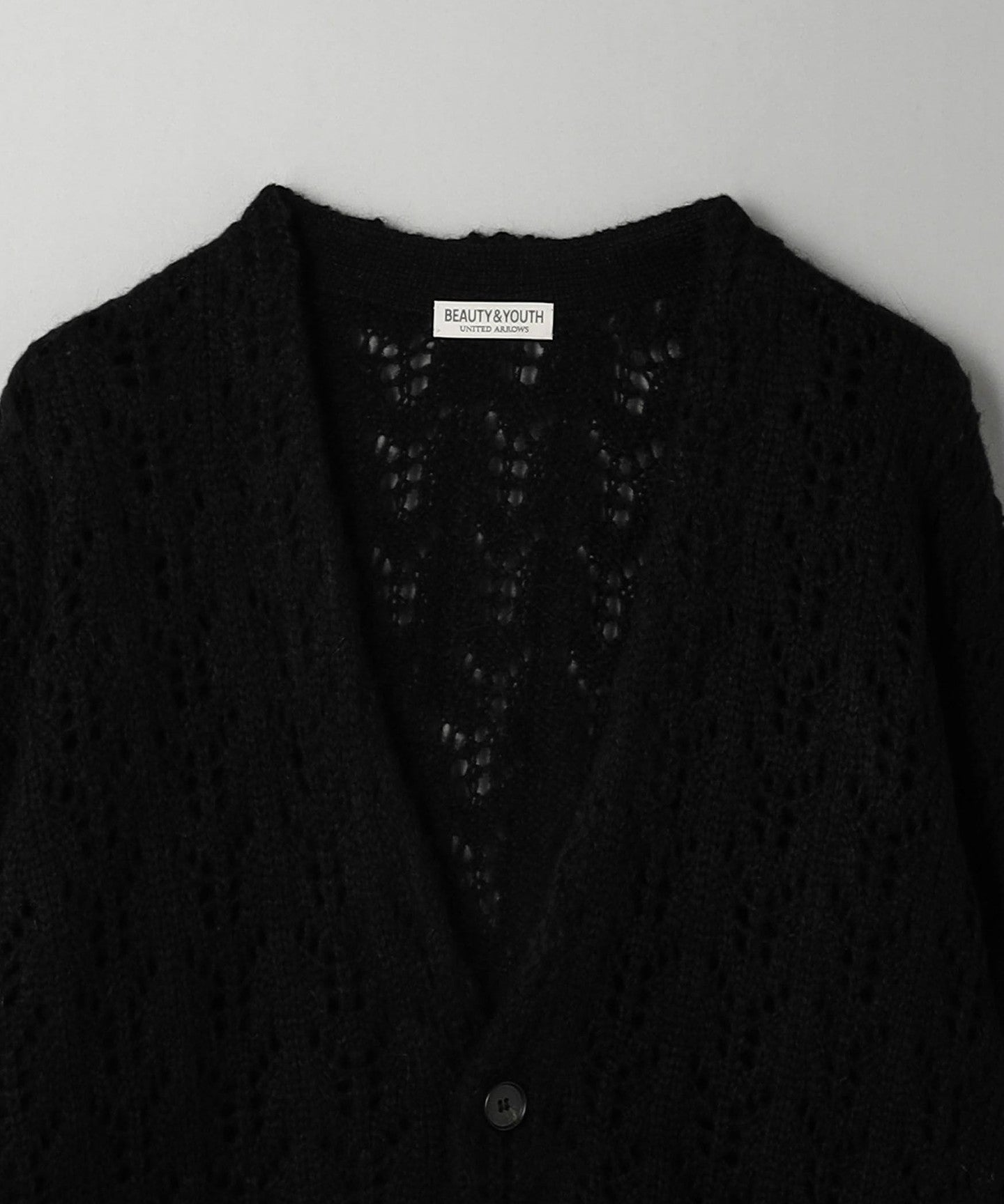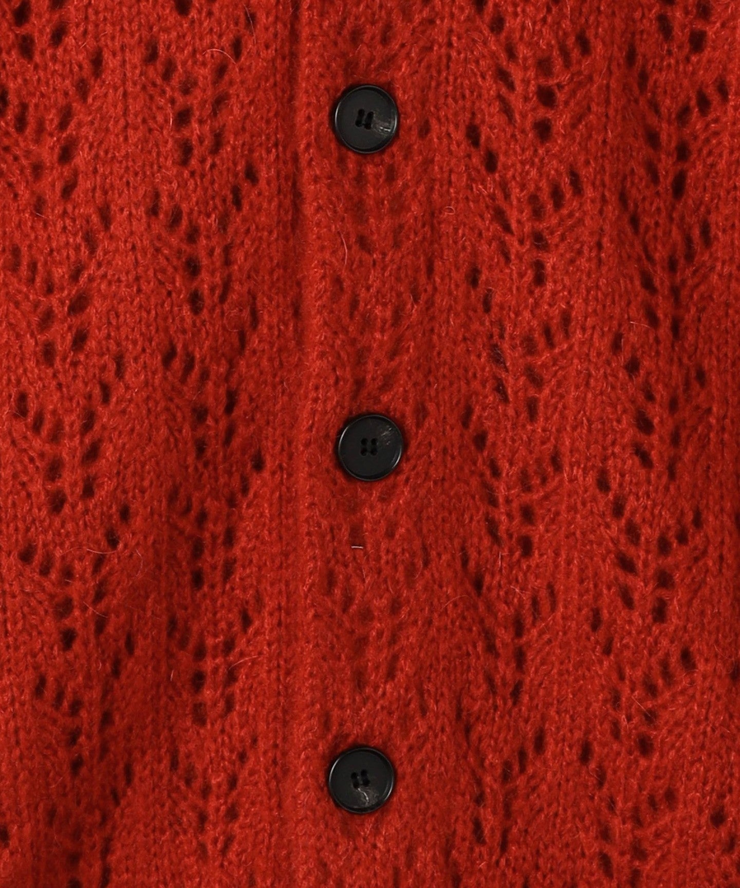 A V-neck cardigan with eye-catching leaf pattern openwork knitting that exudes the mood of the autumn/winter seasons.