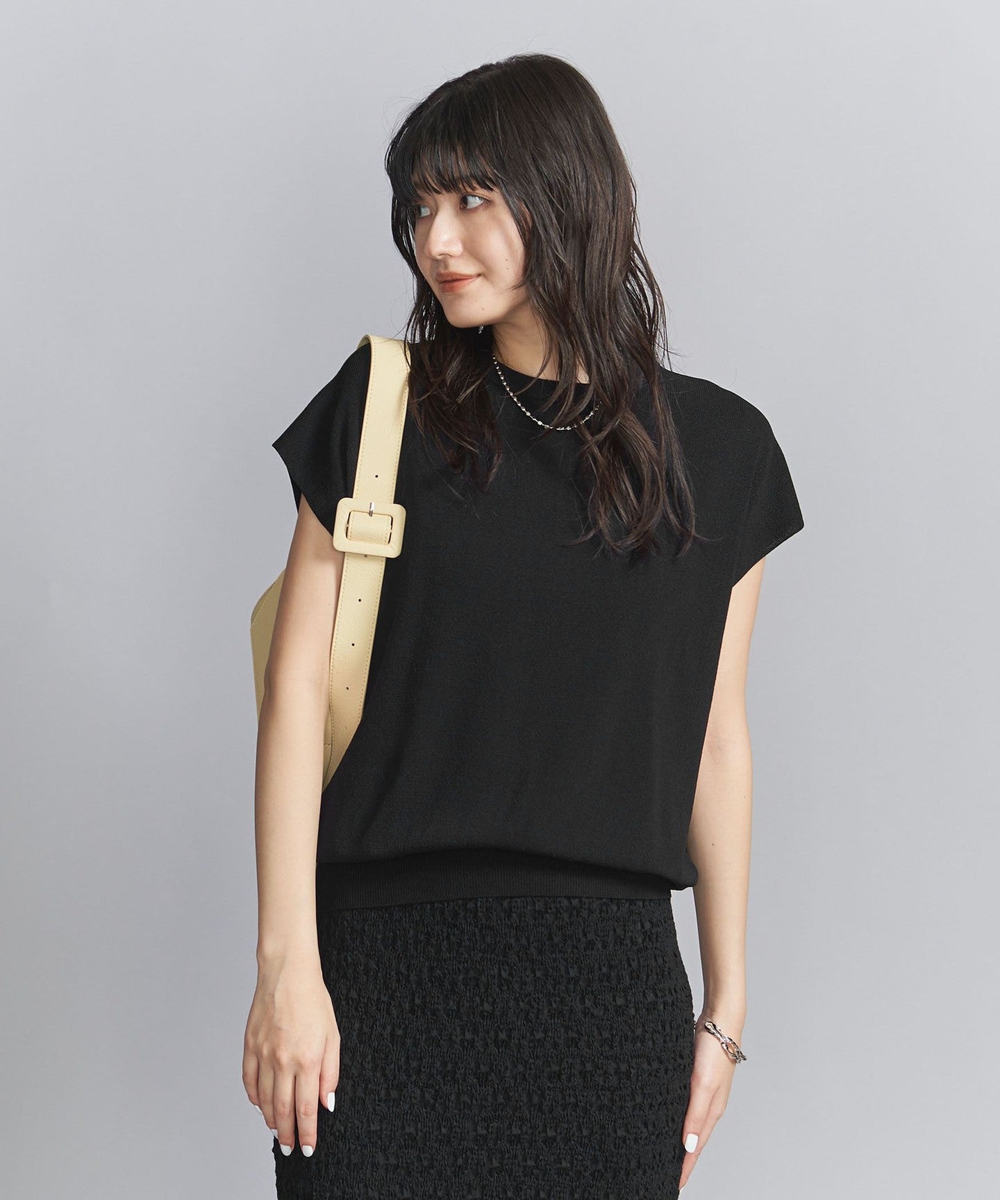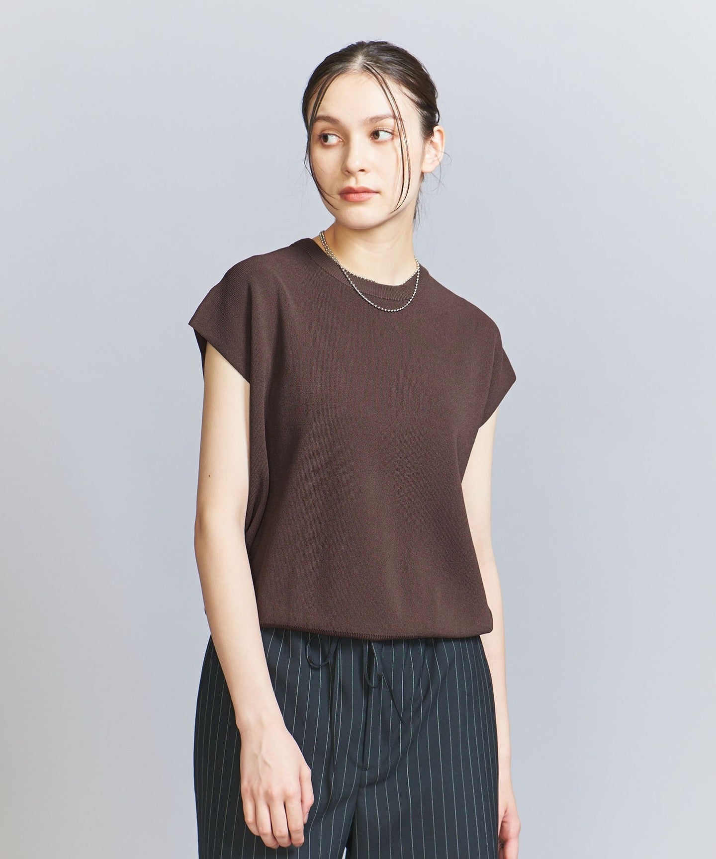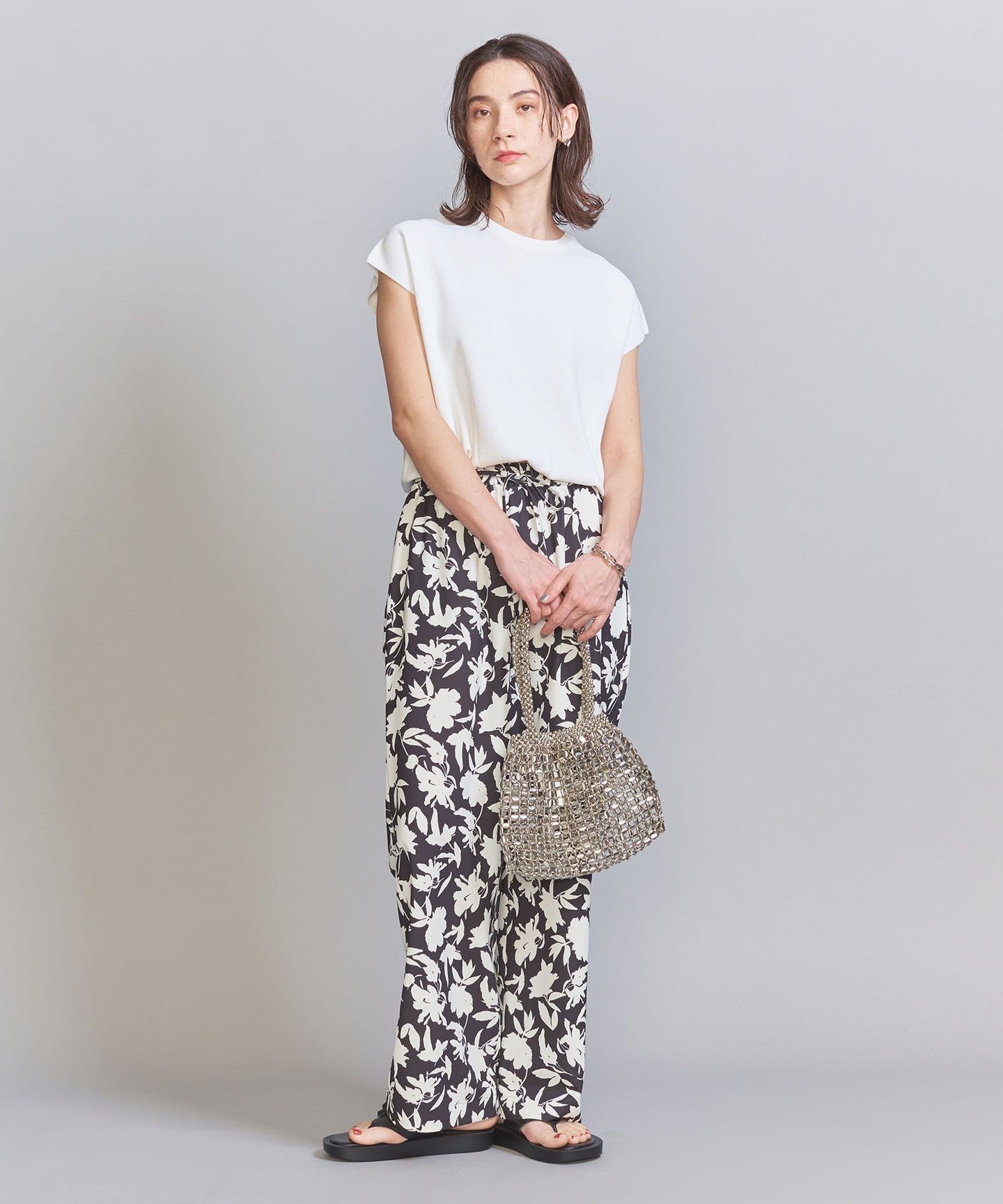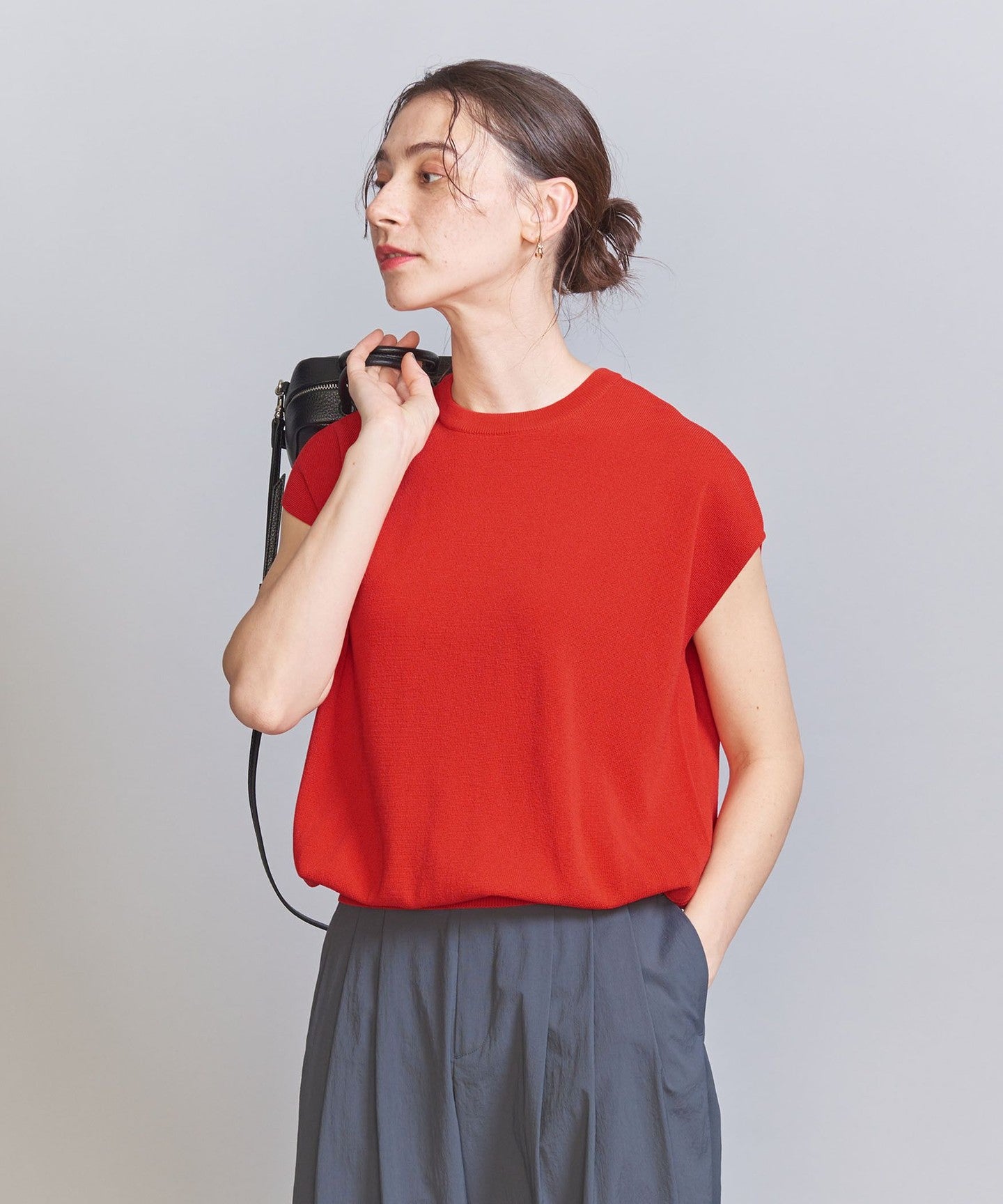 It goes well with a wide range of items, from voluminous pants to patterned bottoms and neat I-line skirts.